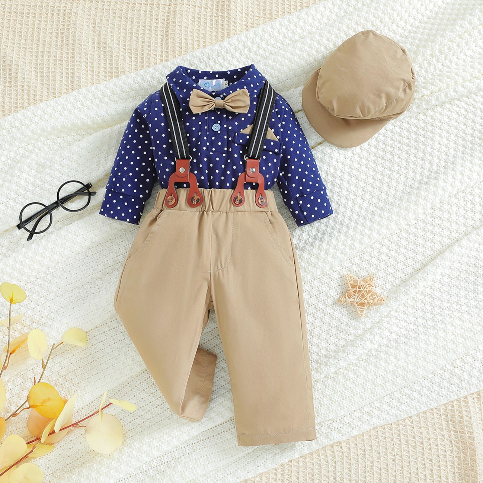0-18M Autumn Baby Boys Gentleman Clothes Sets 3pcs Long Sleeve Polka Dots Print Shirt + Suspender Pants + HaT