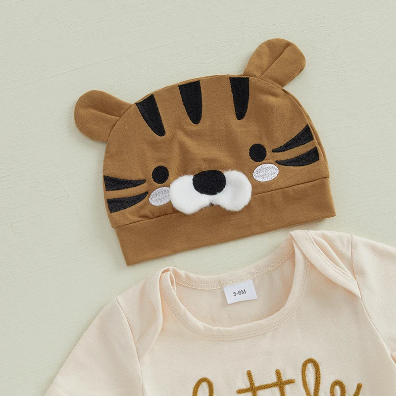 Baby Summer Clothes Letter Embroidery Short Sleeve Romper with Solid Pants and Hat 3 Pcs Set