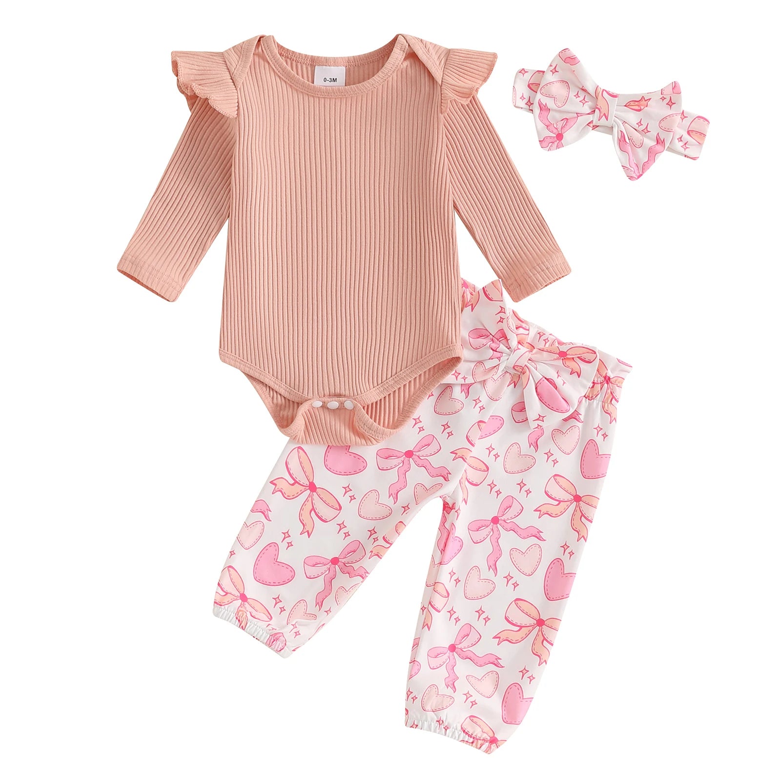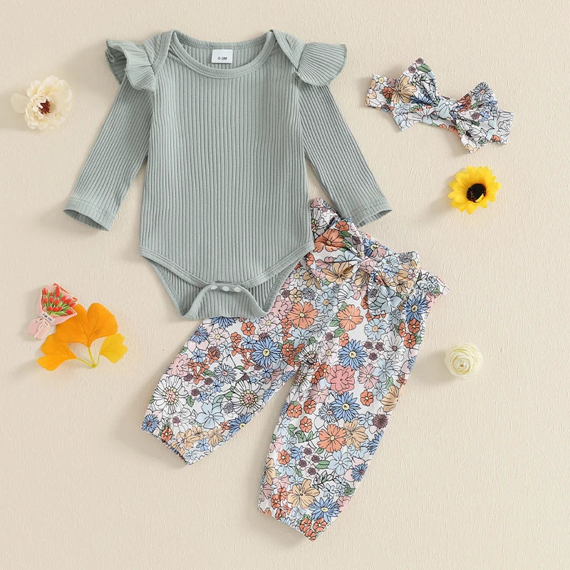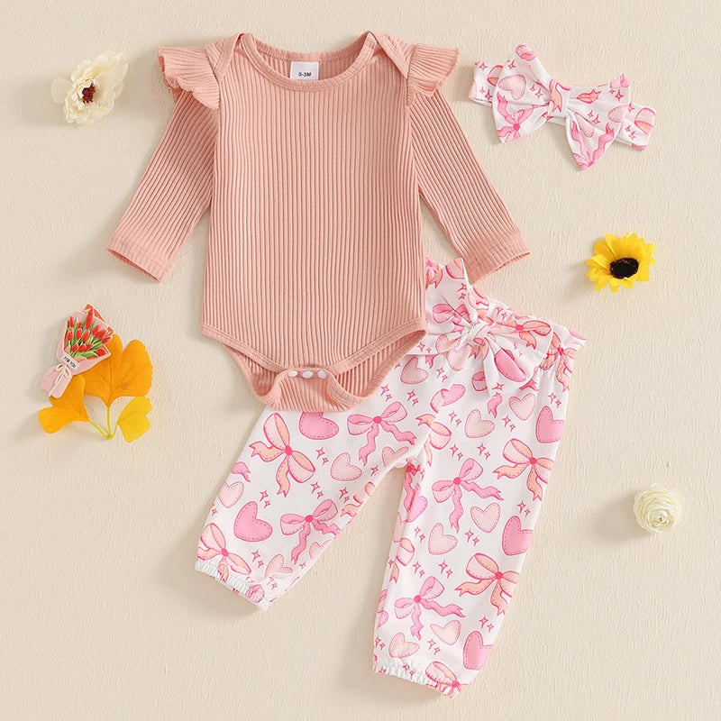 Baby Girls Fall Outfits Long Sleeve Ribbed Romper + Bow Front Pants + Headband Set Newborn Clothes