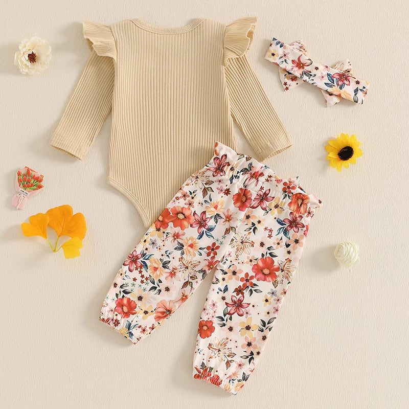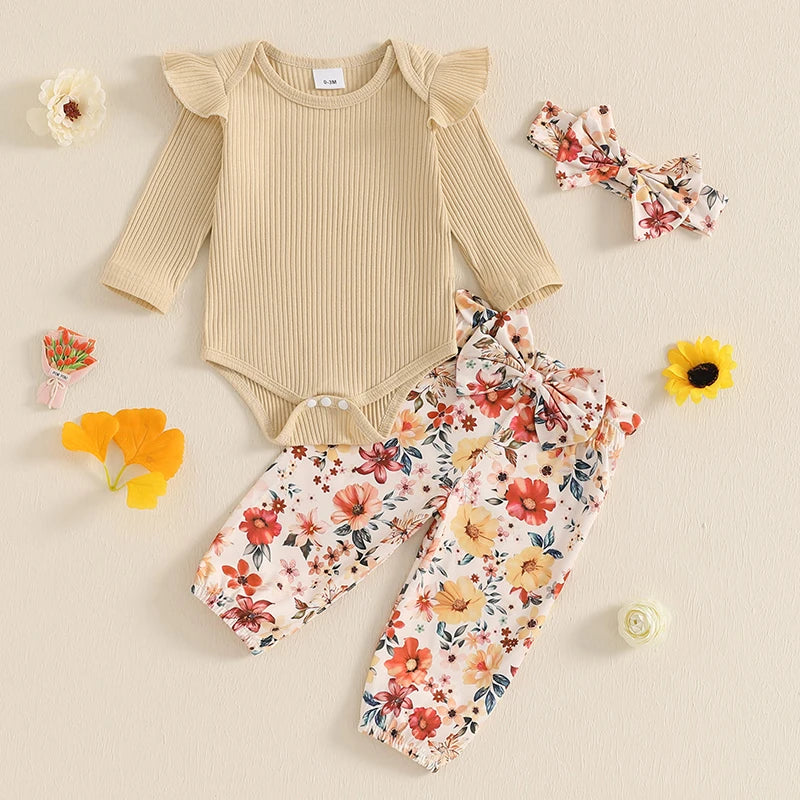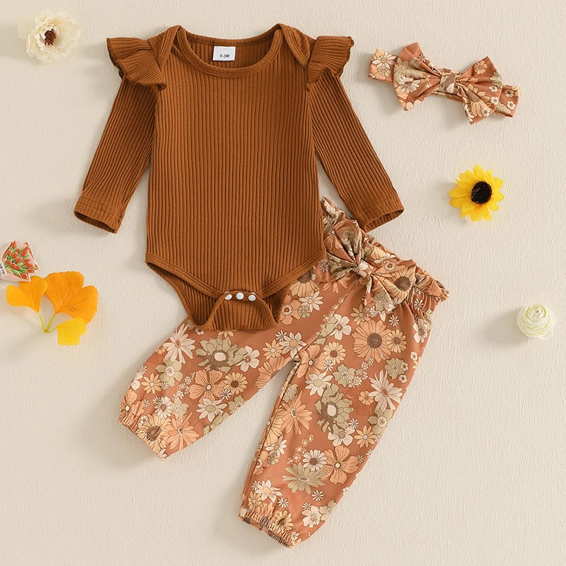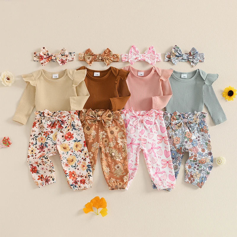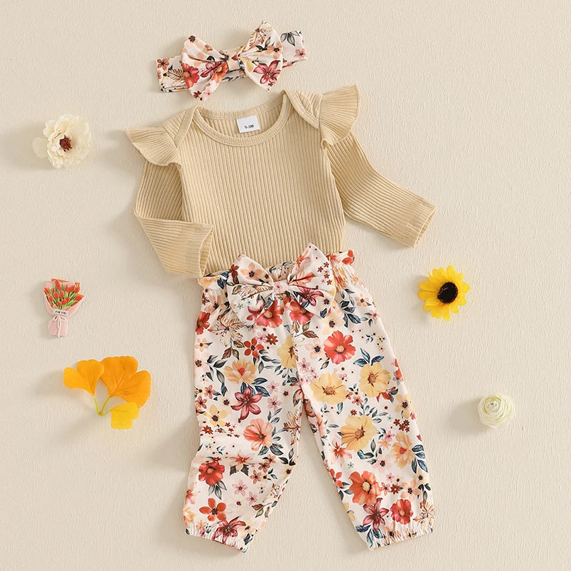 0-18M Baby Girls Fall Clothes Sets 3pcs Long Sleeve Ribbed Romper and Bow Front Pants and Headband