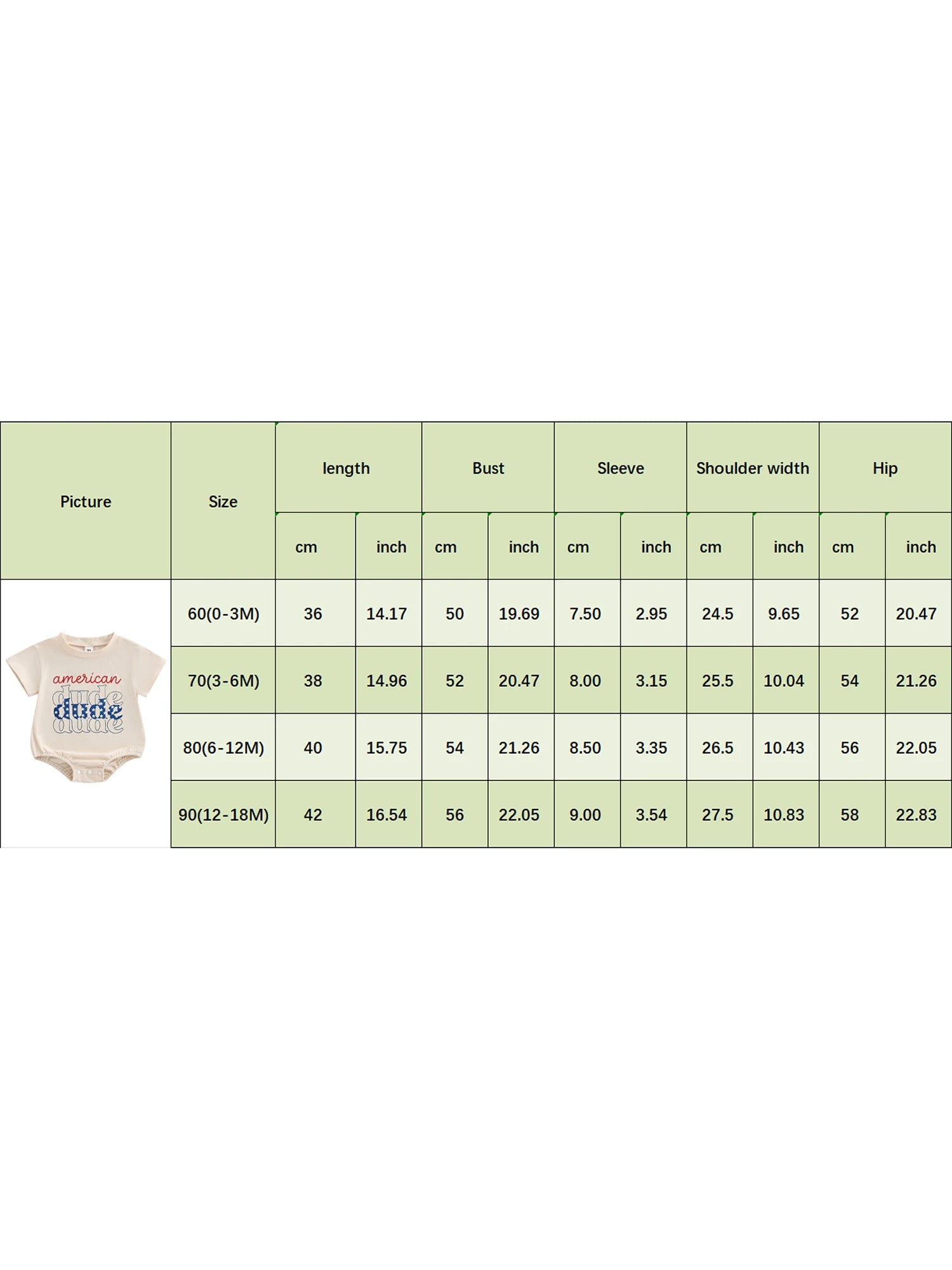 60 Length: 14.17 Bust: 19.68 Sleeve: 2.95 Shoulder: 9.65 Hip: 20.47 Suggest Age: 0-3 Months