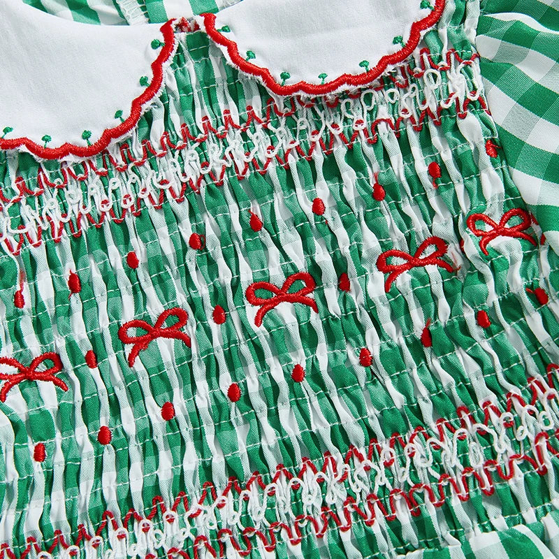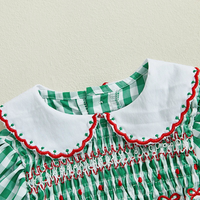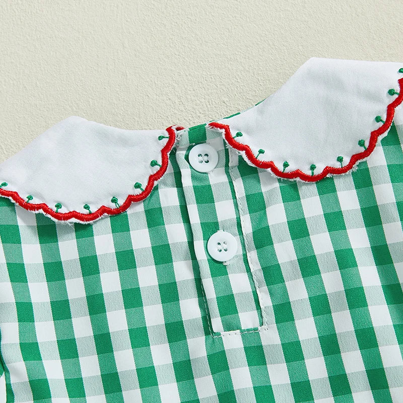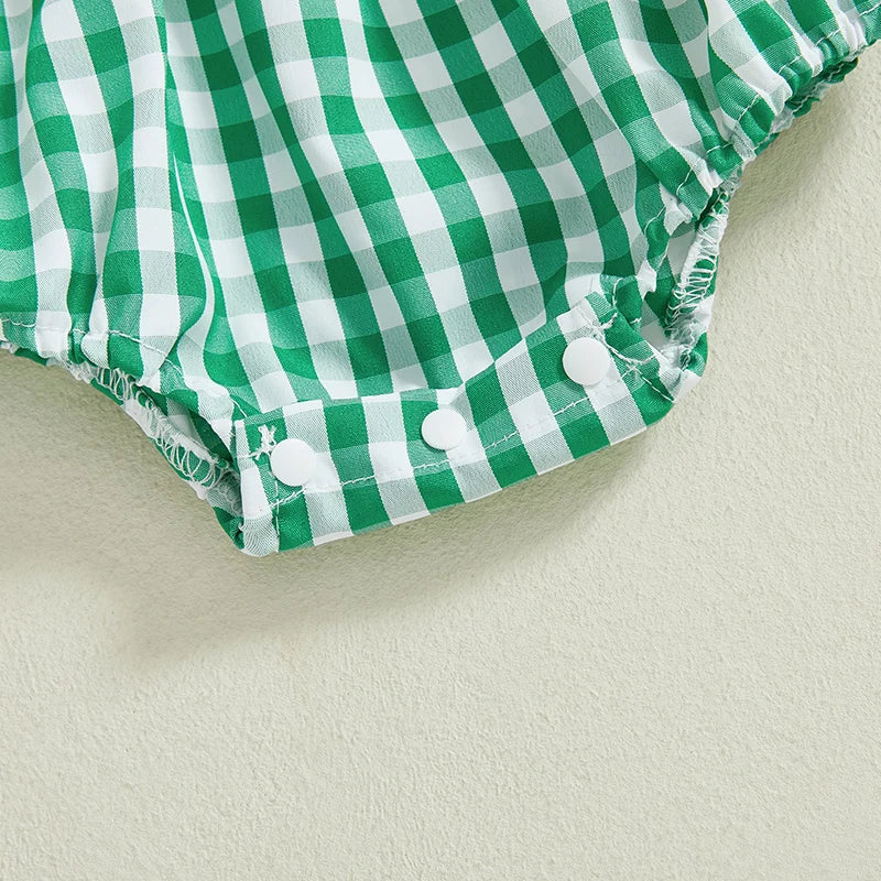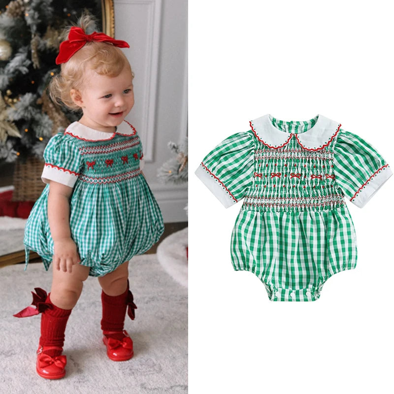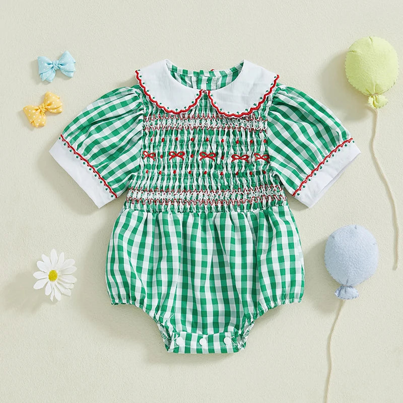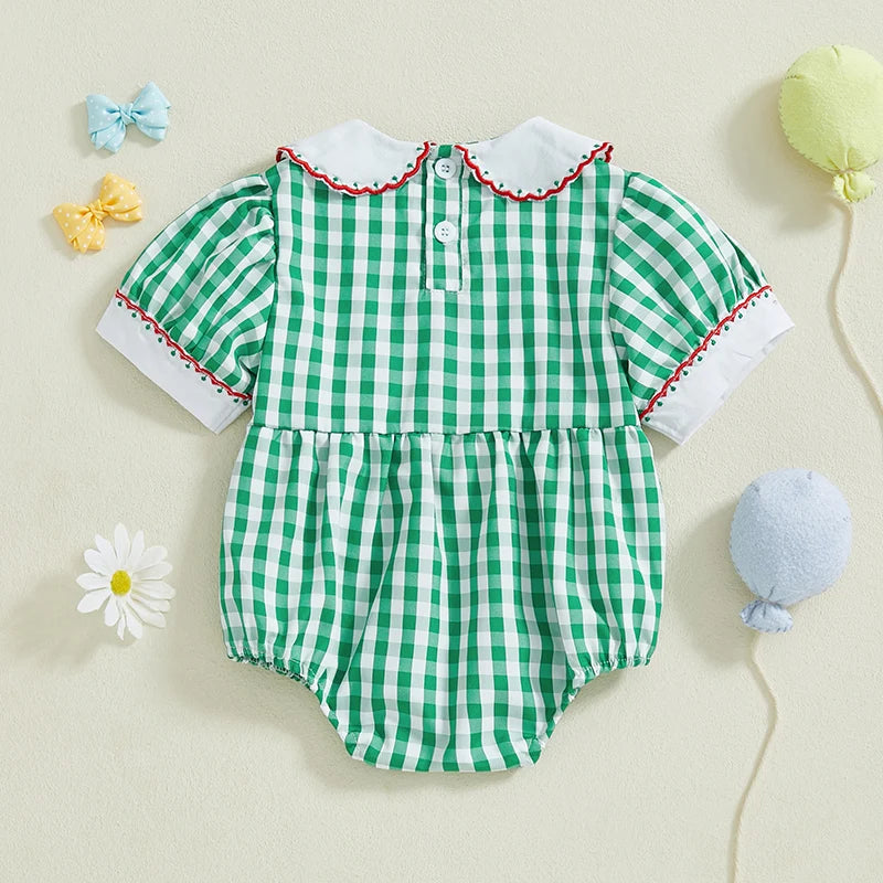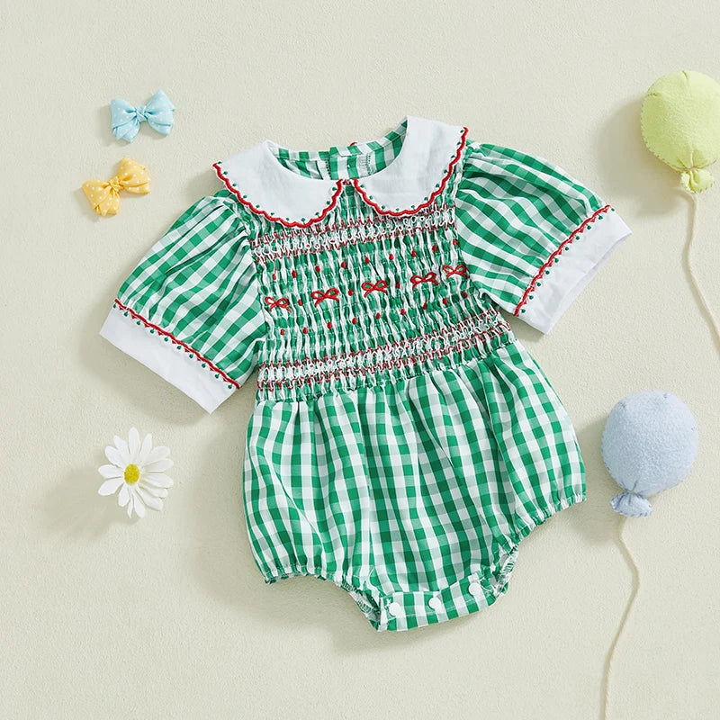 Baby Girls Plaid Romper, Short Sleeve Doll Collar Embroidery Bows Infant Bodysuit Summer Clothes