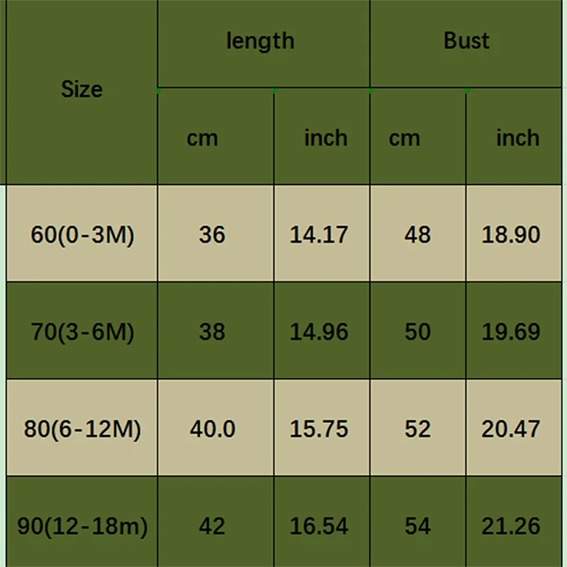60 Length: 14.17 Bust: 18.9 Suggest Age: 0-3 Months
