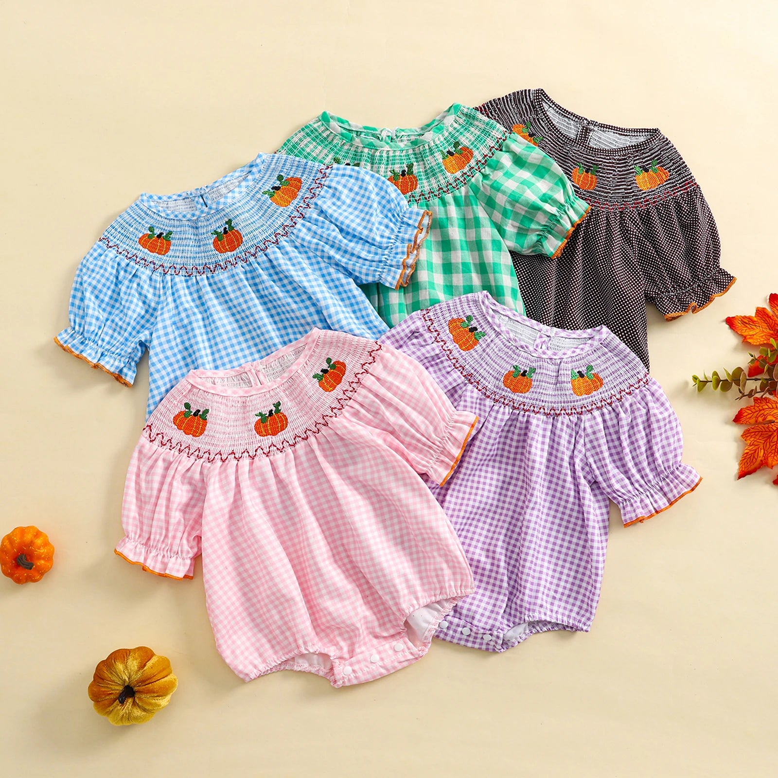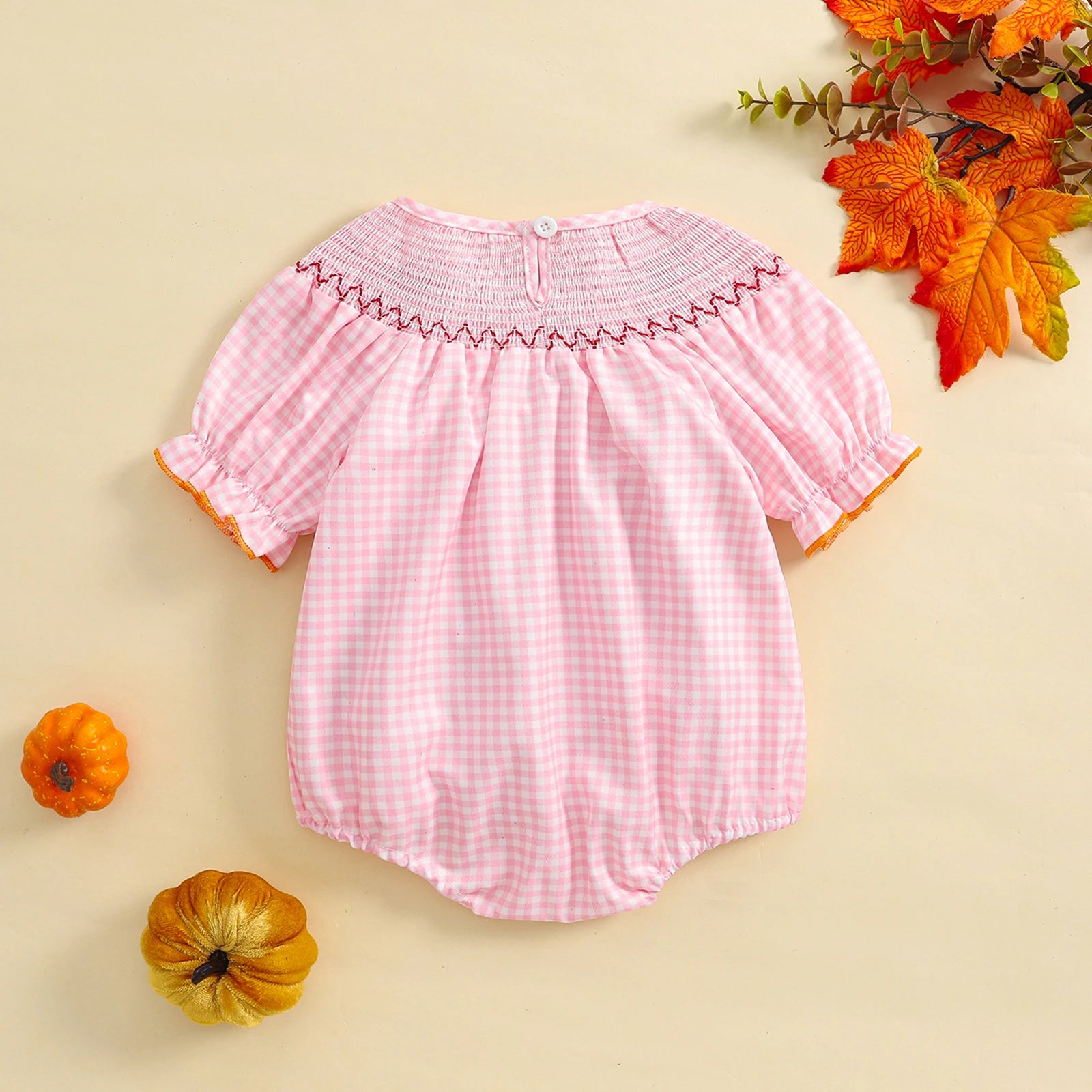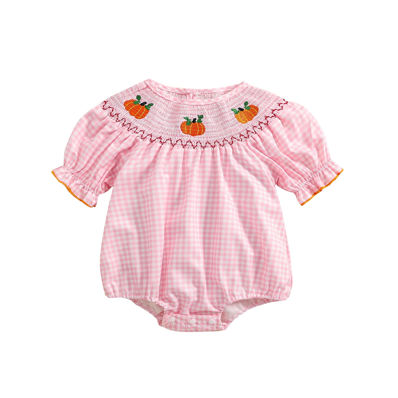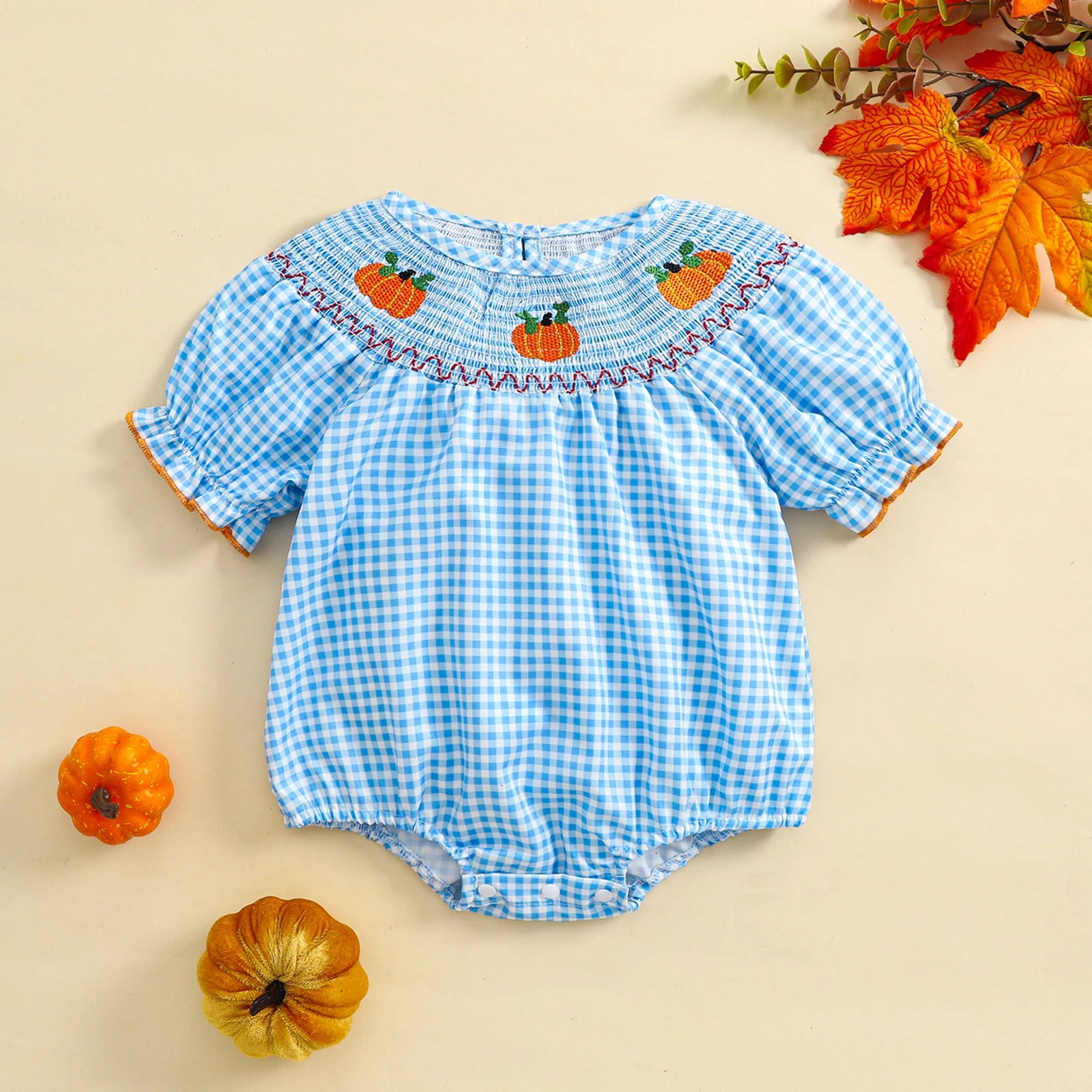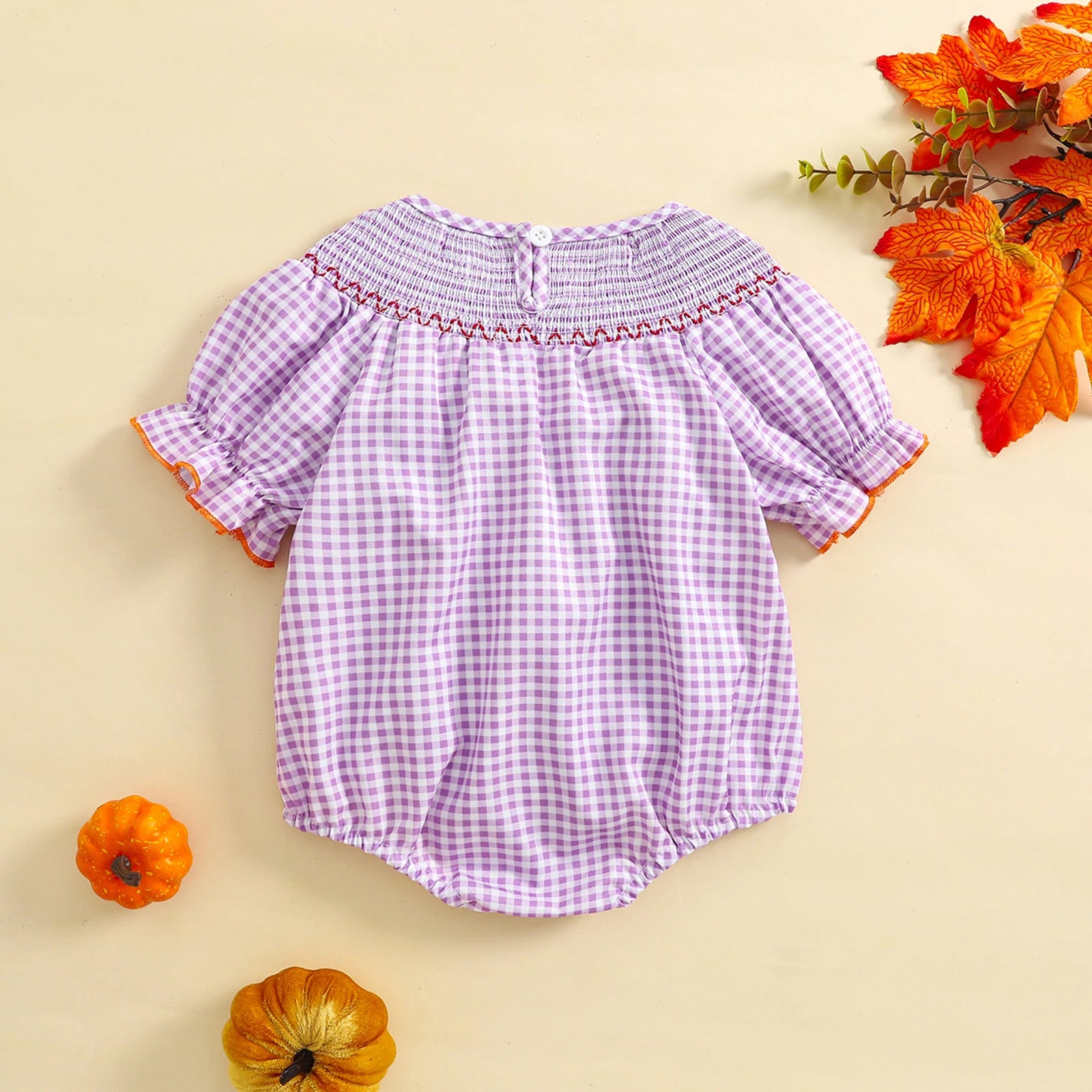 0-3Y Baby Girls Boys Romper Pumpkin Embroidered Plaid Print Short Sleeve Ruffled Jumpsuits