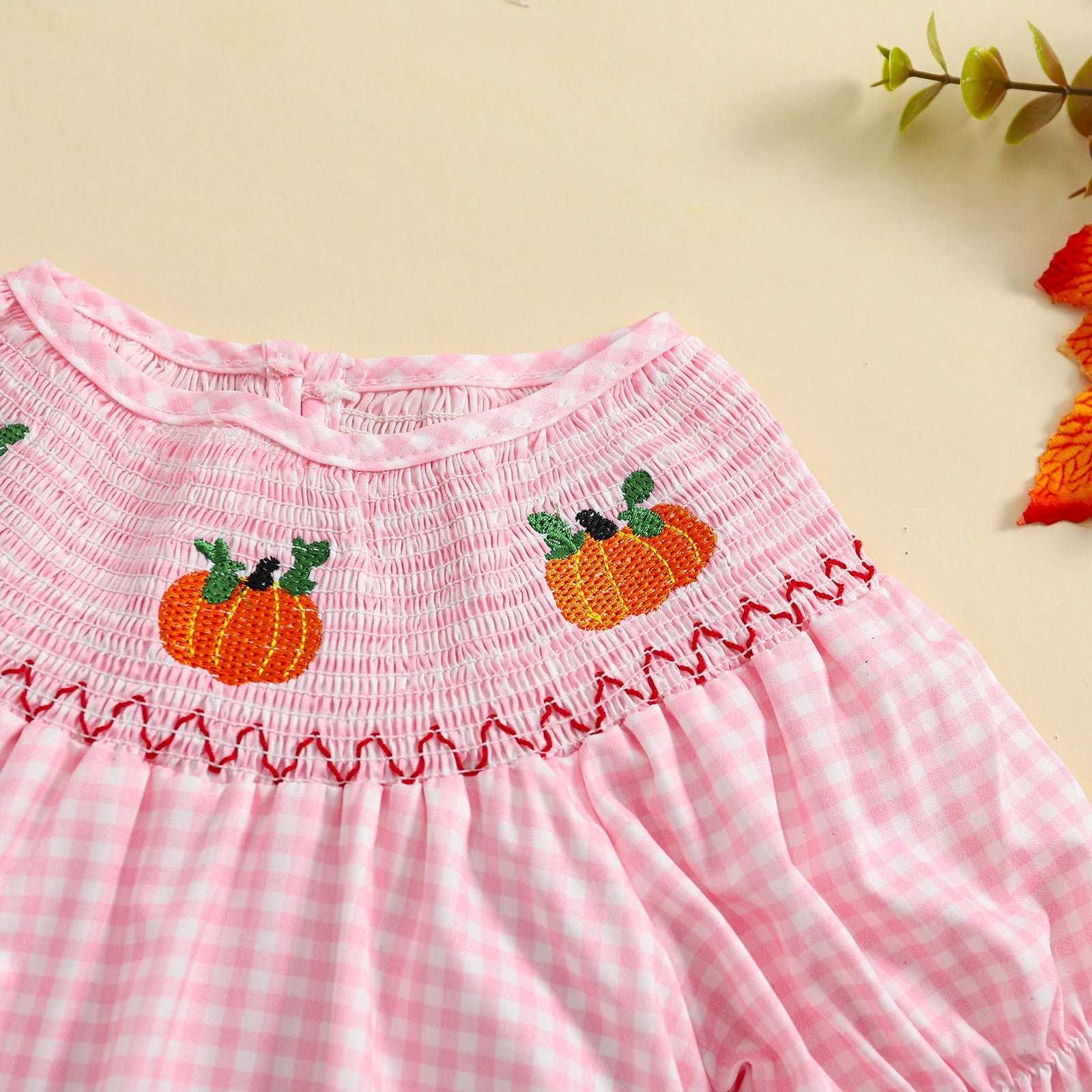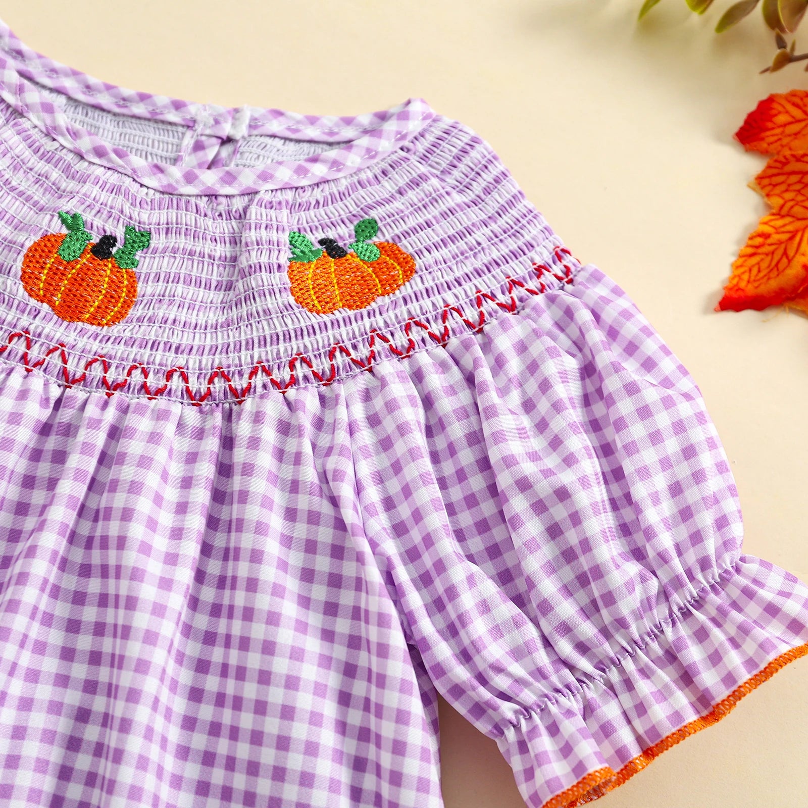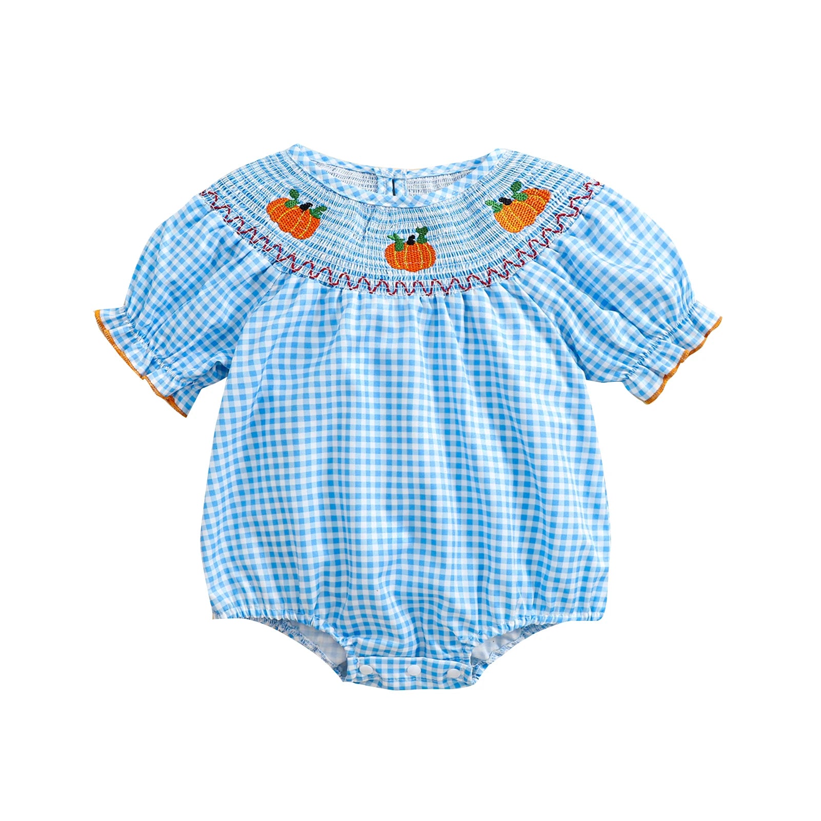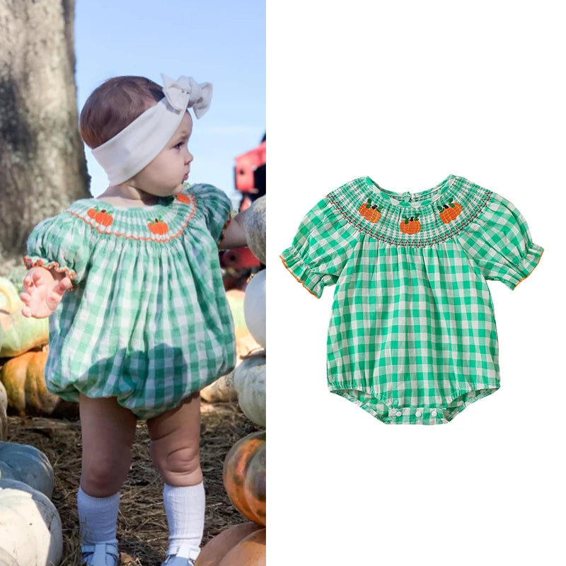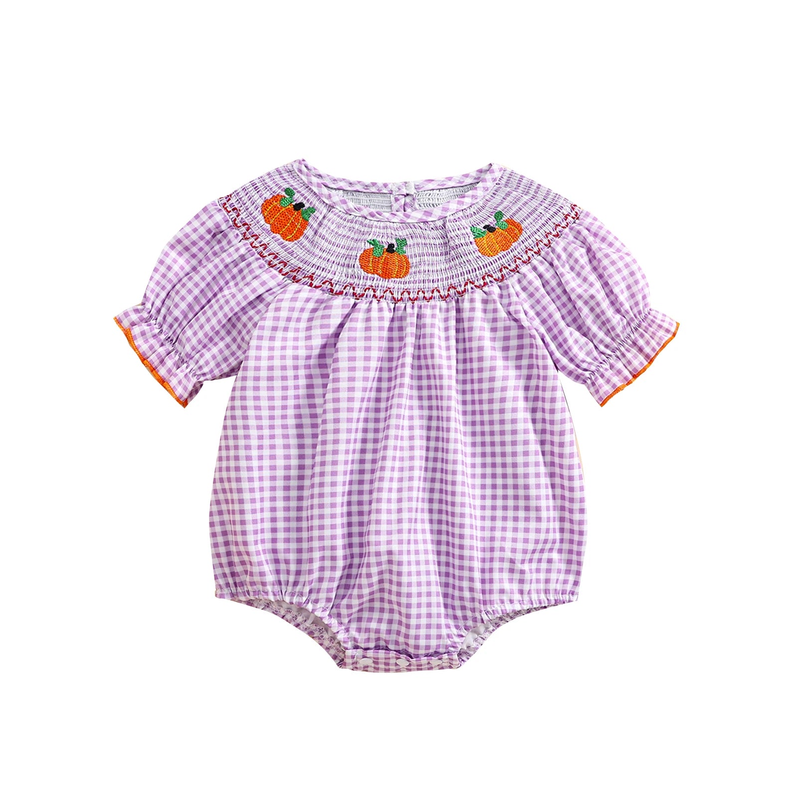 0-3Y Baby Girls Boys Romper Pumpkin Embroidered Plaid Print Short Sleeve Ruffled Jumpsuits