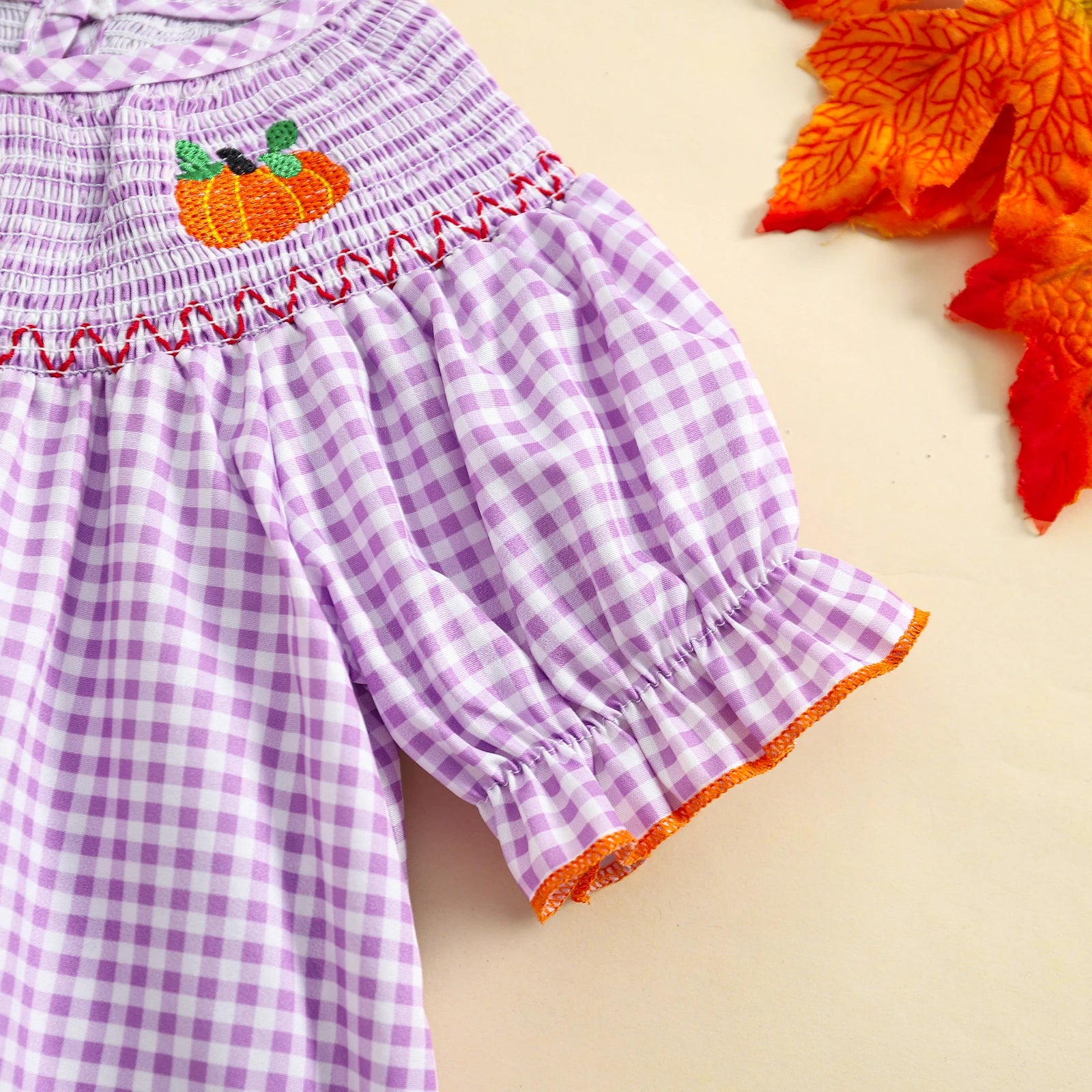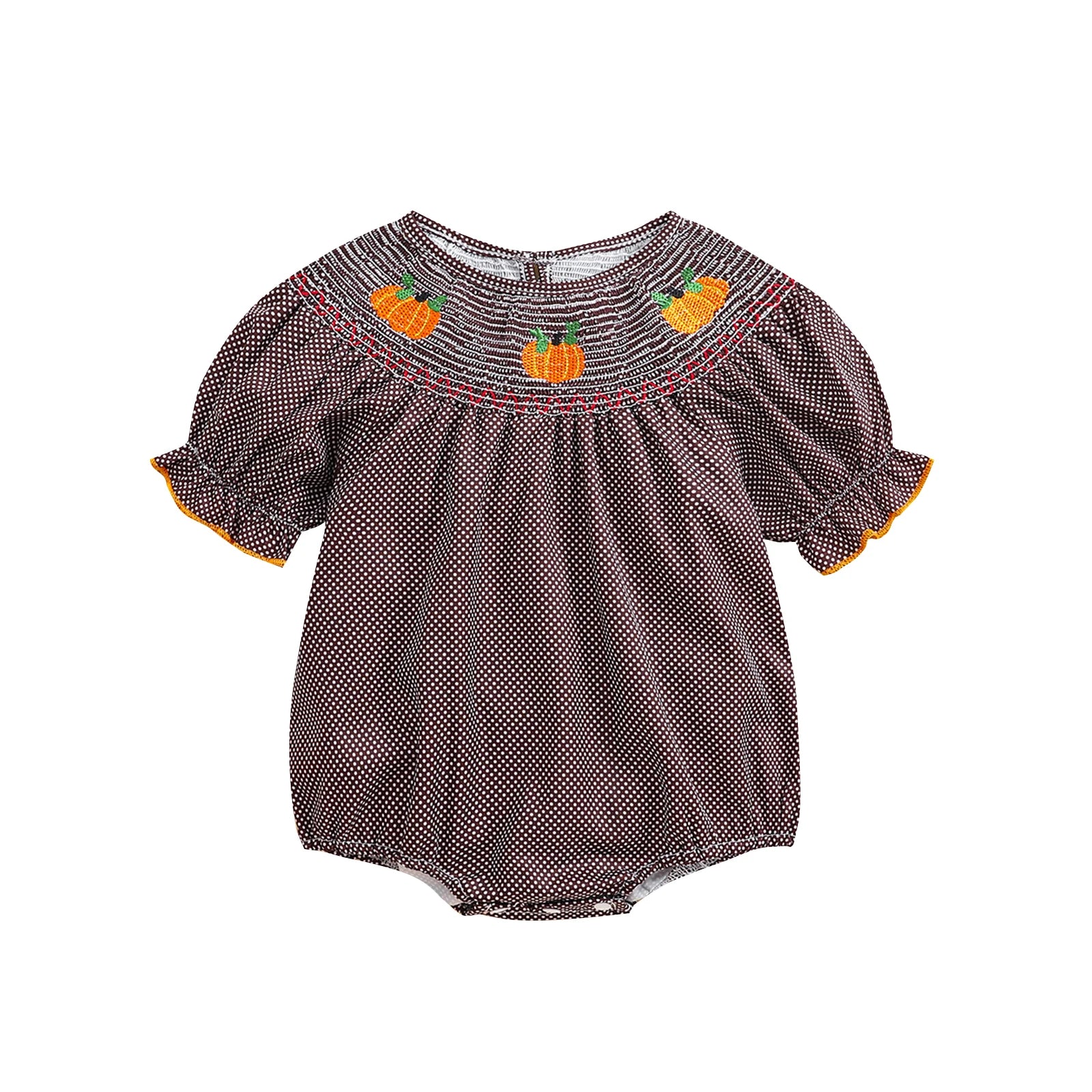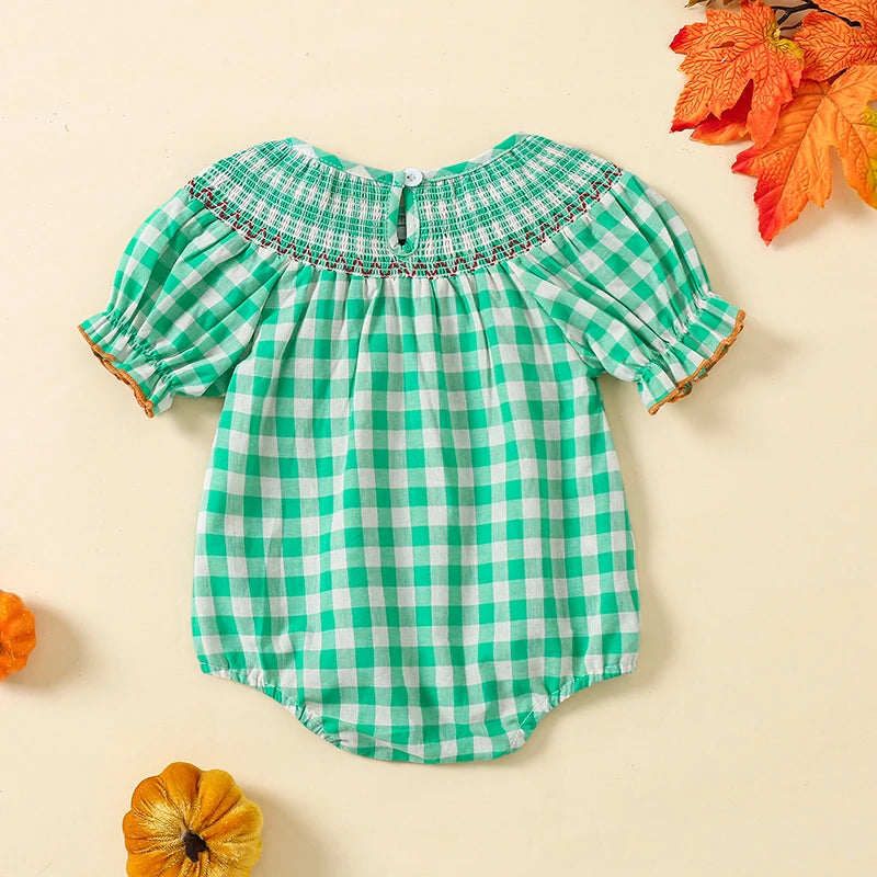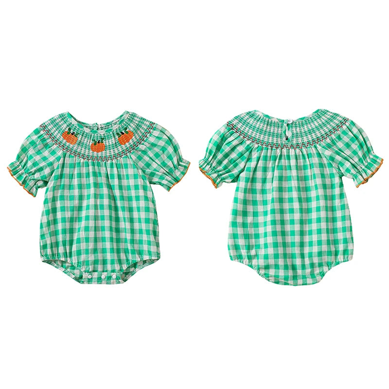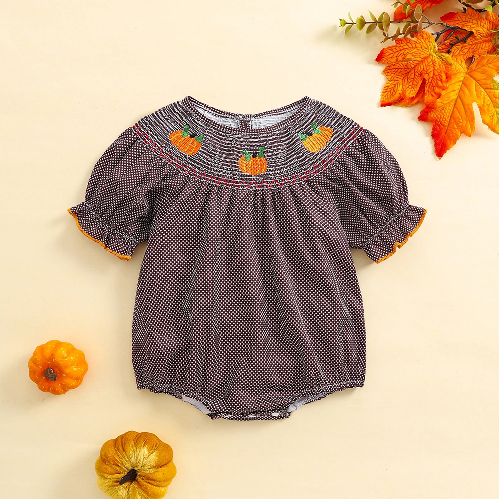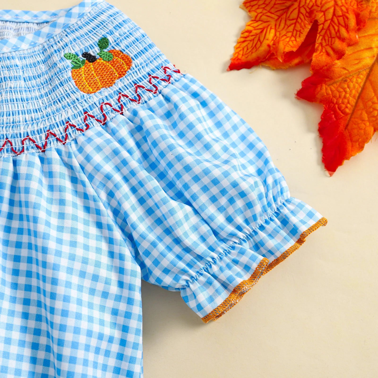 0-3Y Baby Girls Boys Romper Pumpkin Embroidered Plaid Print Short Sleeve Ruffled Jumpsuits