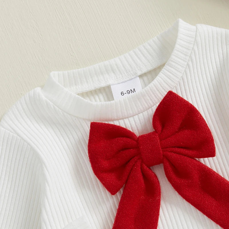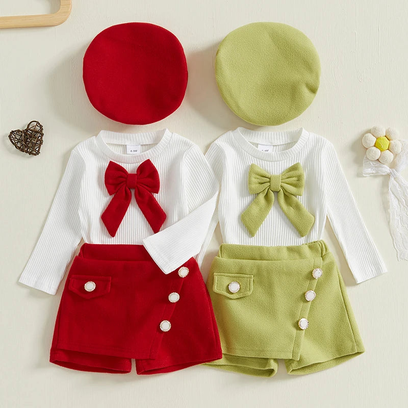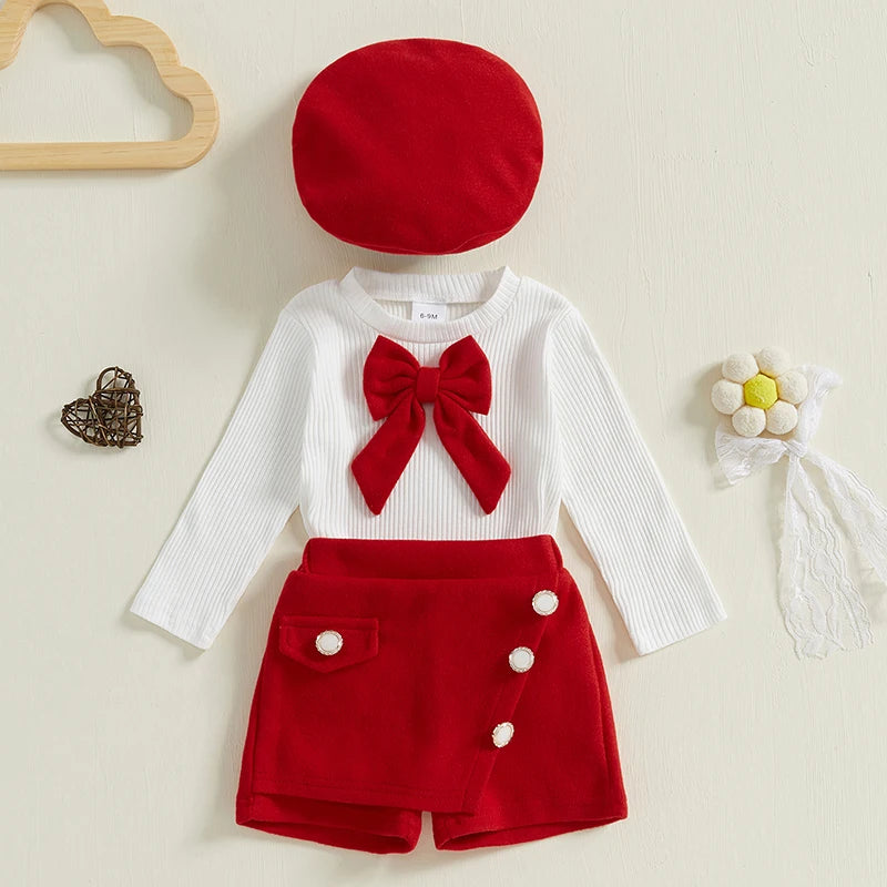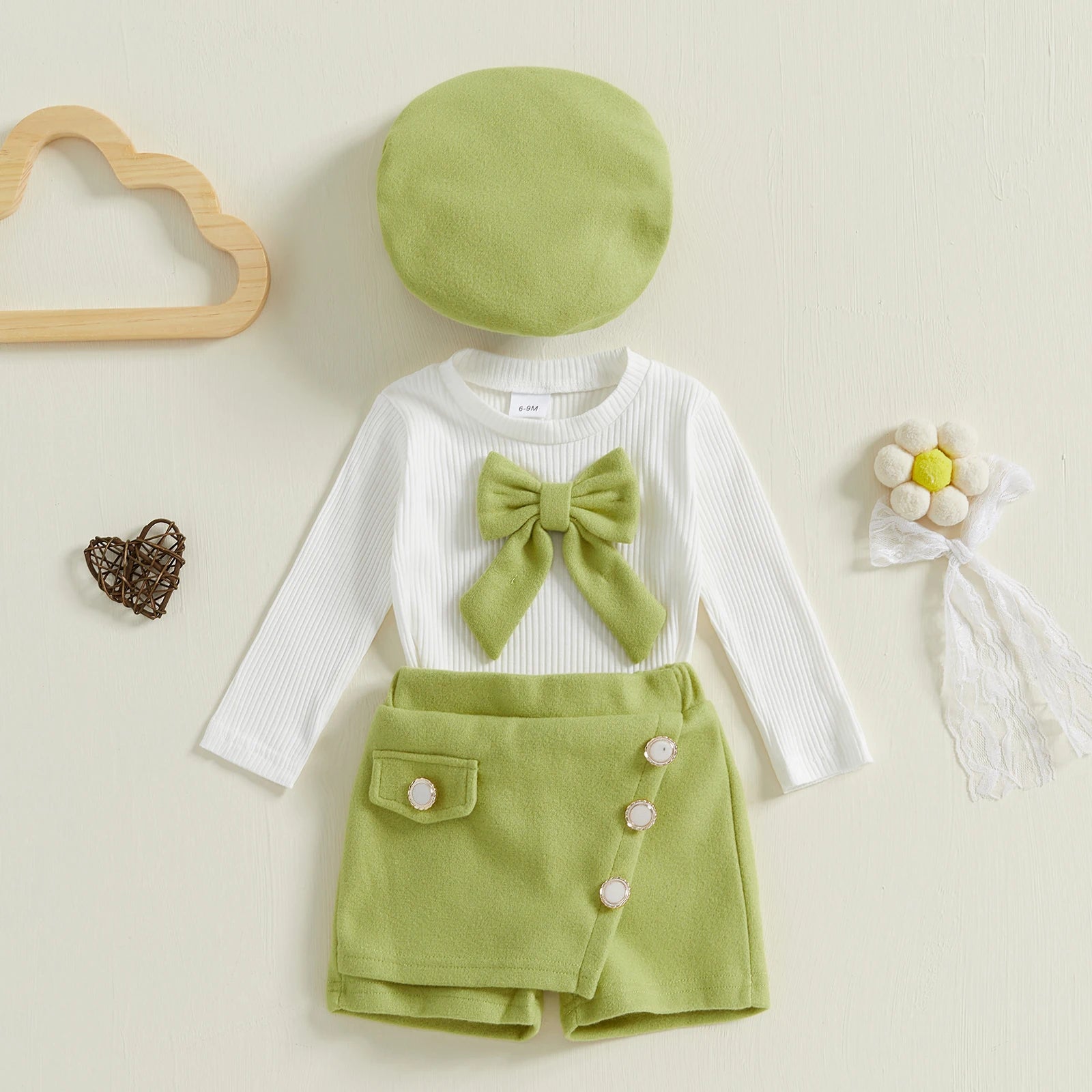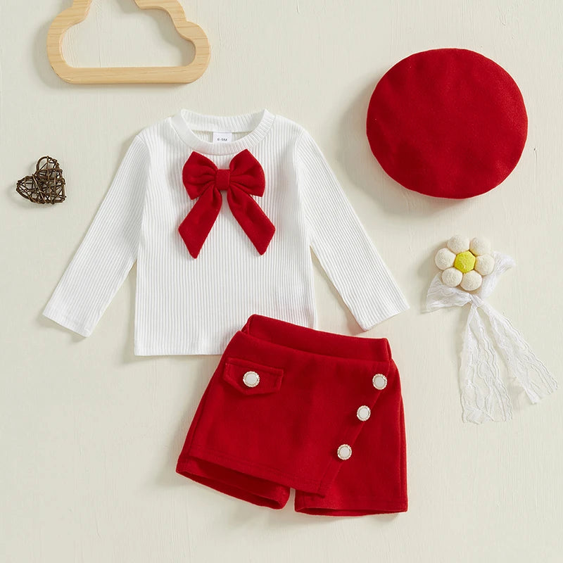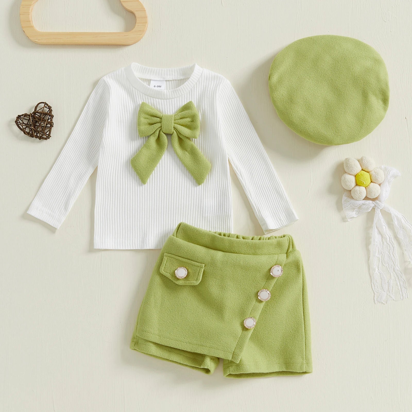 0-3Y Baby Girls Long Sleeve Crew Neck Bowknot Ribbed T-shirt with Shorts and Beanies Hats