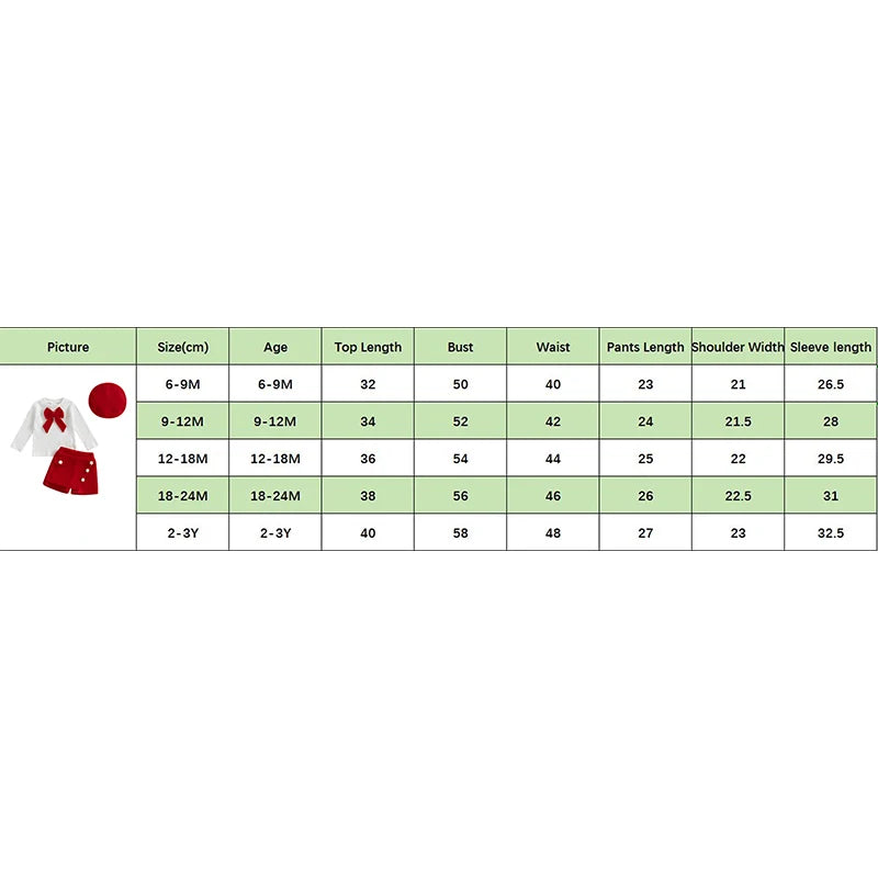 12-18M Tops Length: 34 Bust: 54 Sleeve: 27.5 Shoulder: 22 Waist: 44 Shorts Length: 25 Suggest Age: 12-18 Months