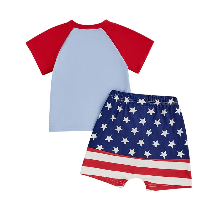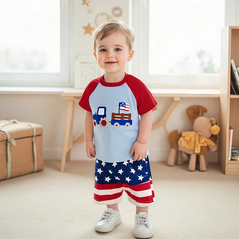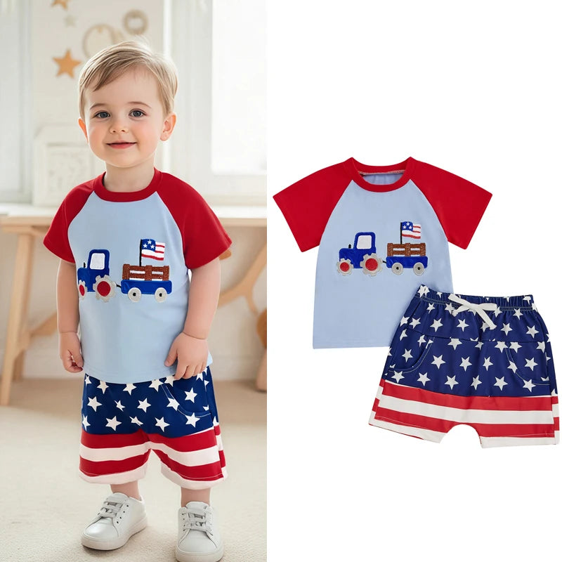 0-4Y American Flag Baby Boys Clothes Sets Tractor Embroidery Patchwork Short Sleeves T-Shirt Star Stripe Shorts