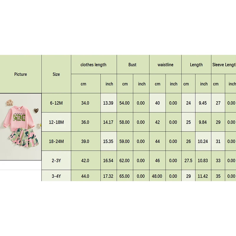 6-12M Tops Length: 13.39 Bust: 21.26 Sleeve: 10.63 Skirt Length: 9.45 Waist: 15.75 Advised Age: 6-12 Months
