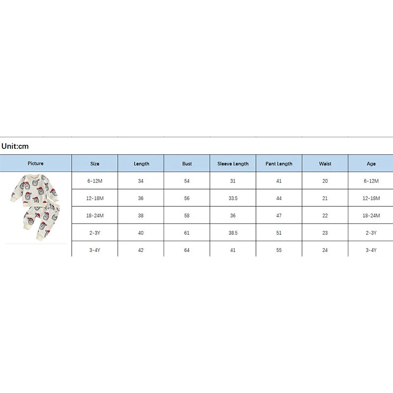 6-12M Tops Length: 34 Bust: 54 Sleeve: 31 Pants Length: 41 Waist: 40 Advised Age: 6-12 Months