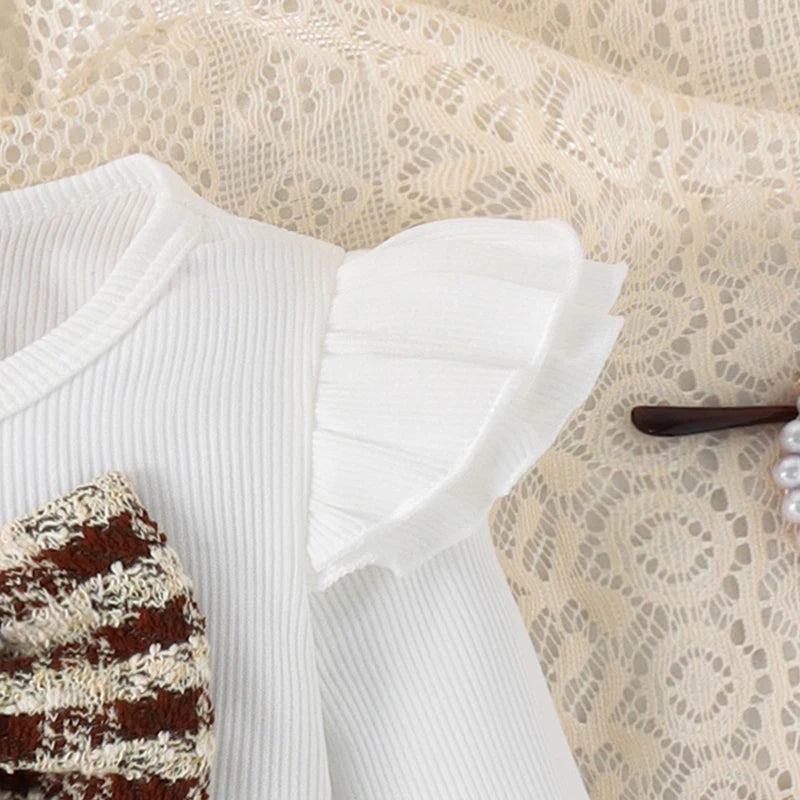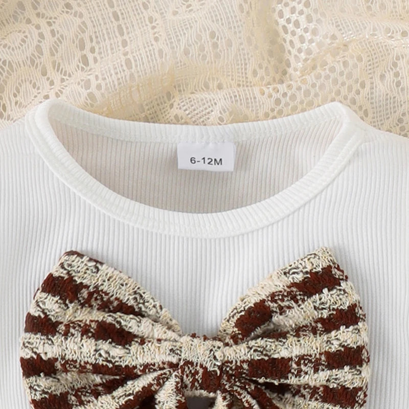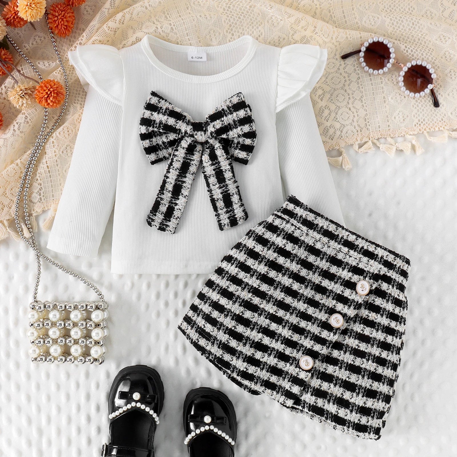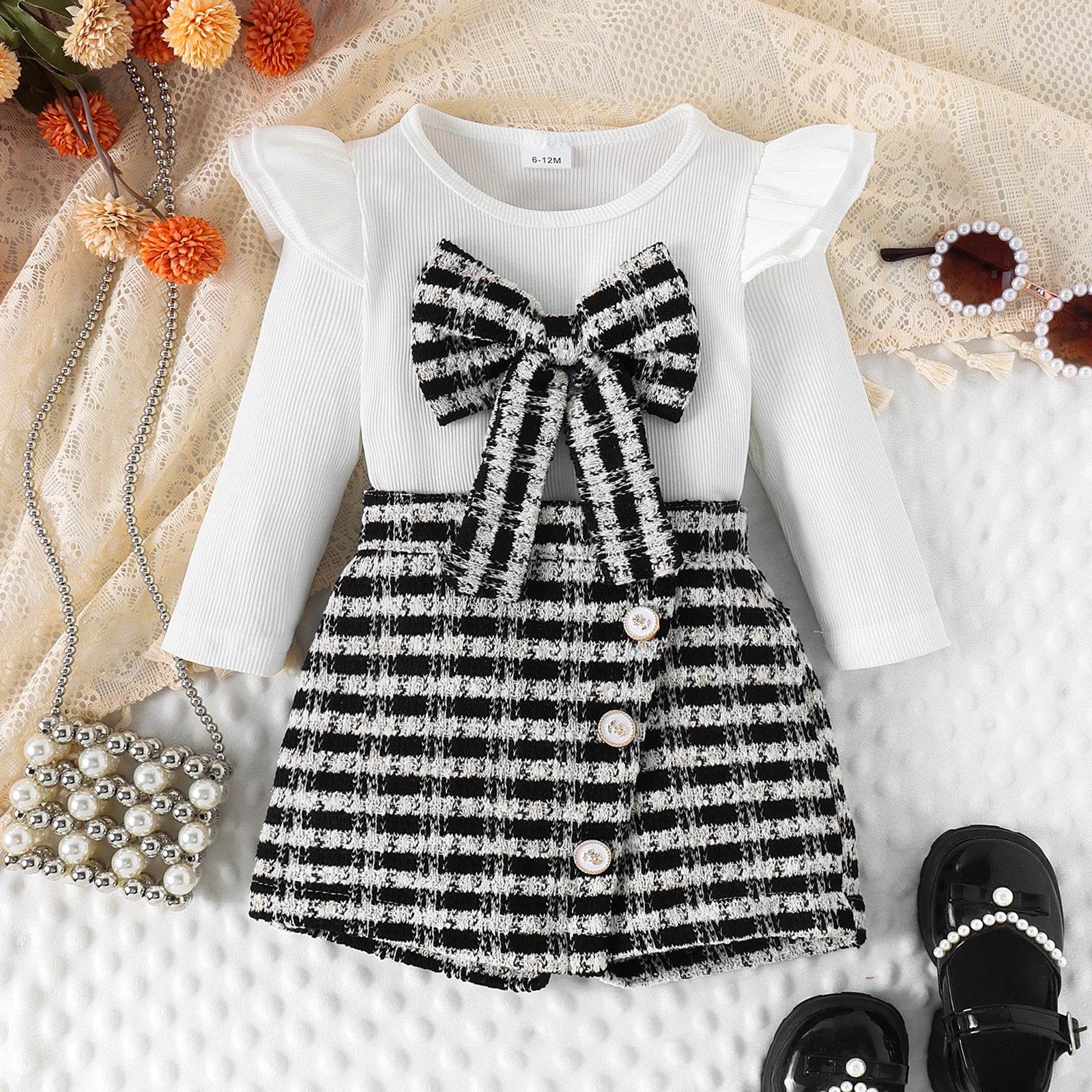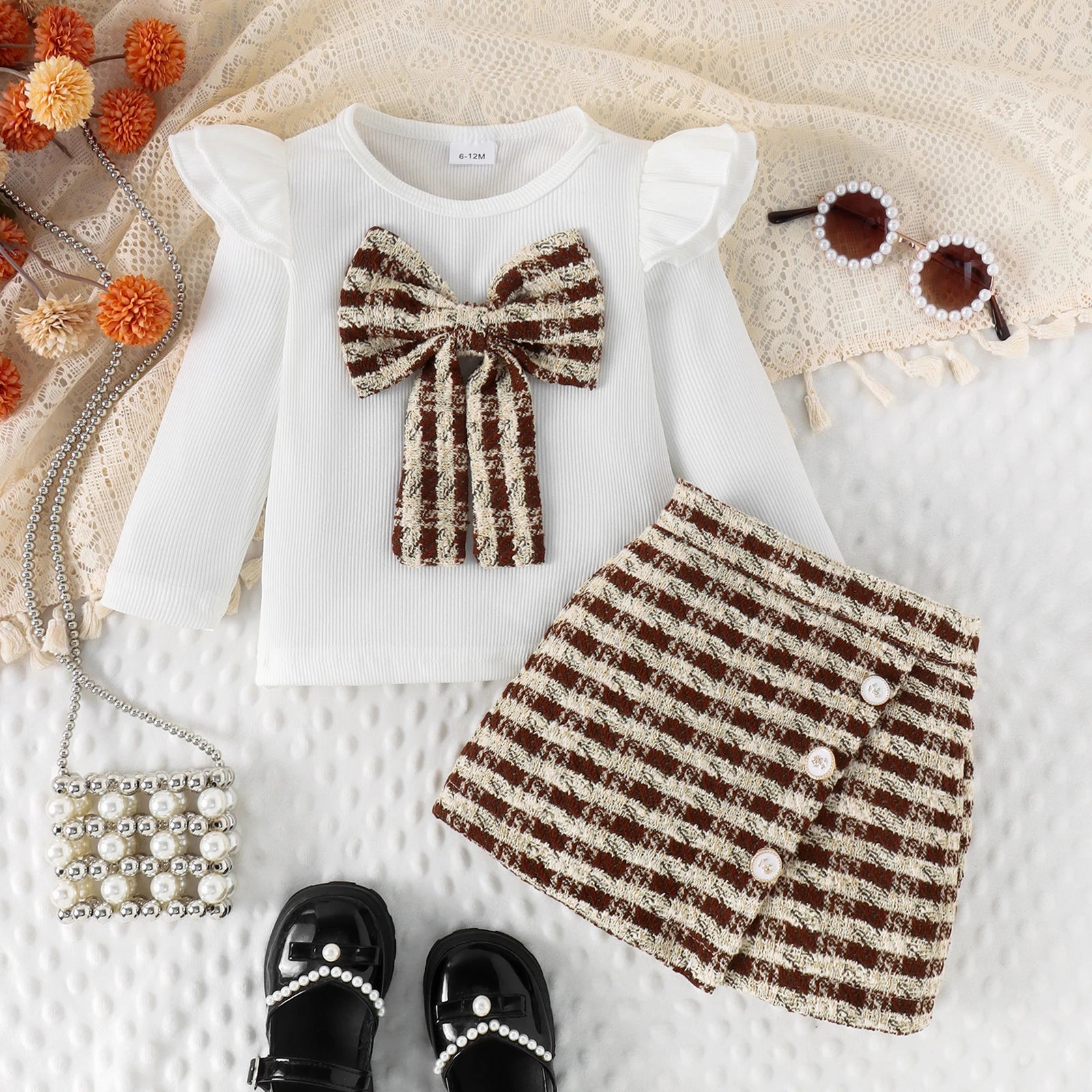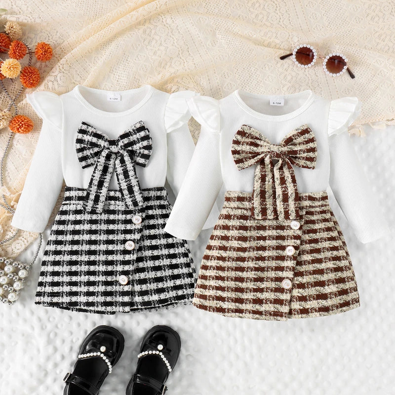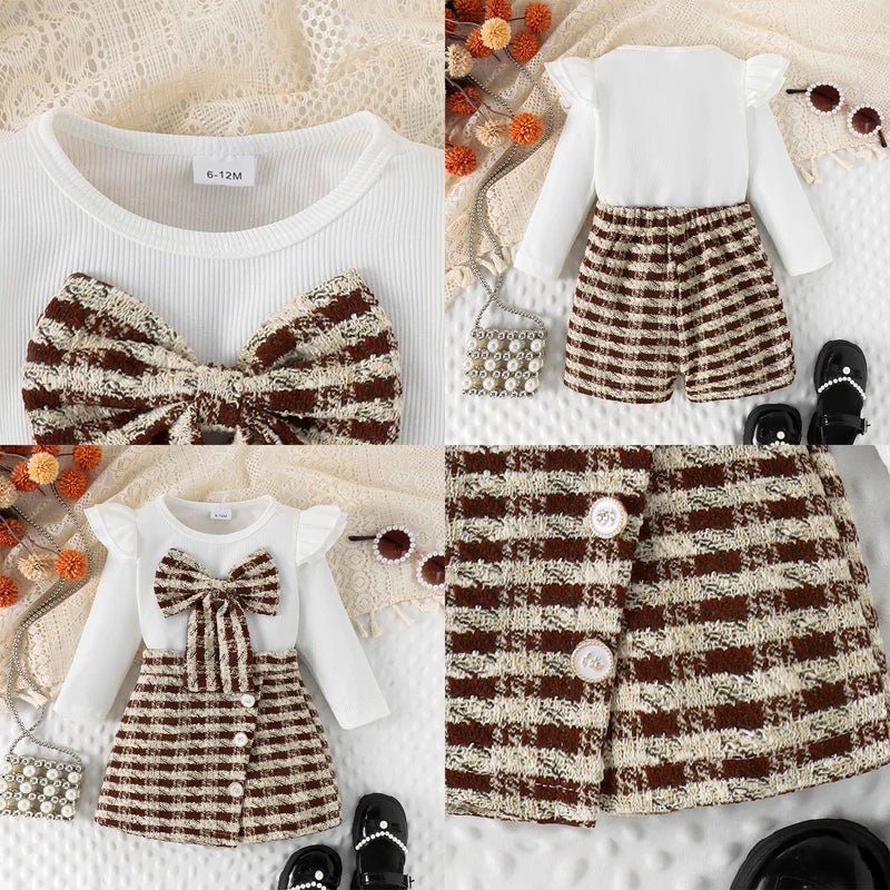 0-4Y Kids Girls Long Sleeve Bowknot Top Buttons Plaid Print A-Line Skirt