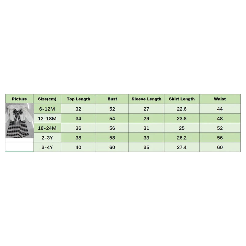 6-12M Tops Length: 12.6 Bust: 20.47 Sleeve: 10.63 Shoulder: 8.66 Skorts Length: 8.9 Waist: 16.54 Advised Age: 6-12 Months