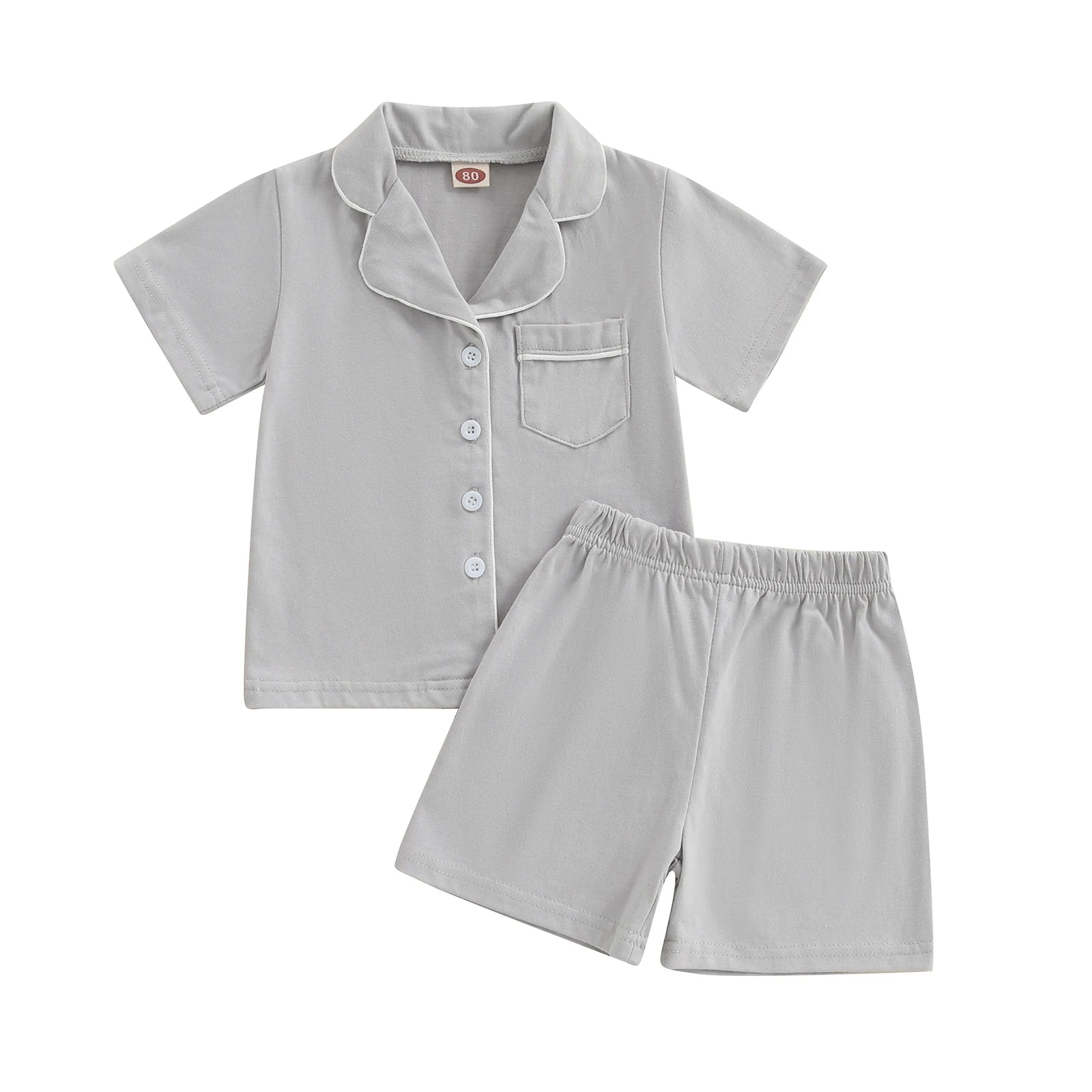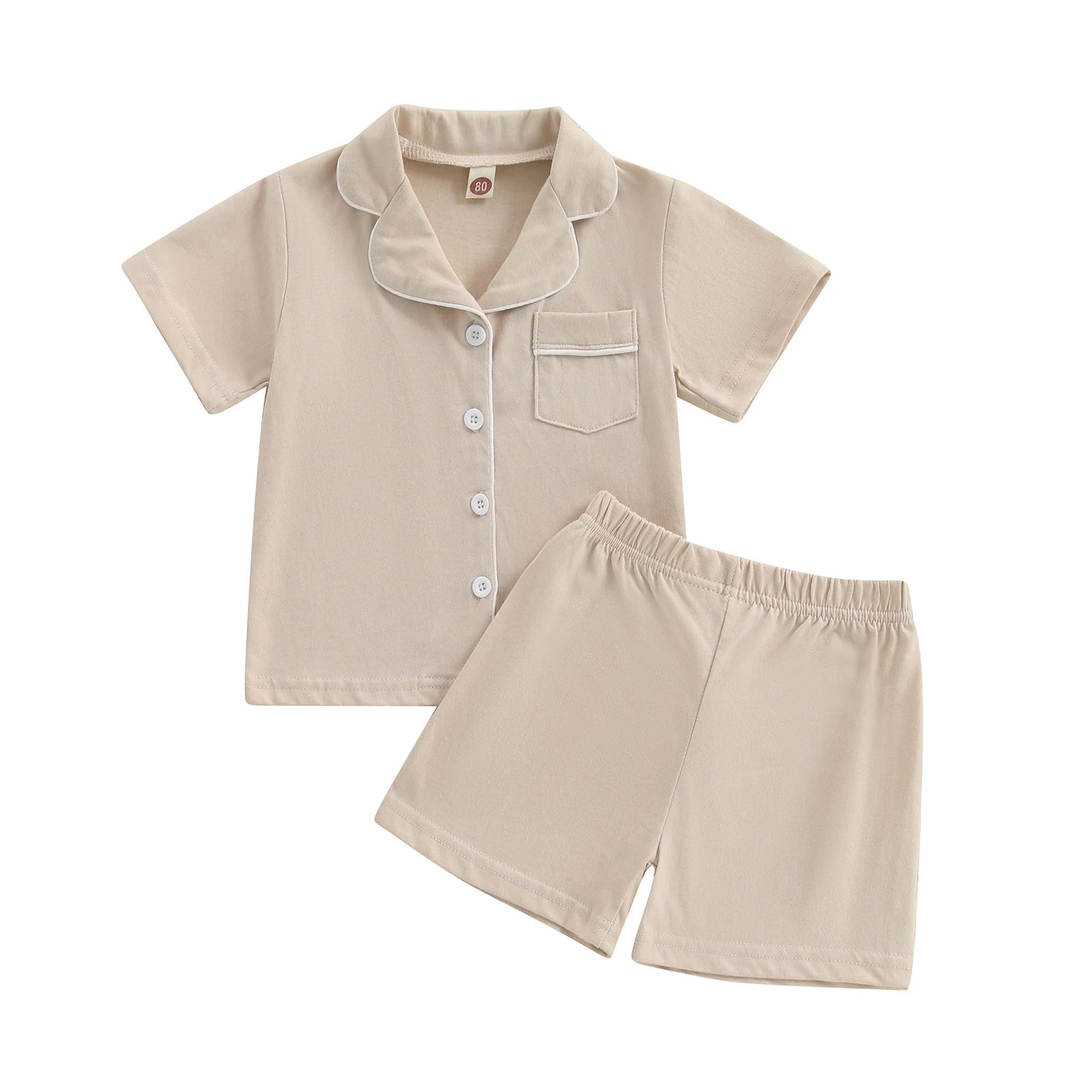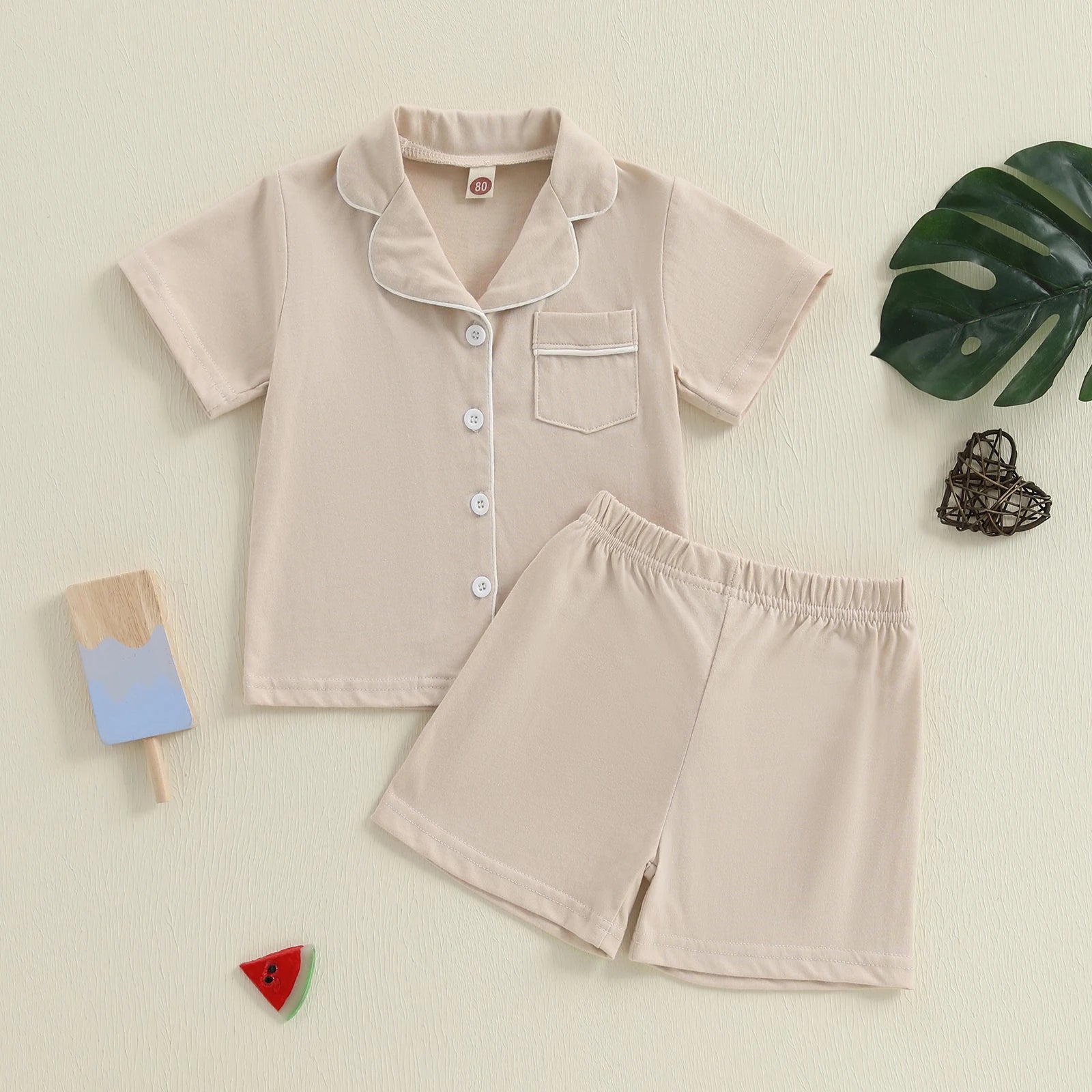 0-8Y Summer Toddler Kids Boys Girls Pyjamas Clothes Set Solid Contrast Trim Lapel Short Sleeve Button Down Tops Shorts