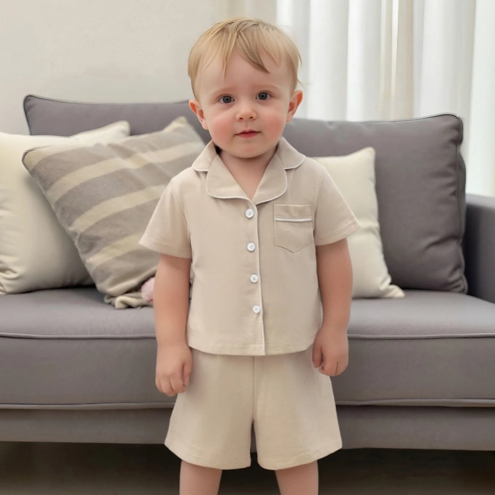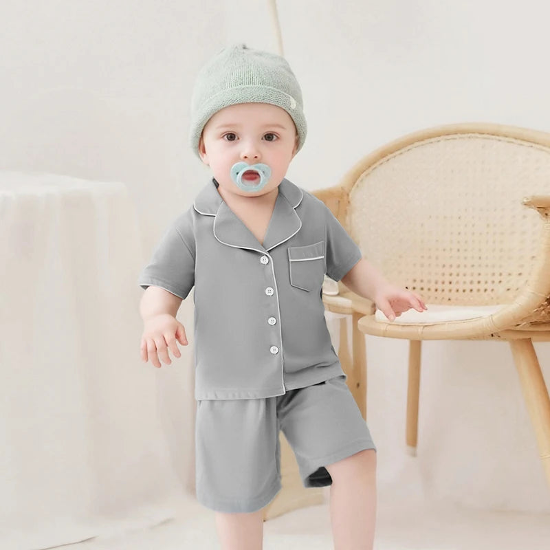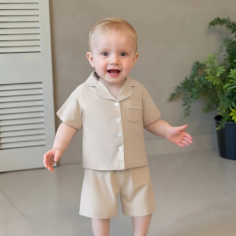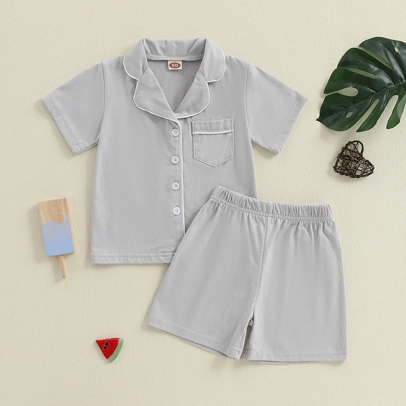 0-8Y Summer Toddler Kids Boys Girls Pyjamas Clothes Set Solid Contrast Trim Lapel Short Sleeve Button Down Tops Shorts
