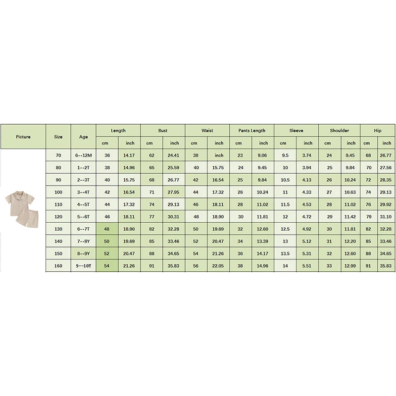 80 Tops Length: 14.17 Bust: 22.83 Sleeve: 4.53 Shoulder: 9.45 Pants Length: 10.24 Waist: 15.75 Hip: 25.2 Advised Age: 6-12 Months