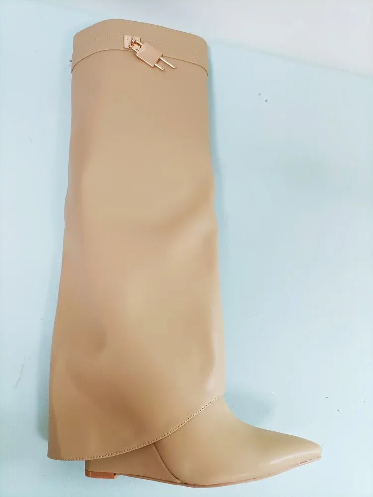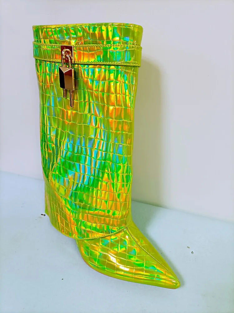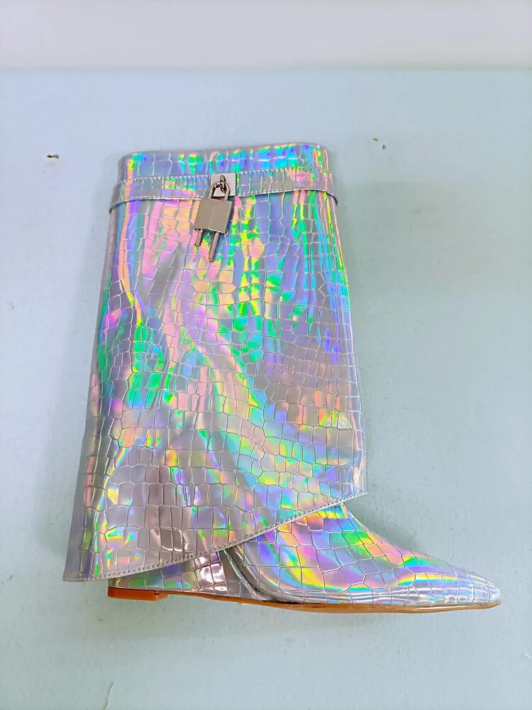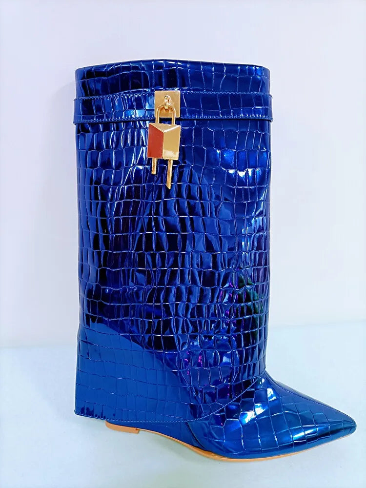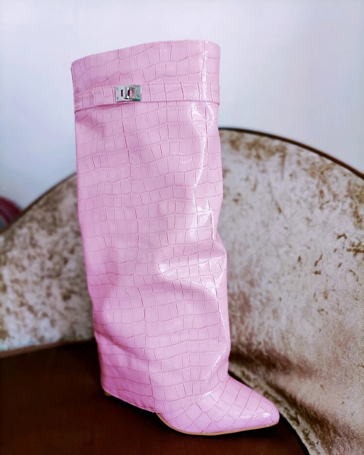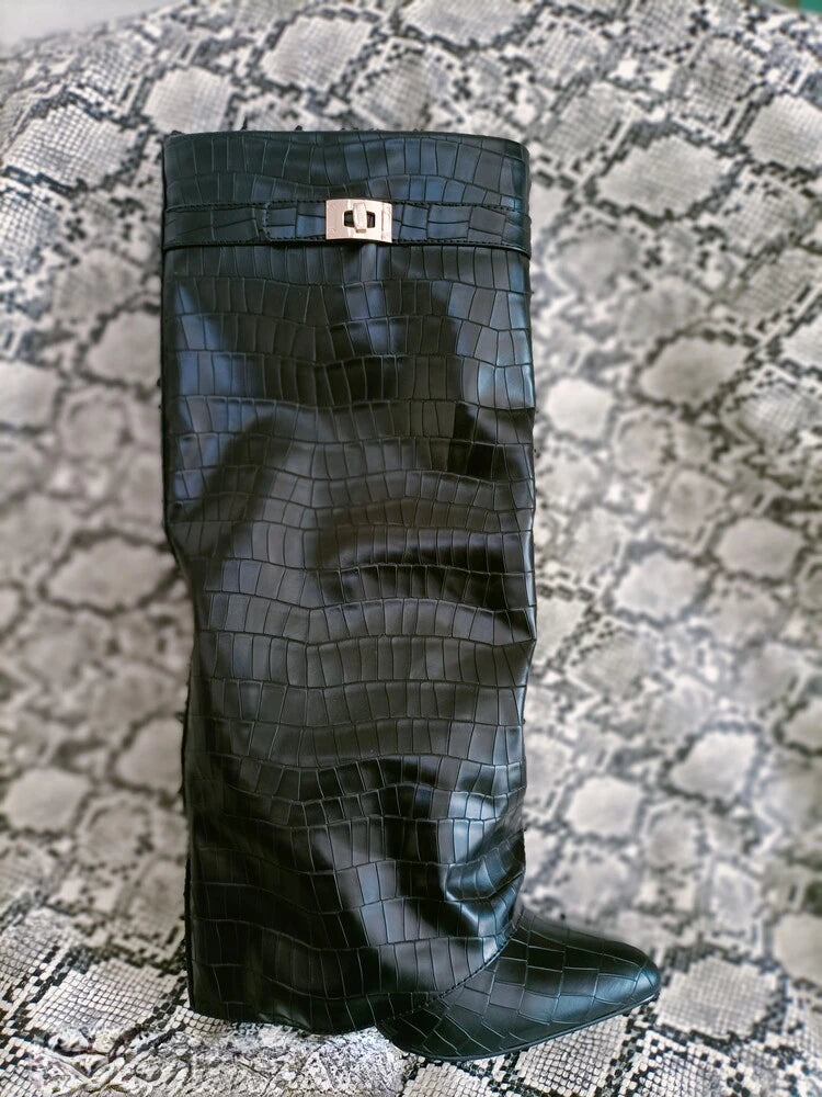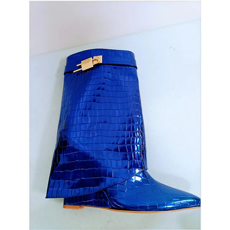 Make a bold fashion statement with these stunning wedge leather mid-calf boots – featuring luxurious crocodile texture and eye-catching metal buckle details for sophisticated style.