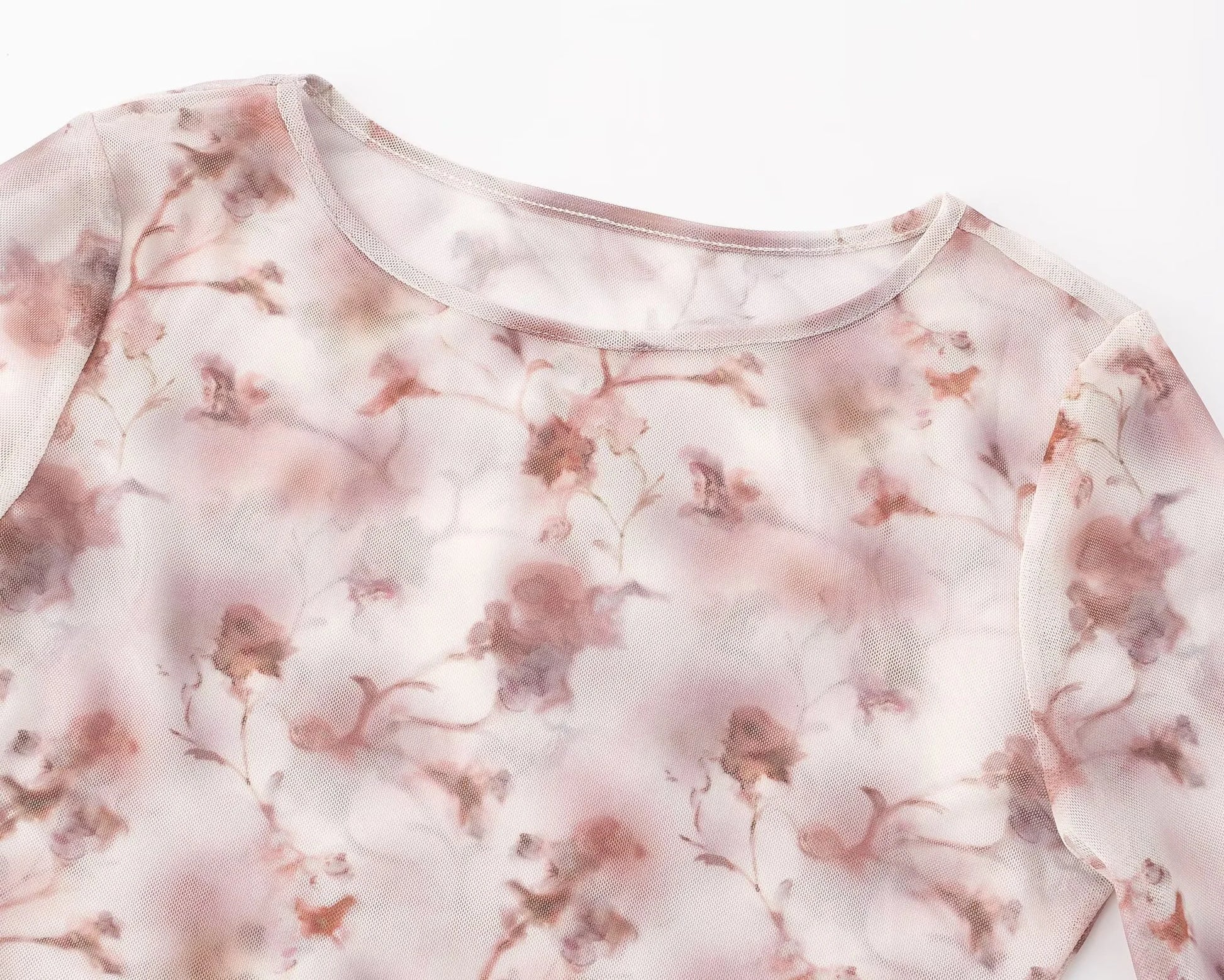 Women's French Retro Printed Boat Neck Dress - Trumpet Sleeve Long Dress