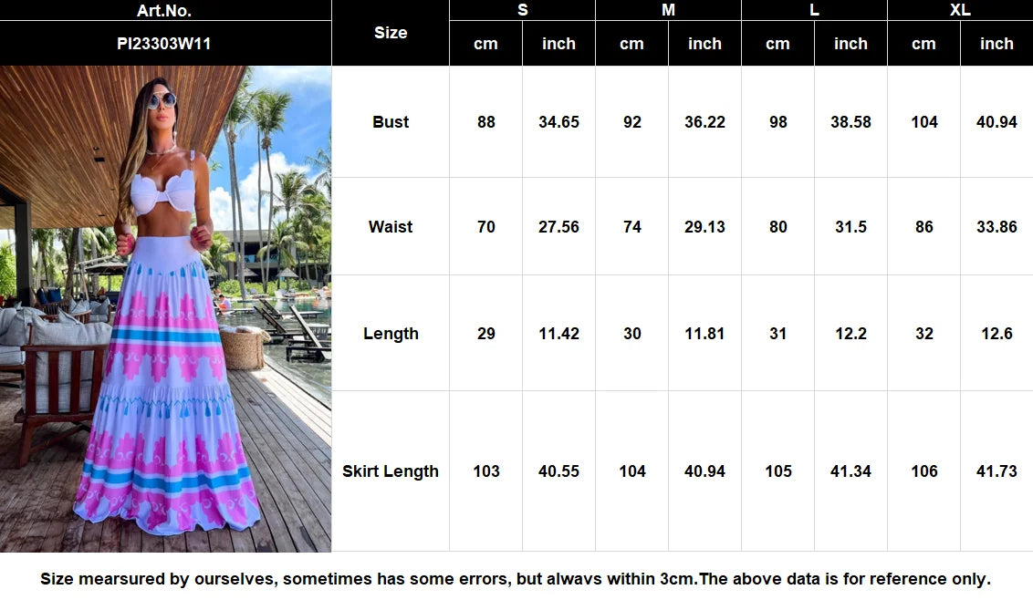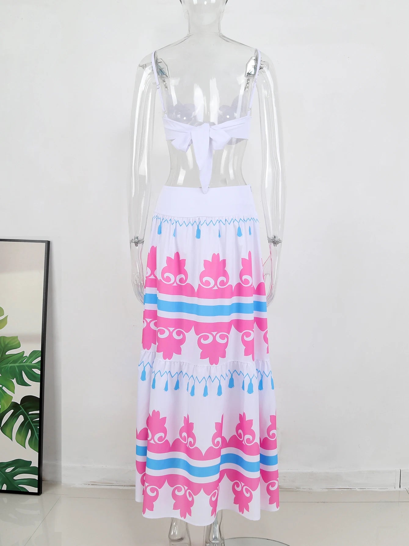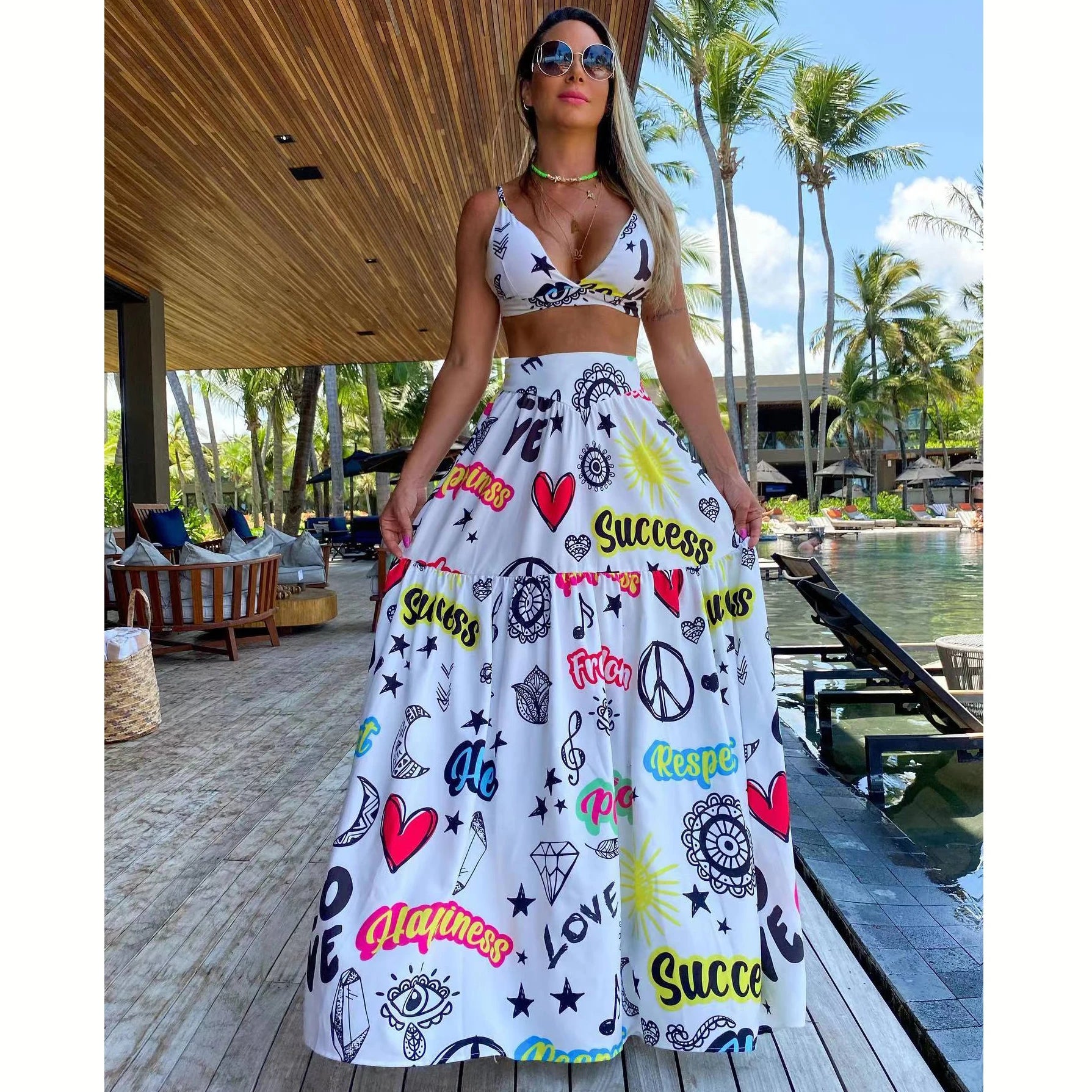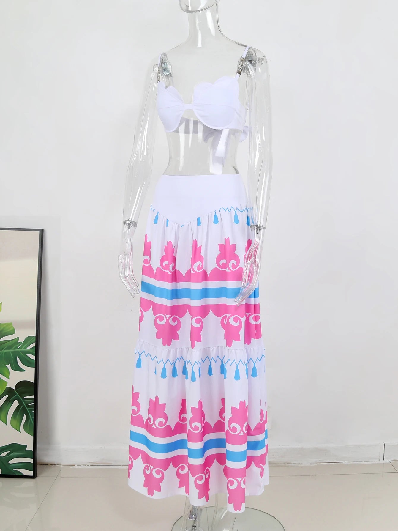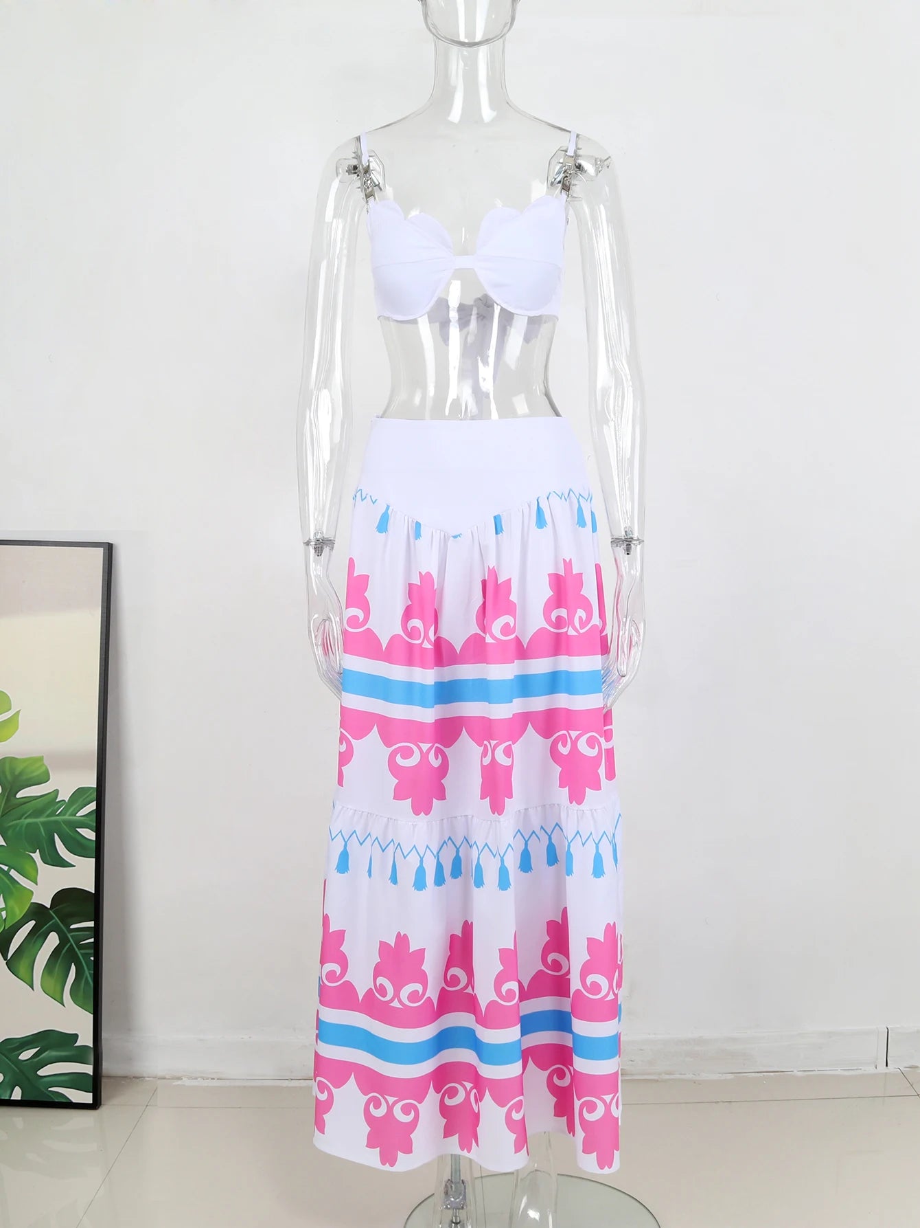 Women's Print Beach Two Piece Skirt White Bra High Waist A-line Long Skirt Beach Set