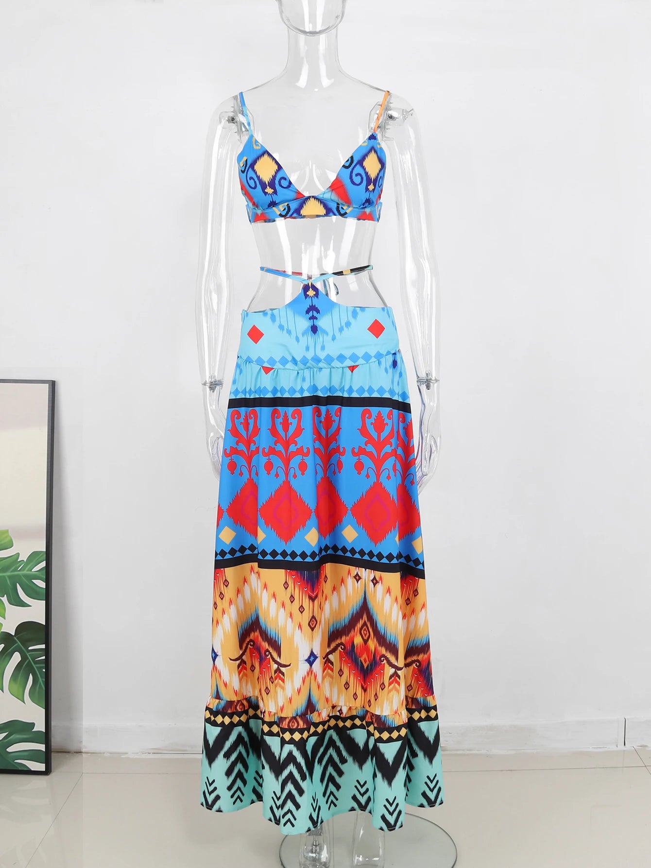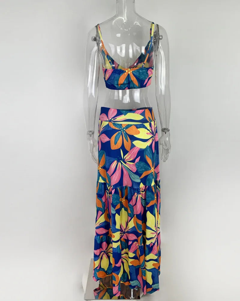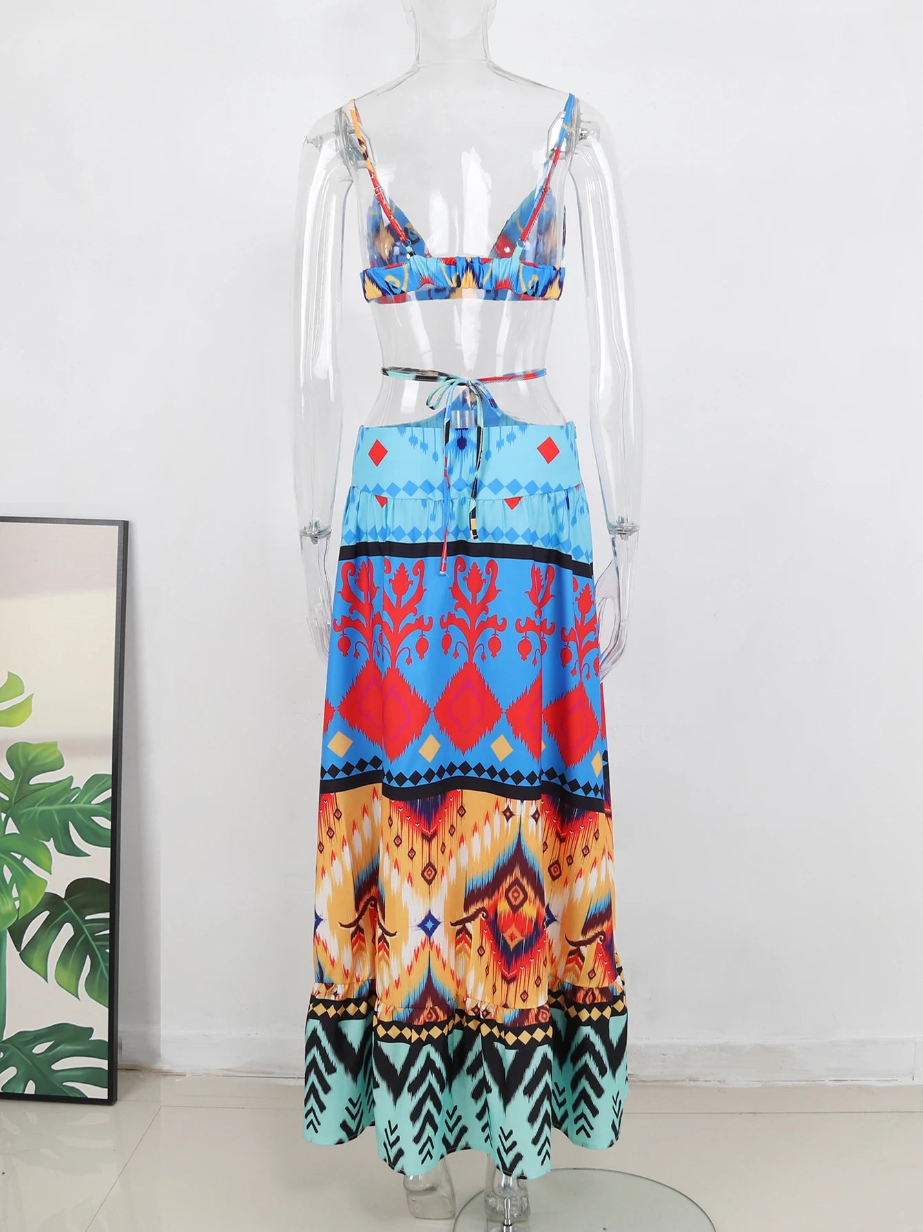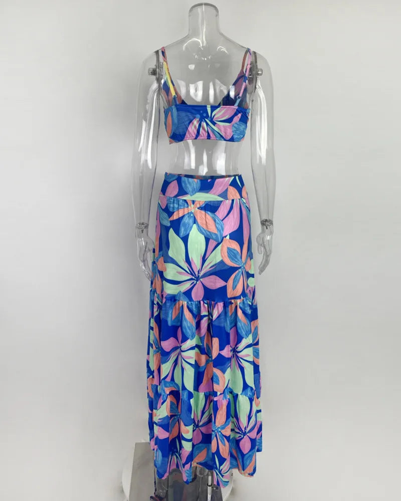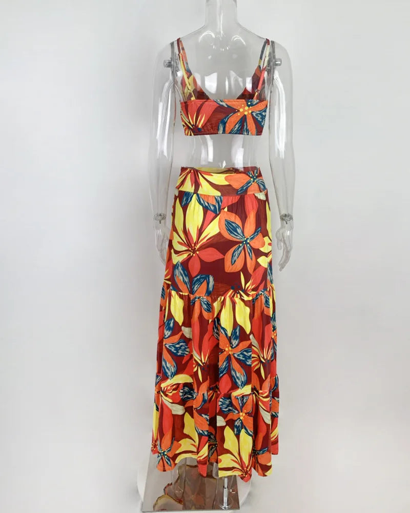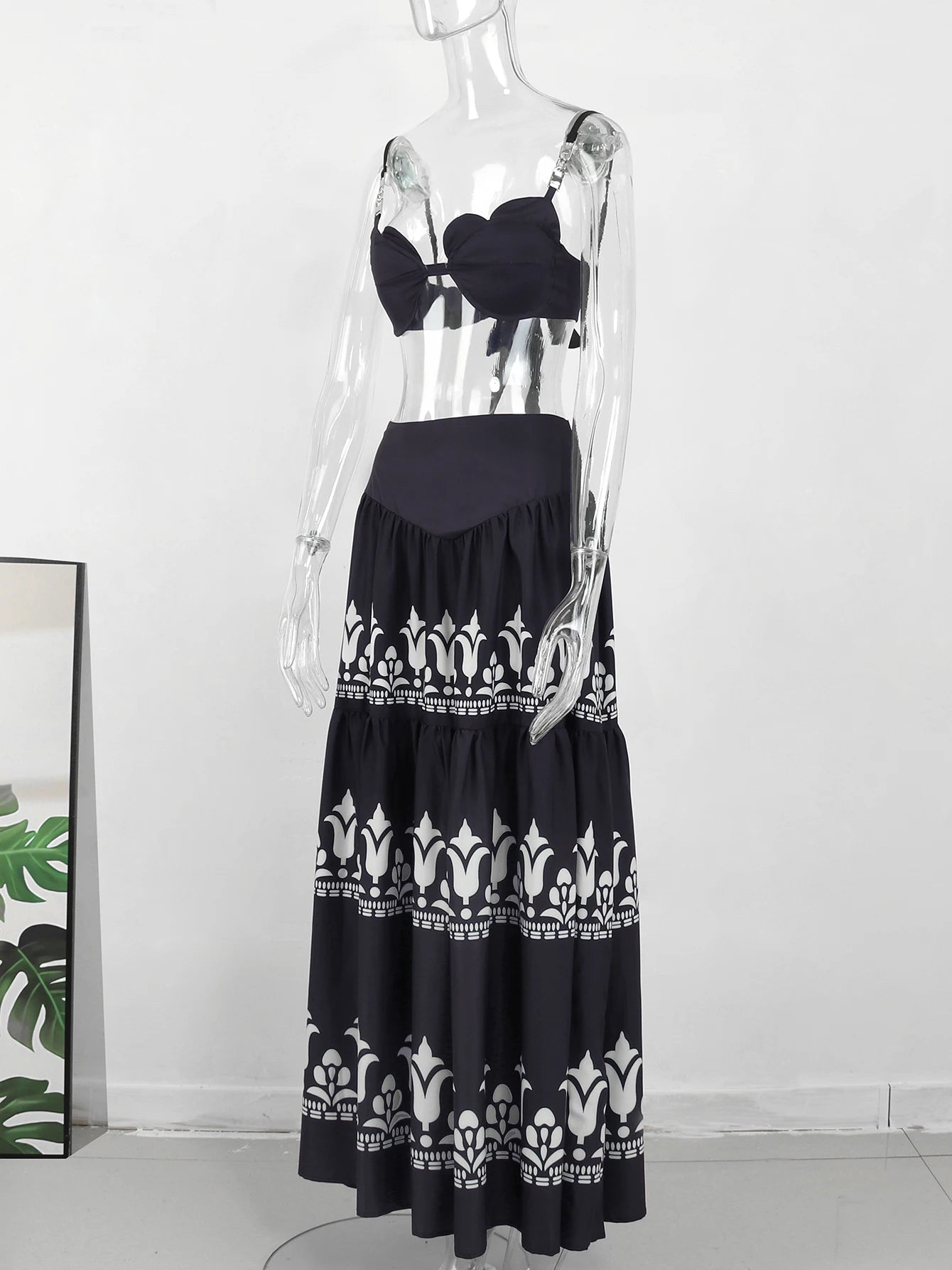 Women's Print Beach Two Piece Skirt White Bra High Waist A-line Long Skirt Beach Set