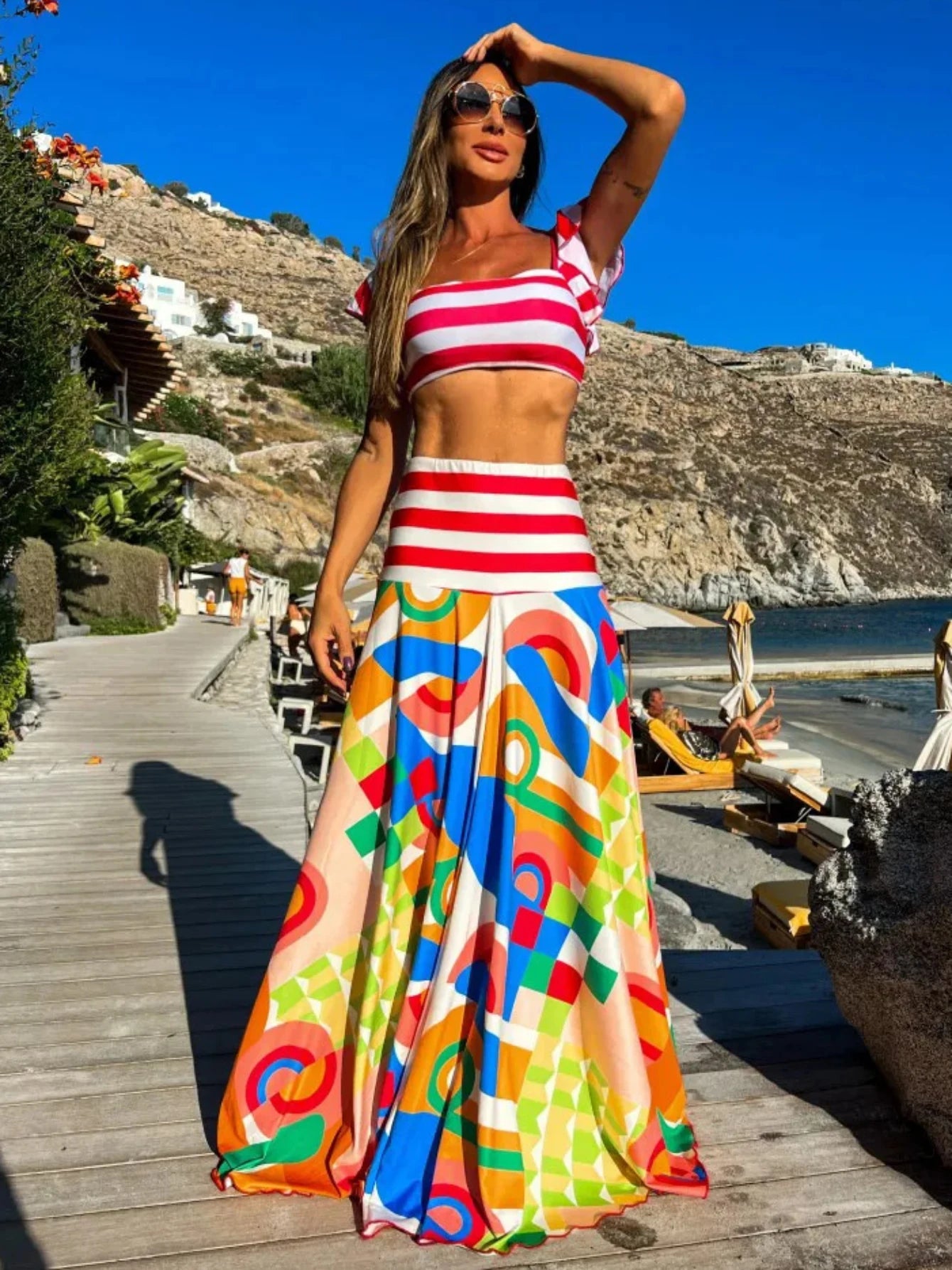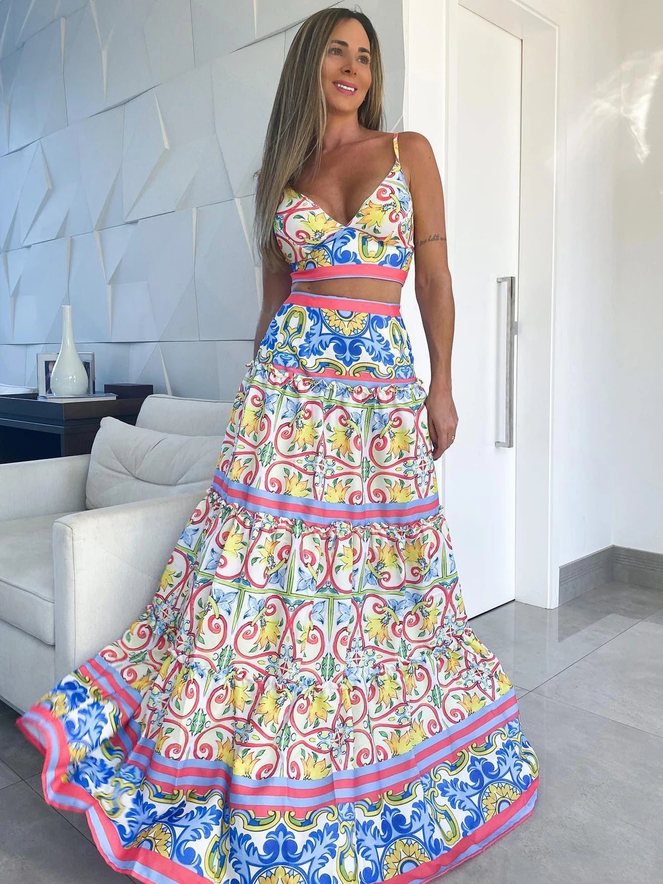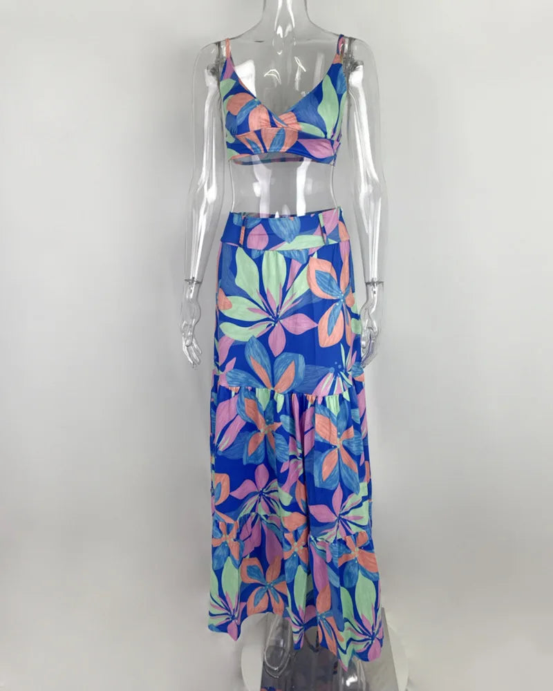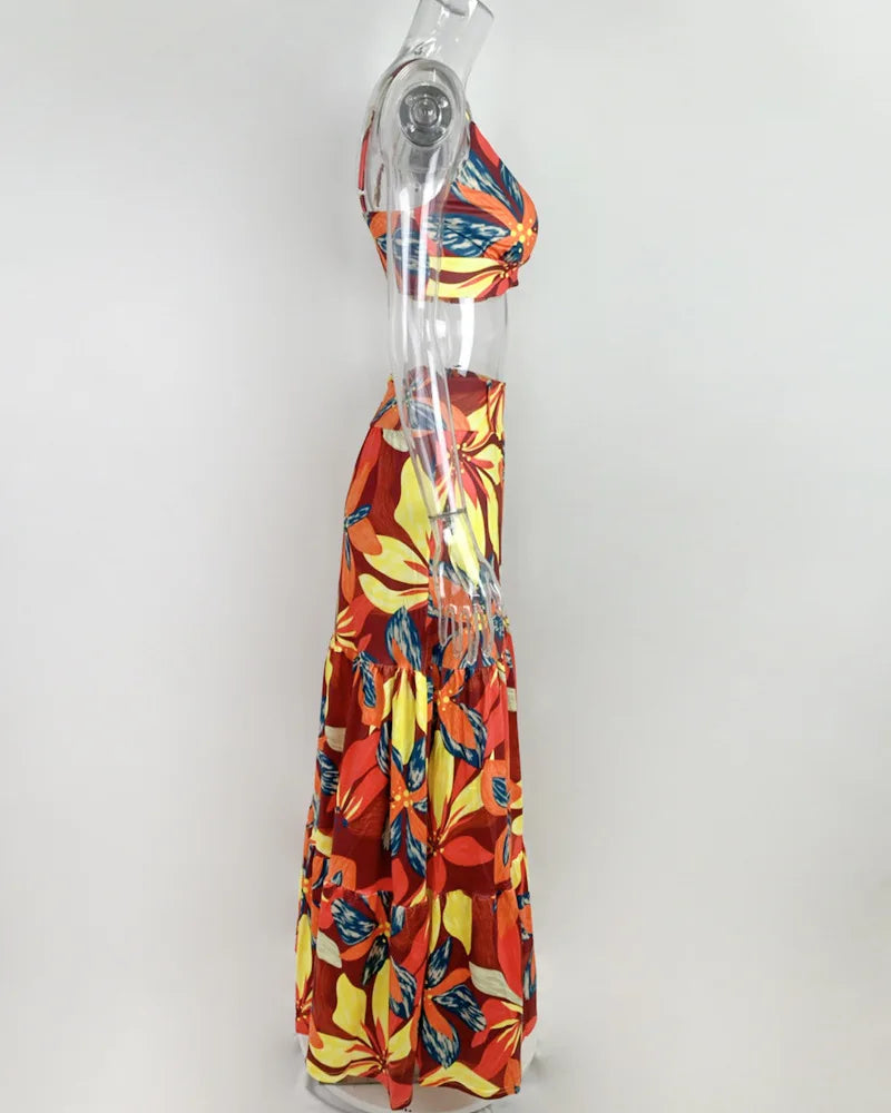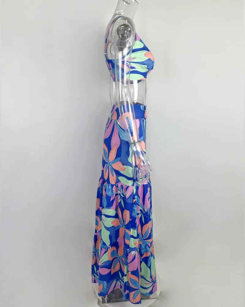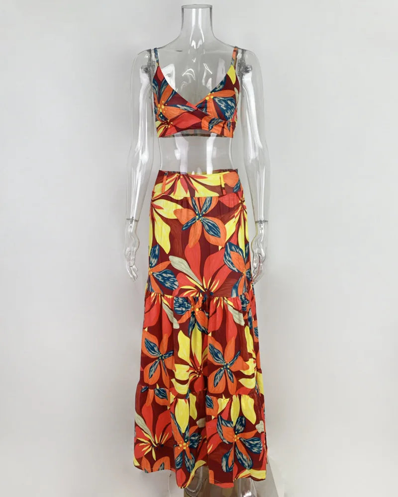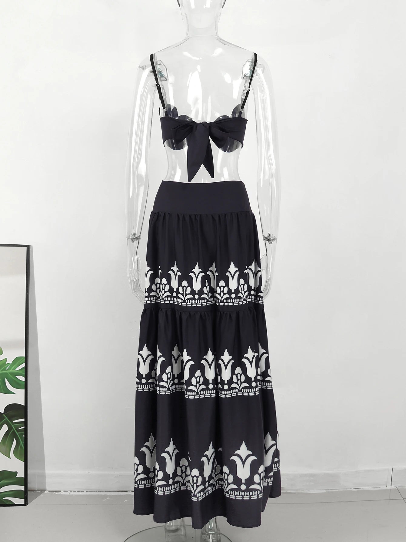 Women's Print Beach Two Piece Skirt White Bra High Waist A-line Long Skirt Beach Set