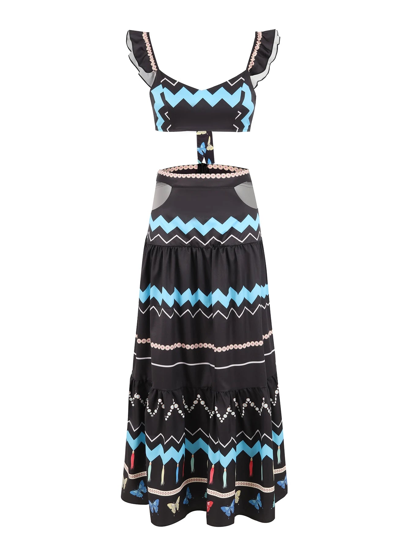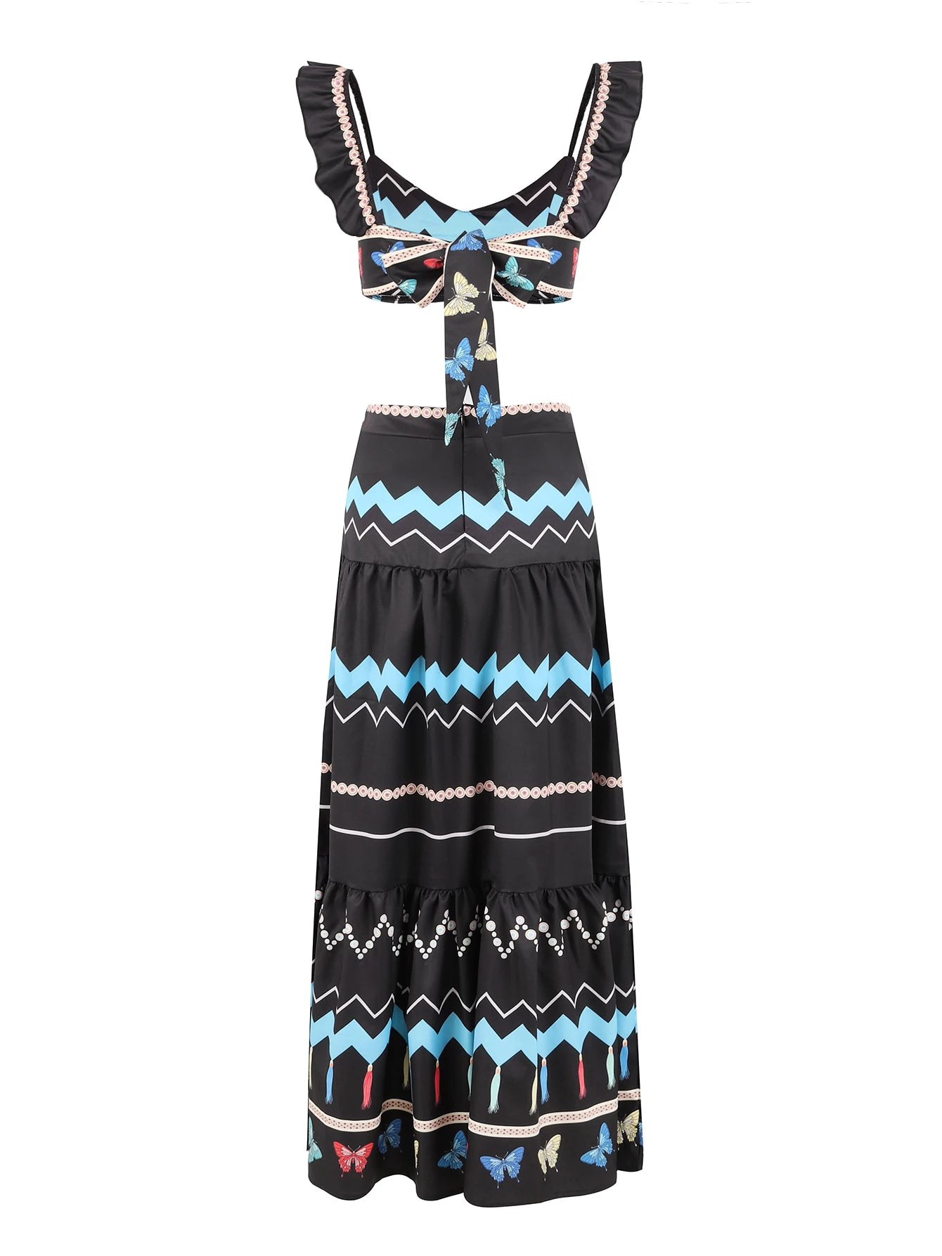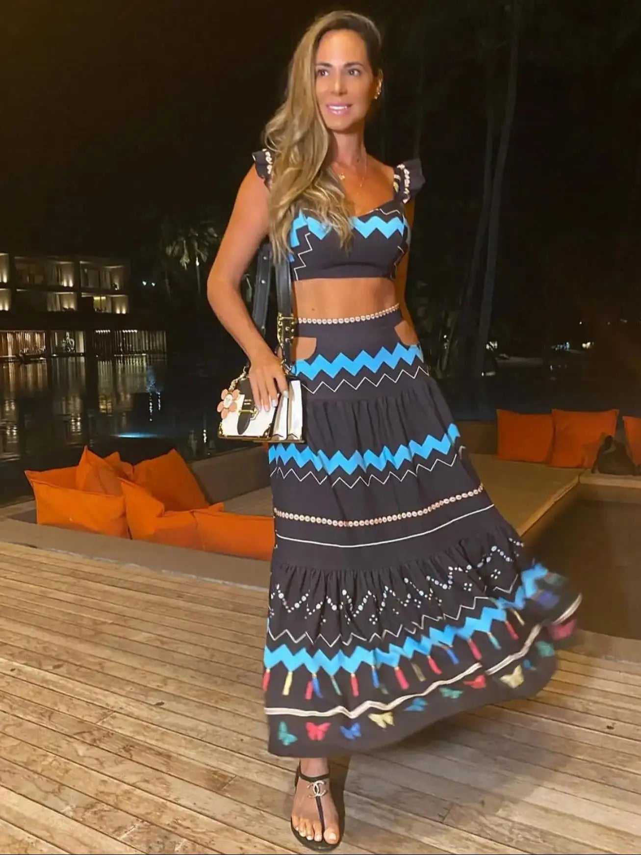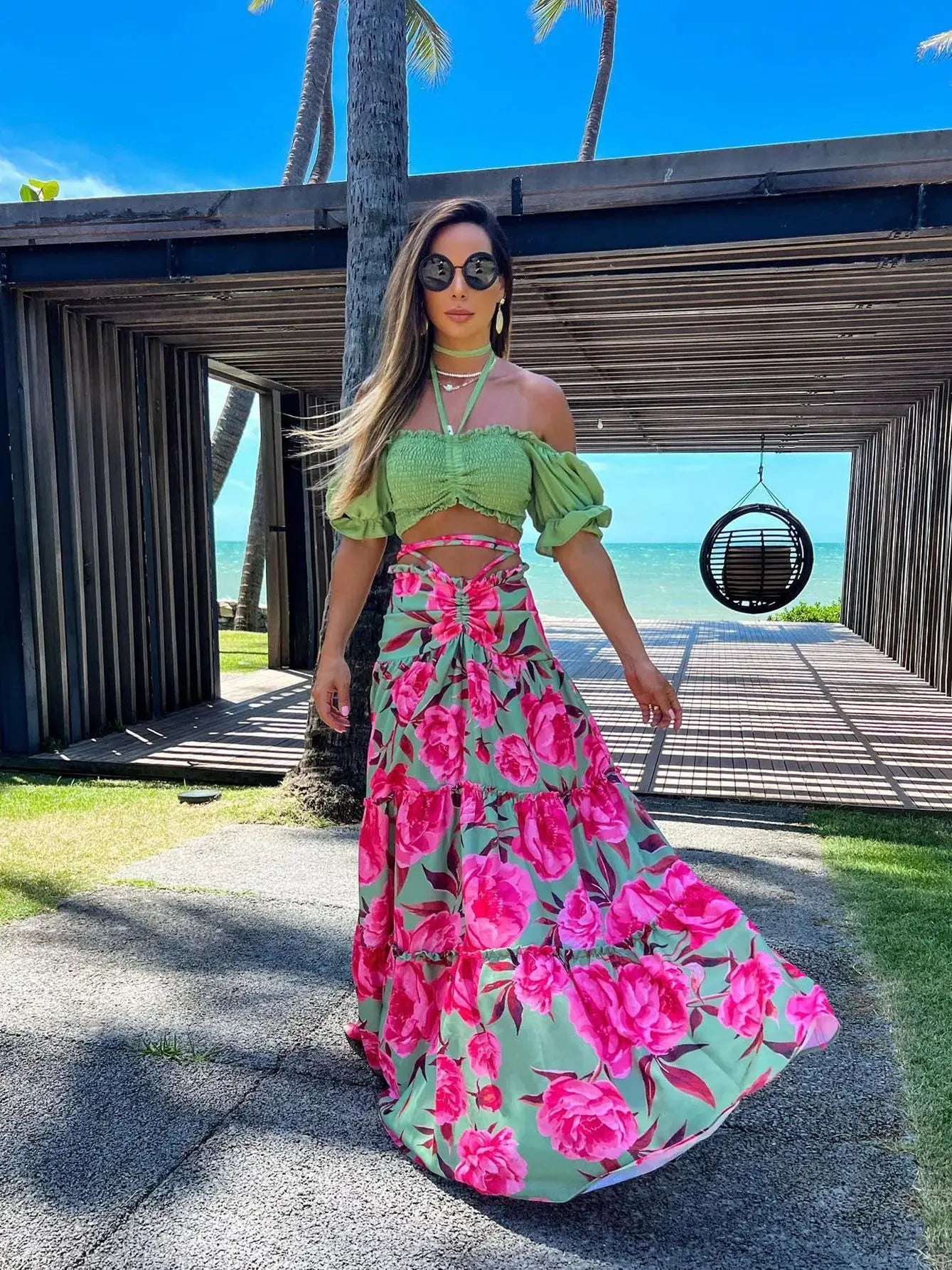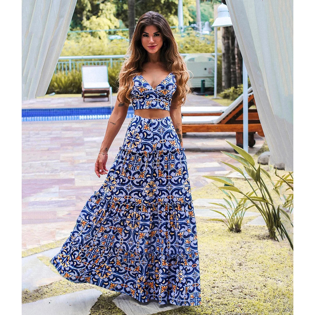 Women's Print Beach Two Piece Skirt White Bra High Waist A-line Long Skirt Beach Set