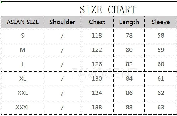 | UK Size | US Size | EU Size | Chest (cm) | Shoulder (cm) | Length (cm) | Sleeve (cm) |