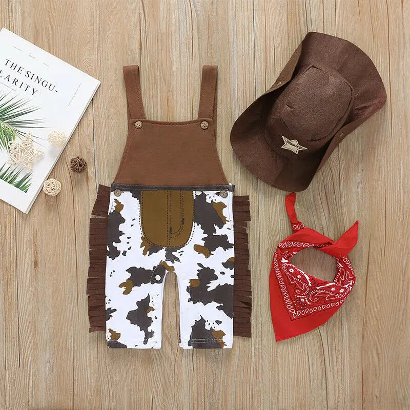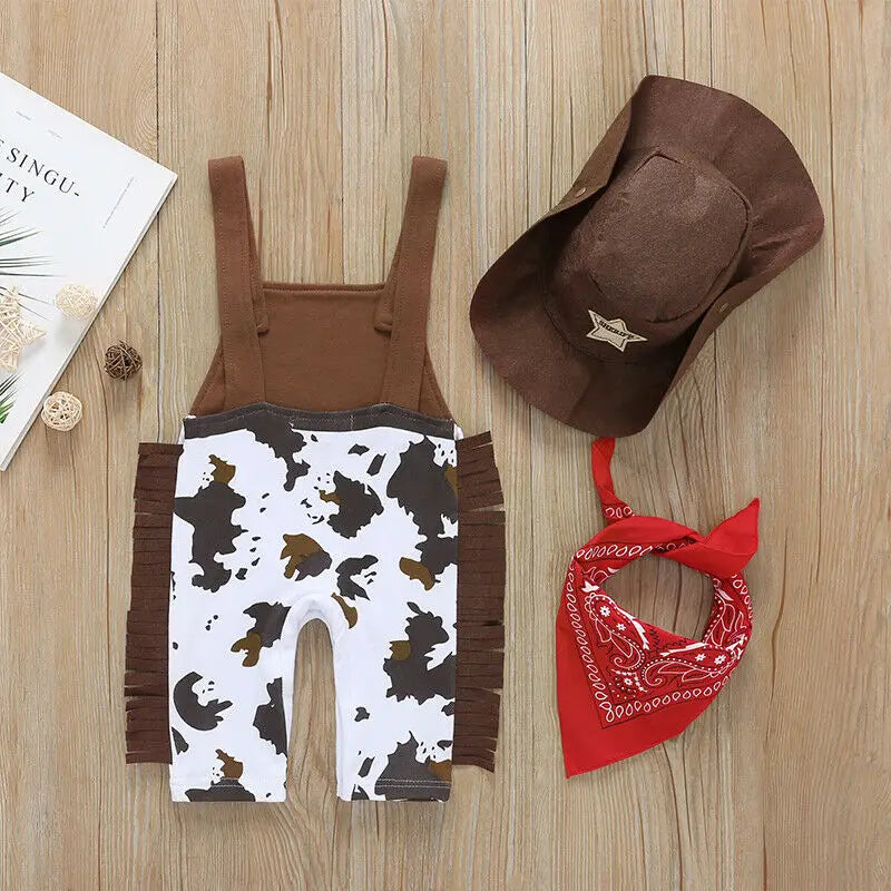 3-24M Newborn Baby Boy Outfits Clothes Sets Print Sleeveless Romper Jumpsuit Top Scarf Hat 3pcs Set