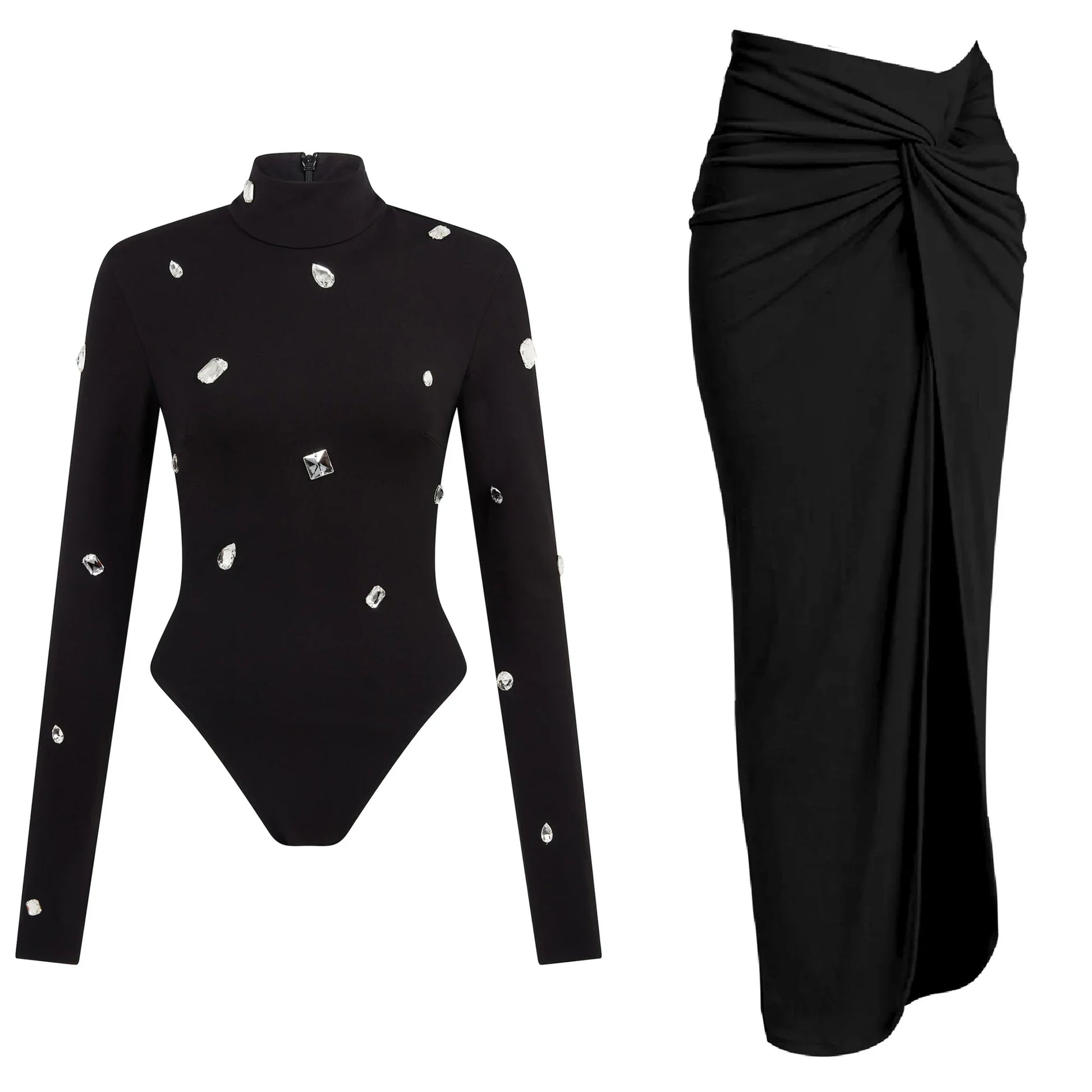 Women's 3-Piece Rhinestone Swimwear Set - Long Sleeve with Slit Skirt