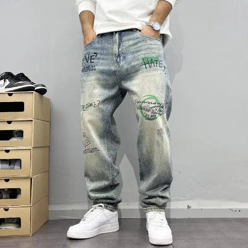Men's Retro Print Straight Jeans - Loose Fit Hip-Hop