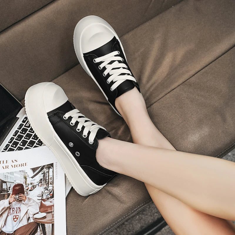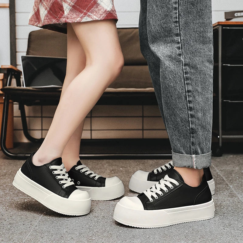 Premium leather meets contemporary platform styling. These autumn-ready sneakers combine quality leather construction with vulcanized durability for long-lasting performance. Designed for versatile wear, these flat platform trainers work equally well for skateboarding, tennis, or casual outdoor activities.