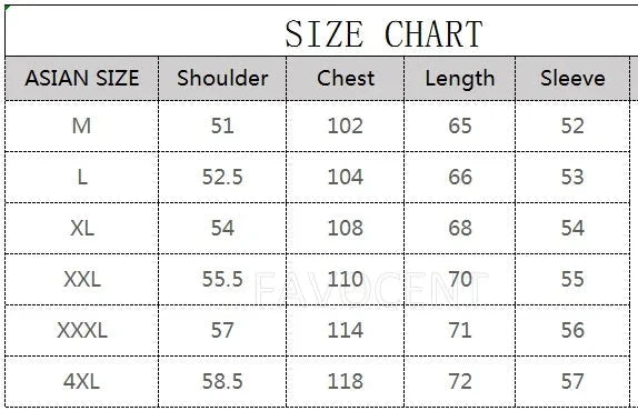 | Size | UK | US | Euro | Chest (cm) | Shoulder (cm) | Length (cm) | Sleeve (cm) |