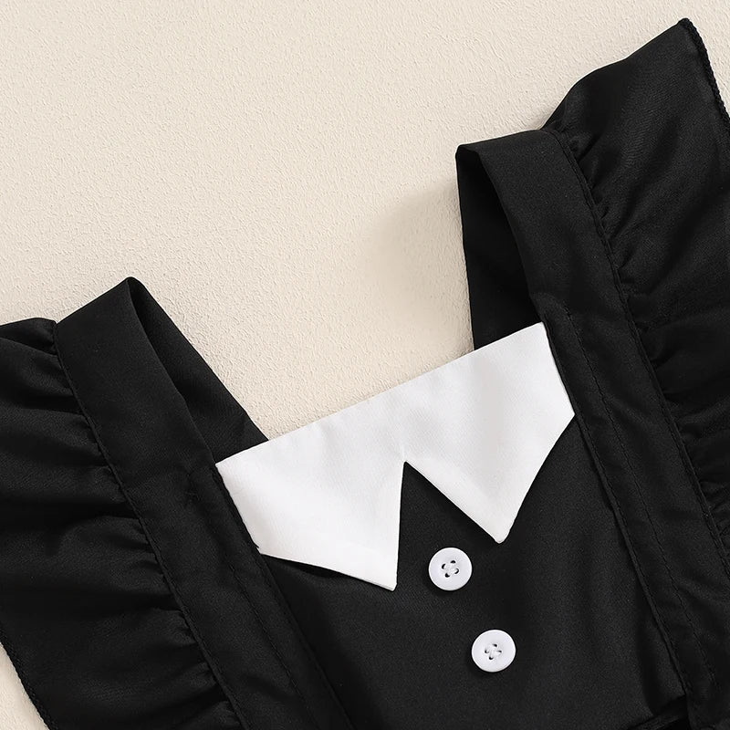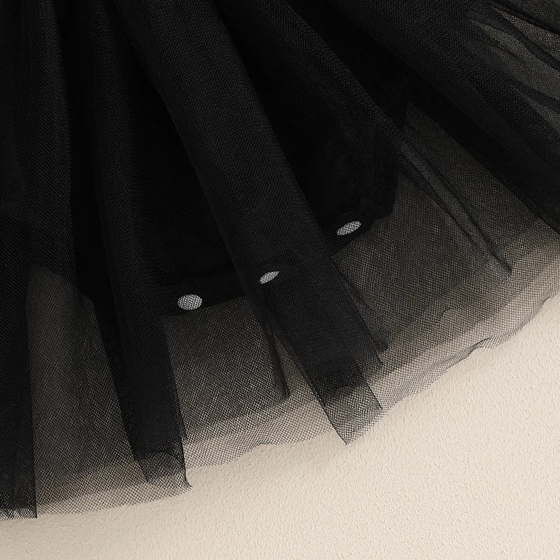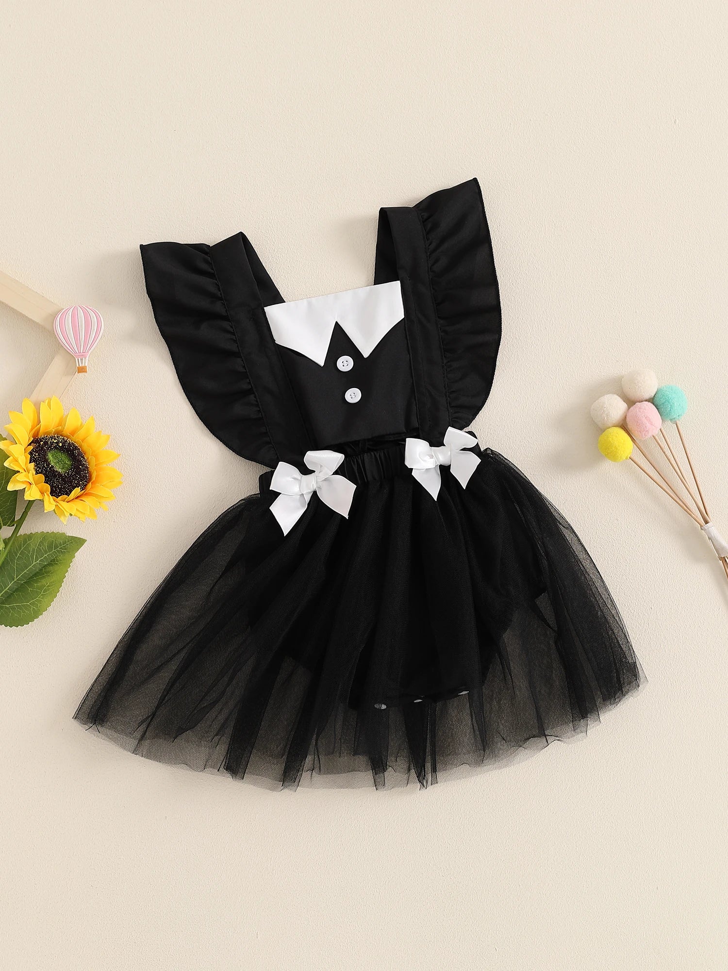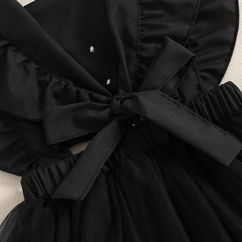 Celebrate Halloween in adorable style with this charming romper dress for baby girls. Featuring delicate flutter sleeves, a sweet square neckline, and beautiful tulle patchwork details, this jumpsuit is perfect for babies during the spooky season and autumn festivities.