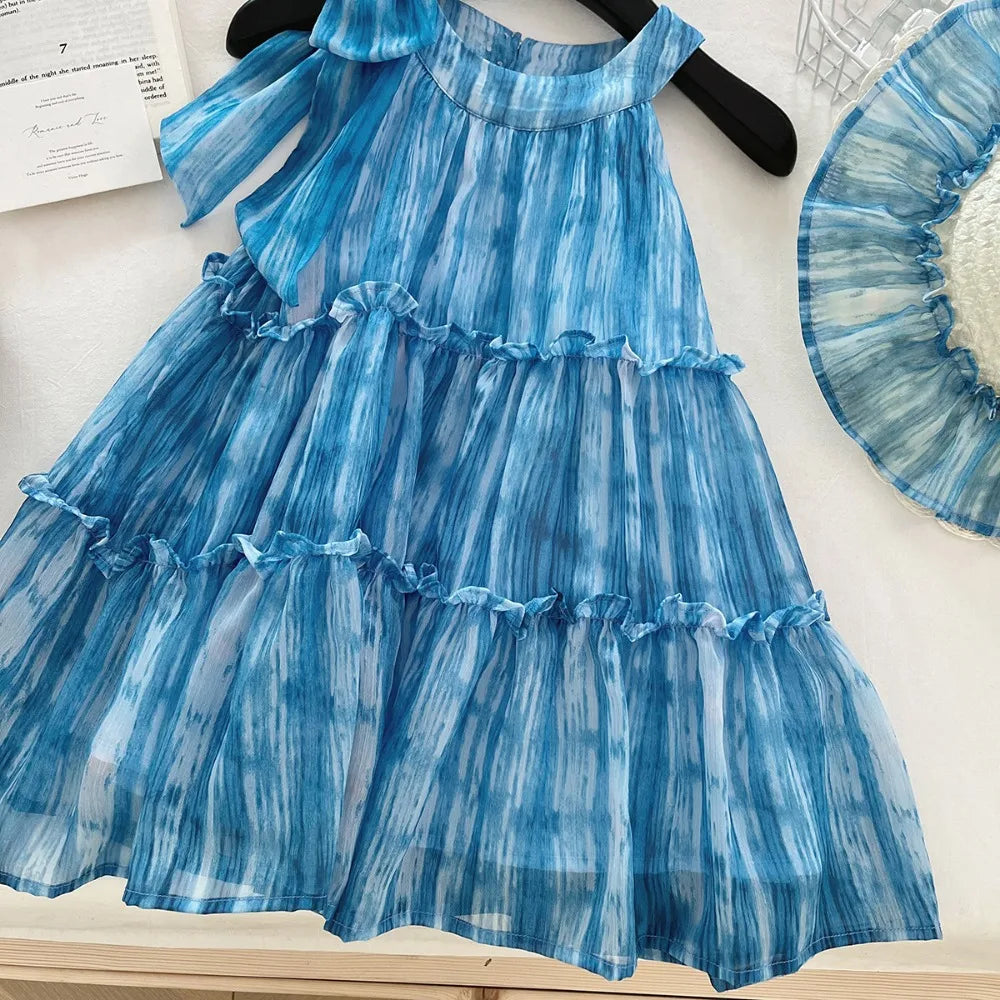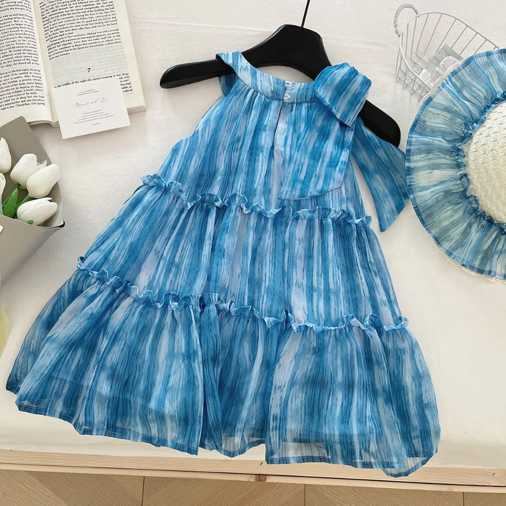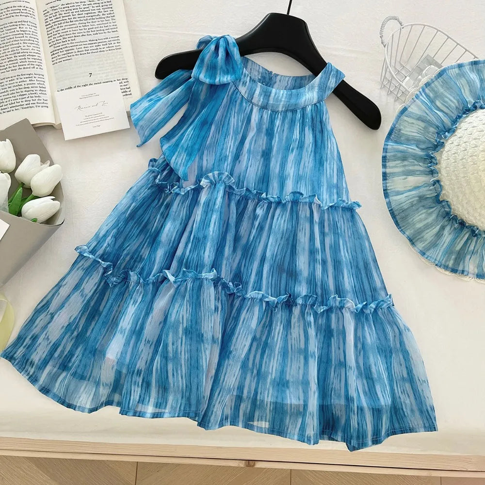 Girl's Summer Casual Round Neck Sleeveless 3D Bow Pleated A-line Dress 4-7 Years Old