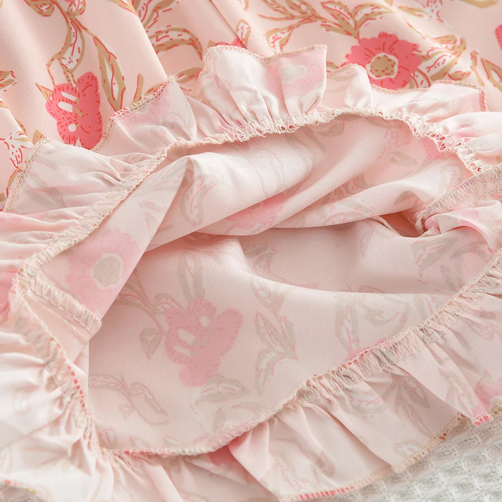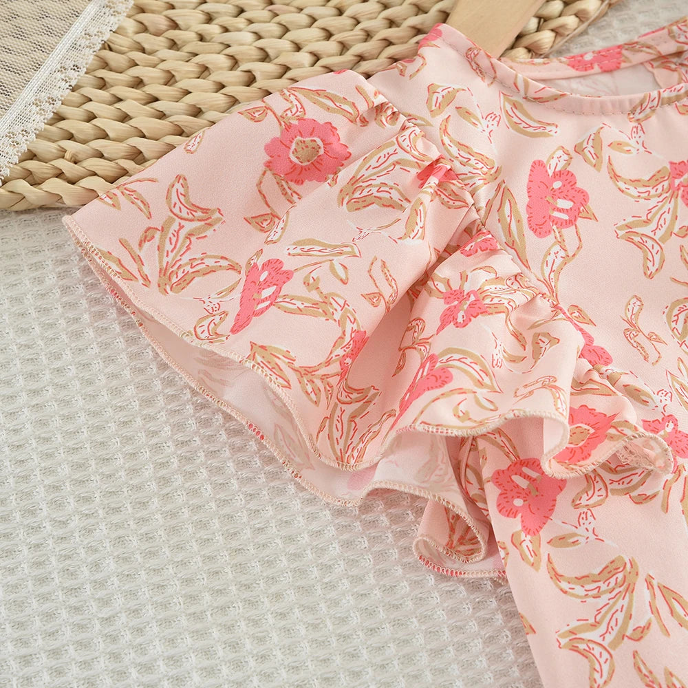 Girl's Summer Round Neck Flying Sleeve Printed Top+lace Shorts Two-piece Set