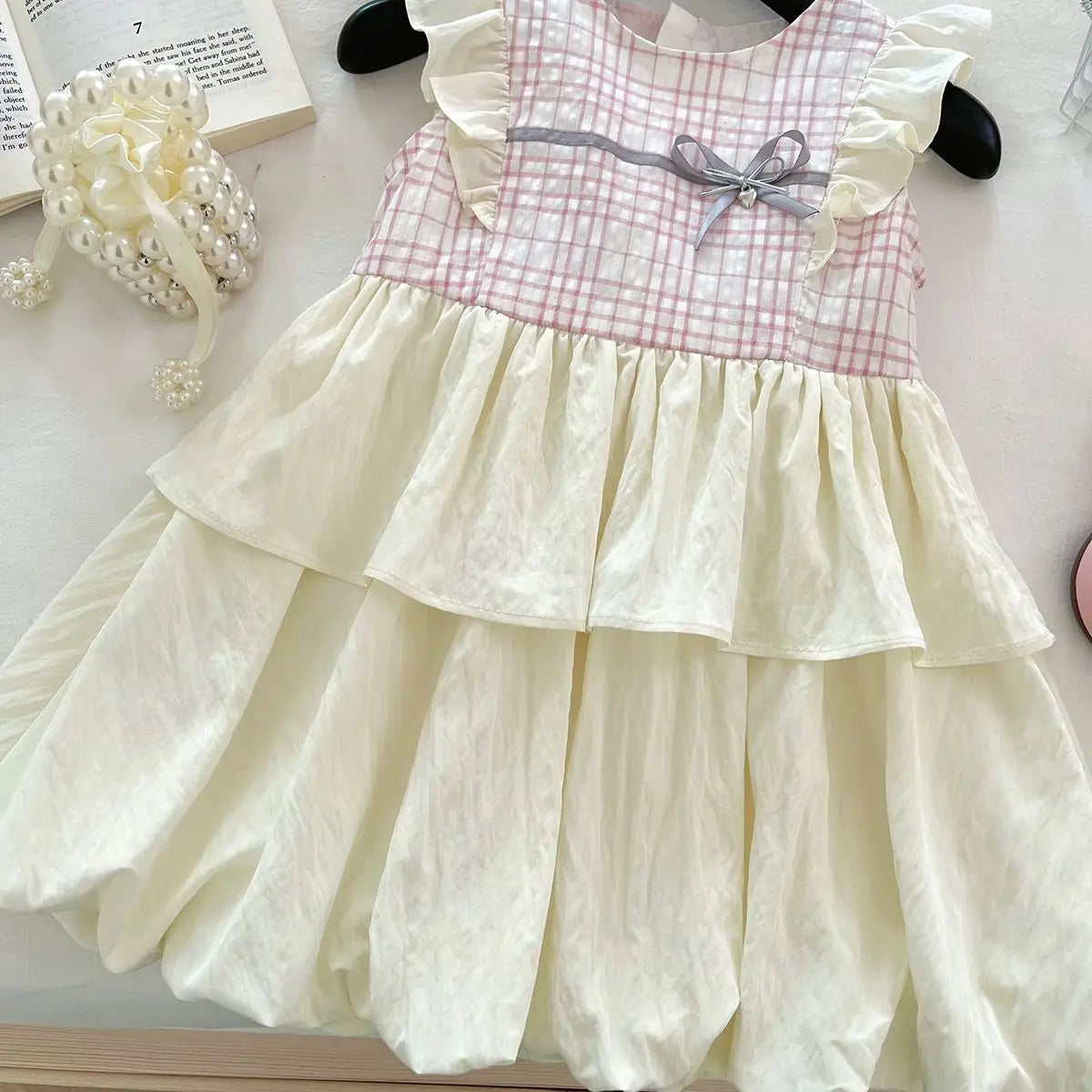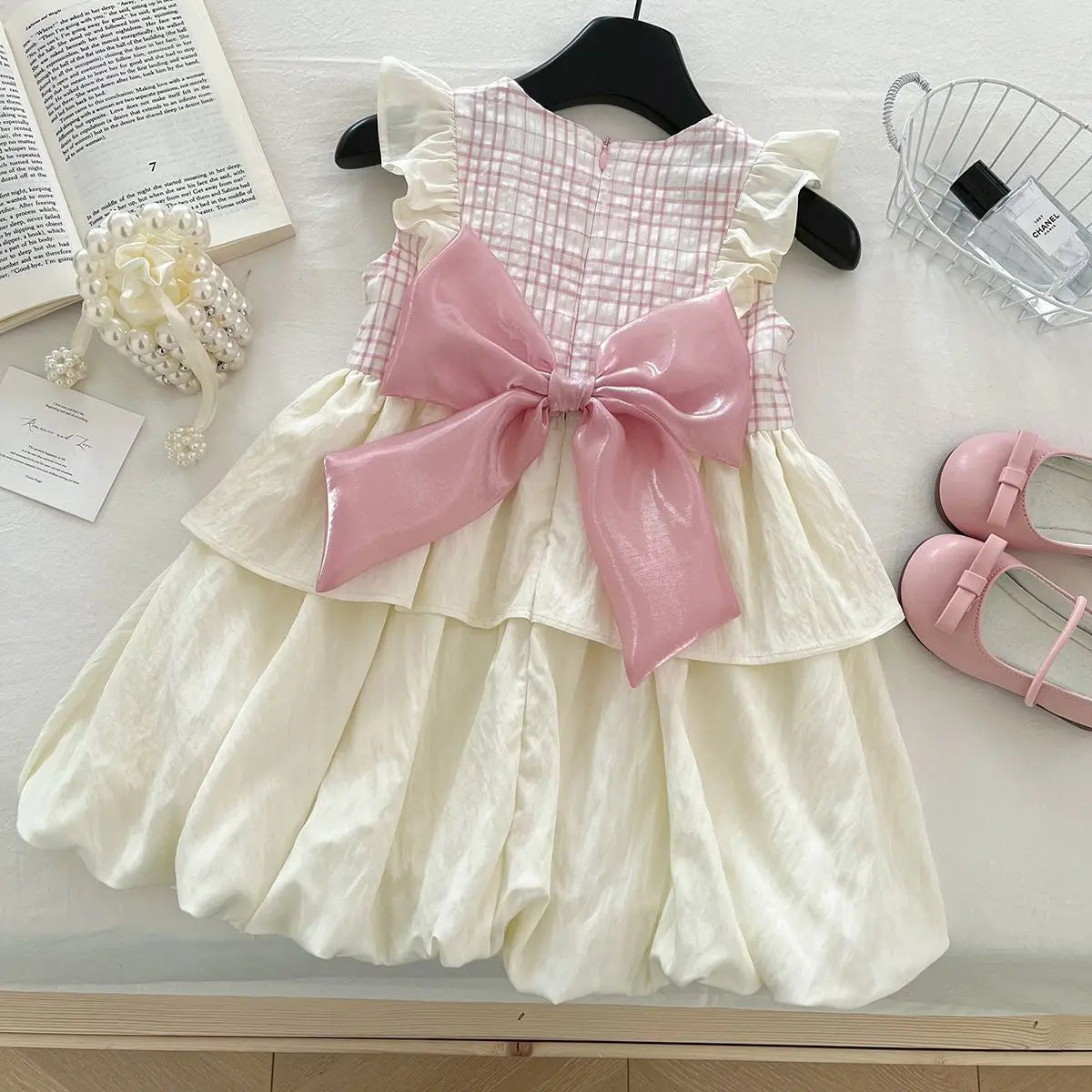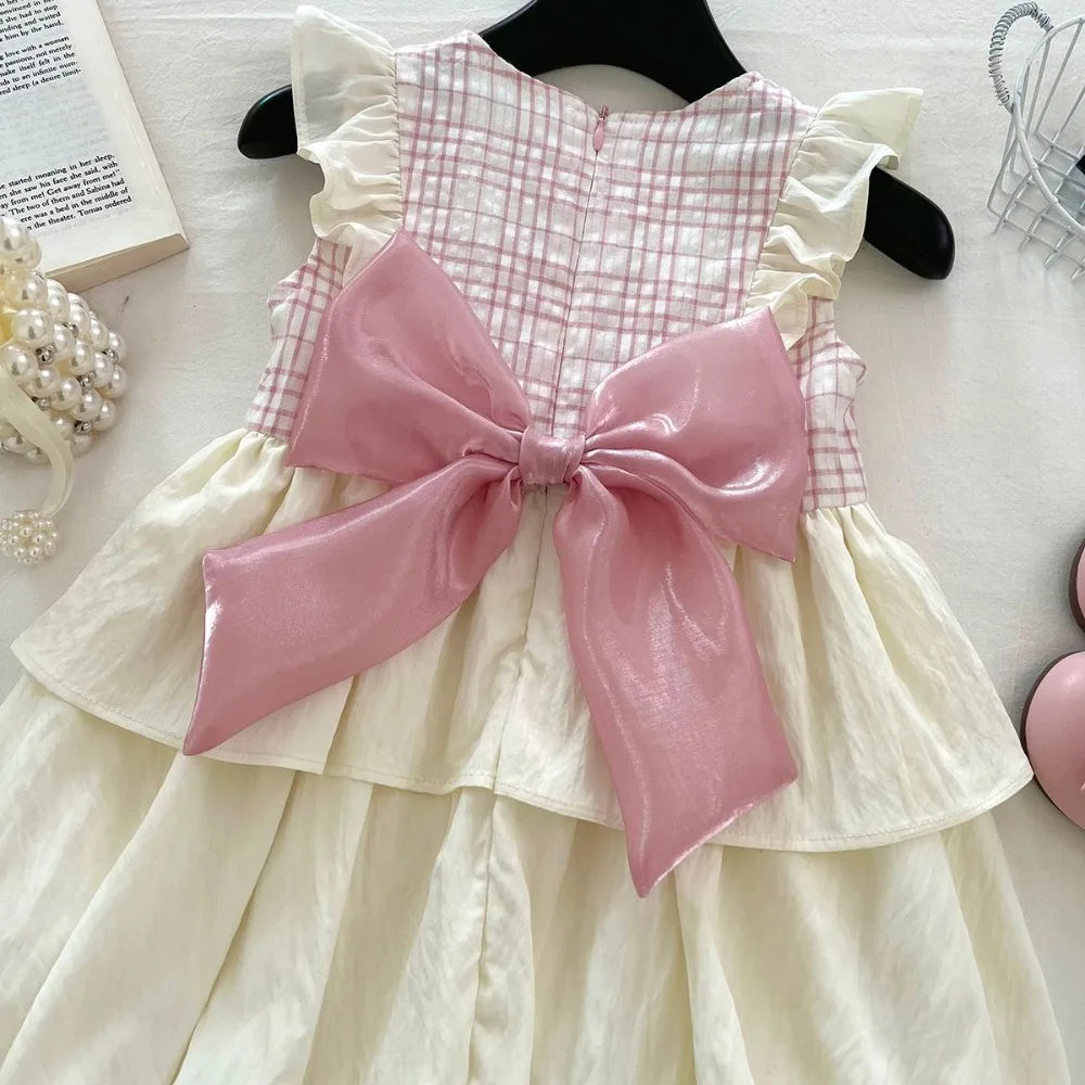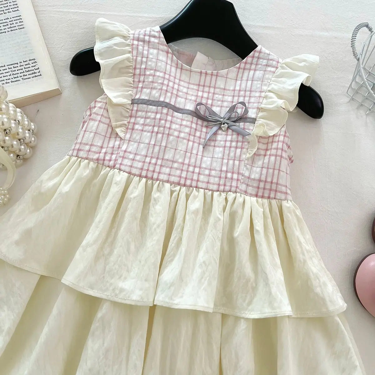 Girl's Summer Round Neck Flying Sleeve Bow Grid Splicing Dress 3-6 years
