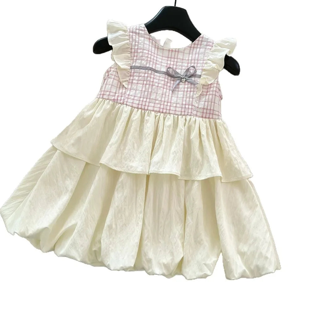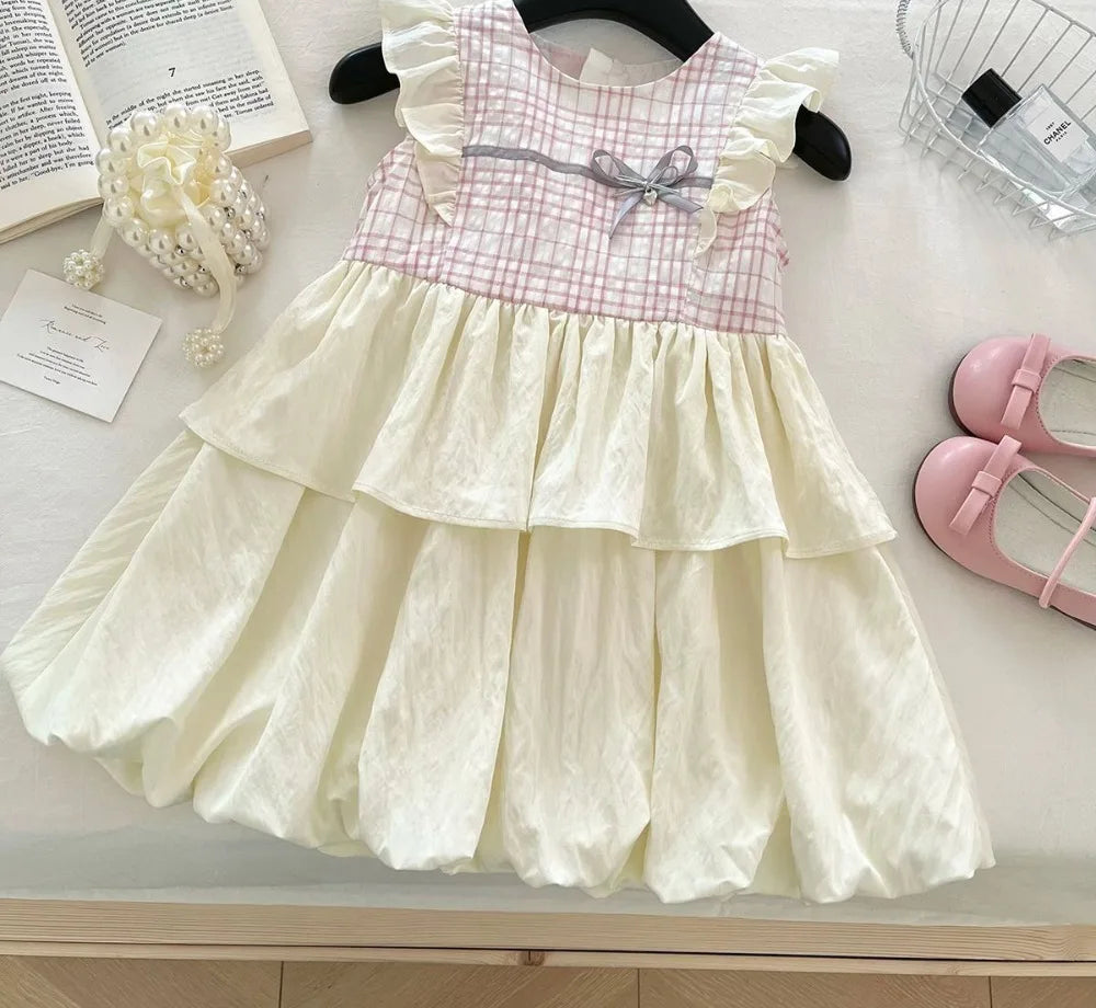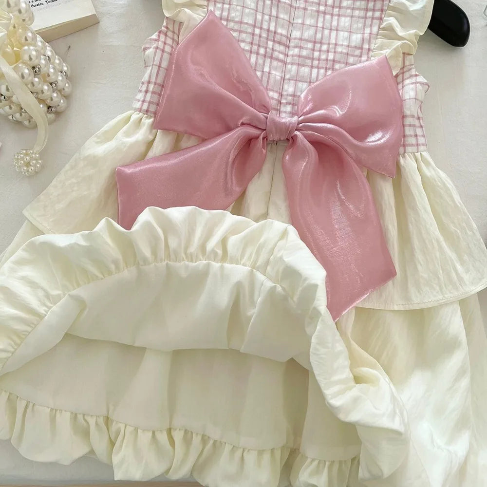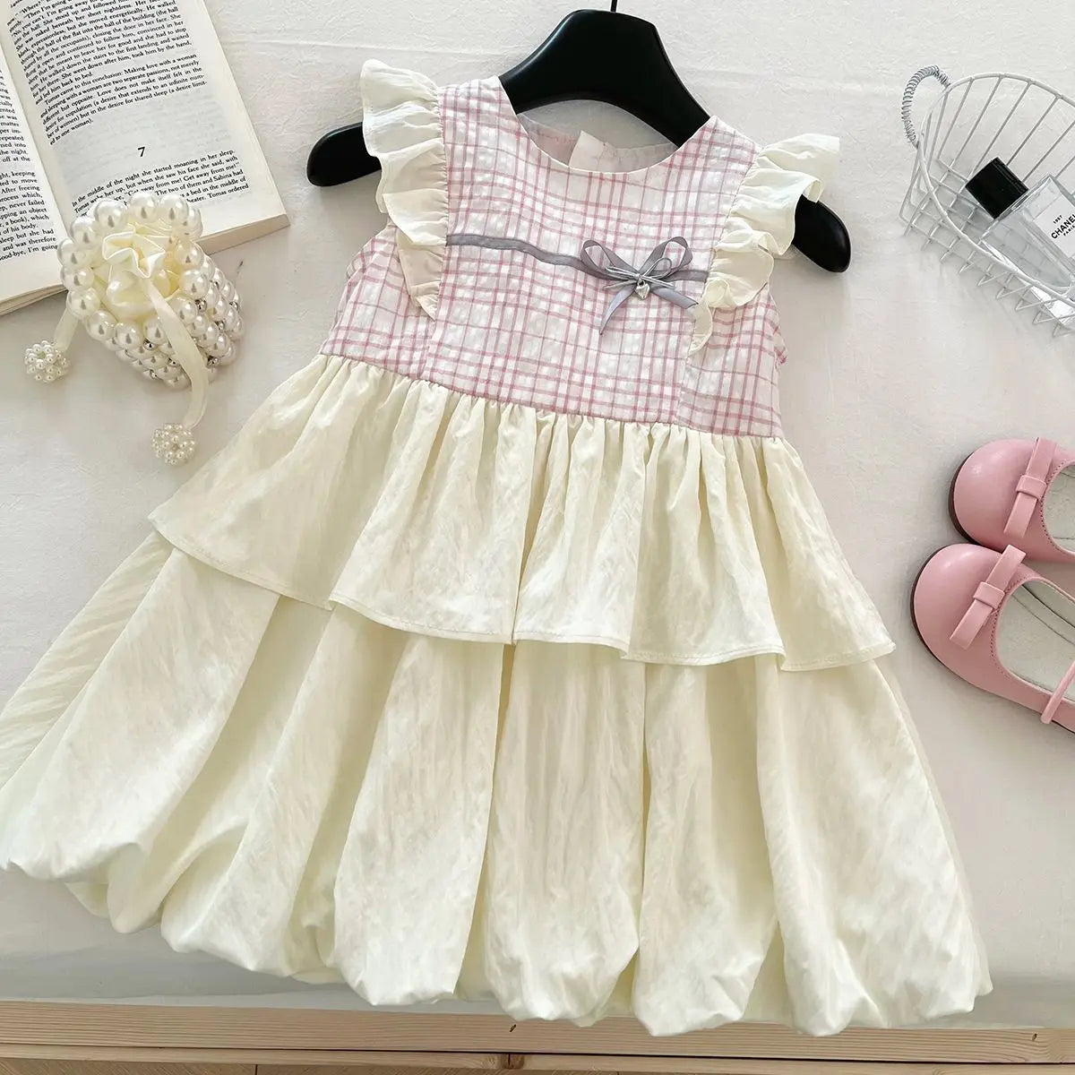 Girl's Summer Round Neck Flying Sleeve Bow Grid Splicing Dress 3-6 years