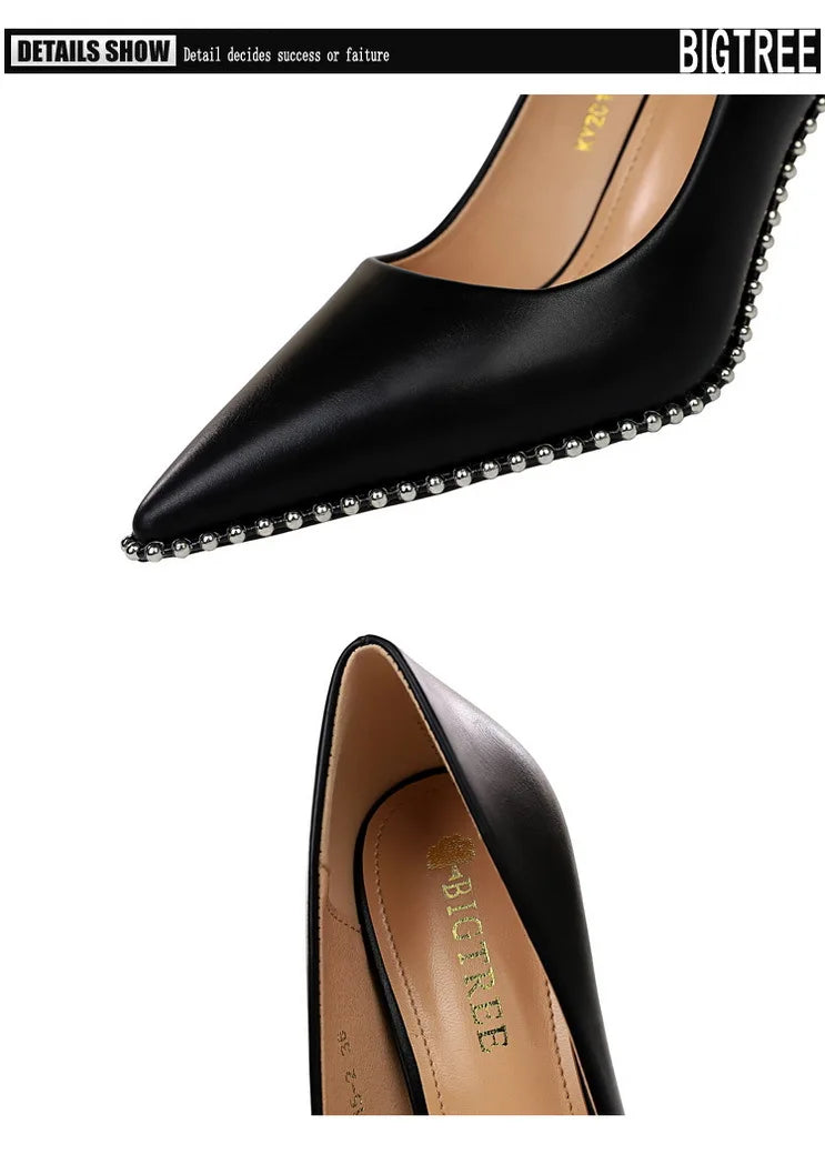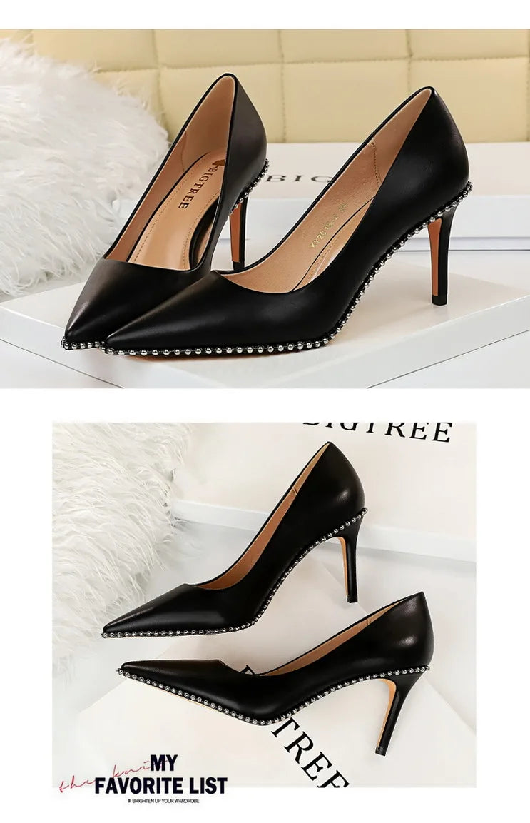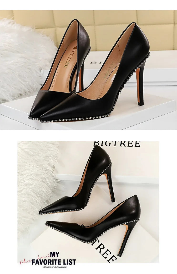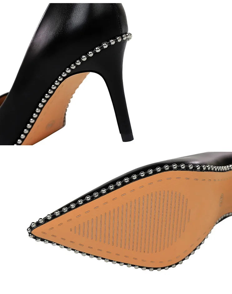 Women's Rivets String Bead PU Leather High Heels Shoes