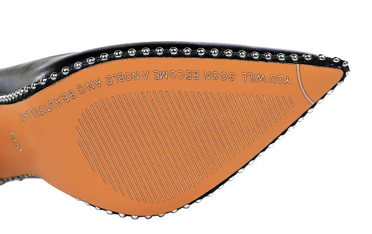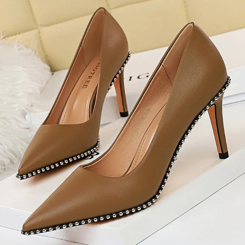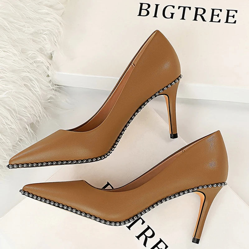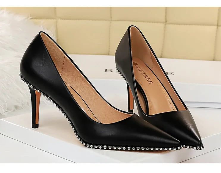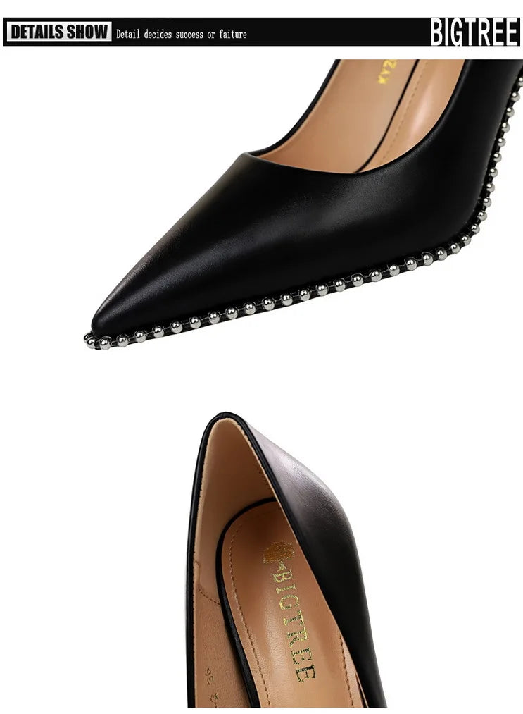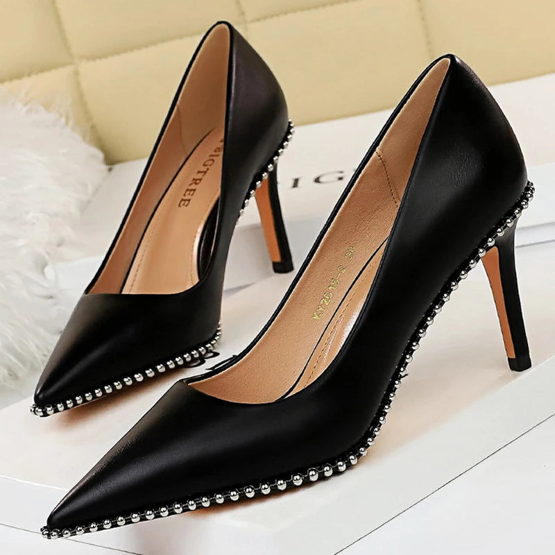 Women's Rivets String Bead PU Leather High Heels Shoes