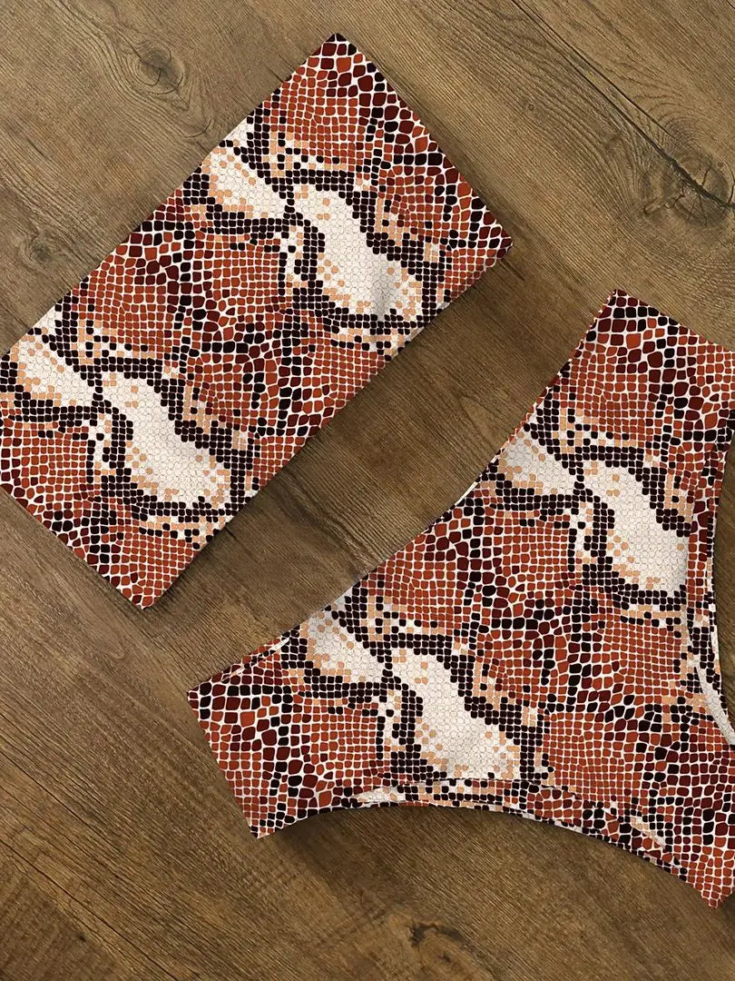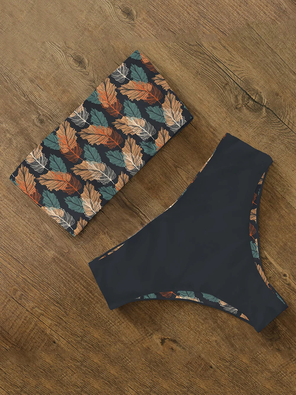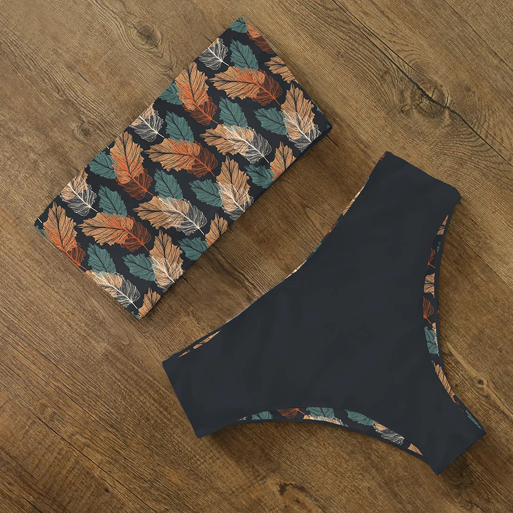 High Waist Bikini Set - Cross Back Bandeau Swimsuit with Print
