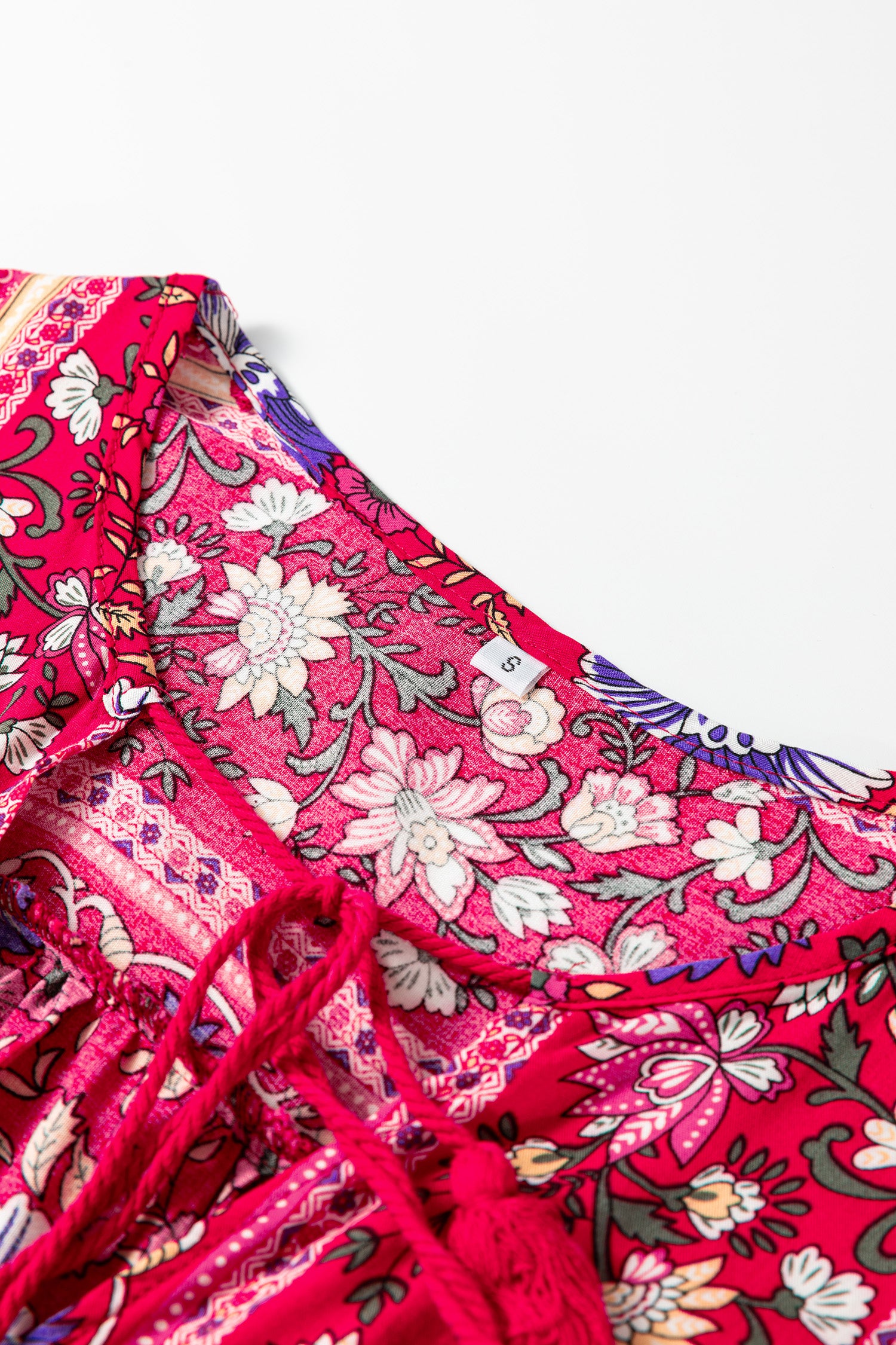 Embrace bohemian elegance with this beautiful floral print blouse featuring charming tassel tie front details. The flowing long sleeves and vibrant blue floral pattern create a romantic, free-spirited look that's perfect for any occasion.