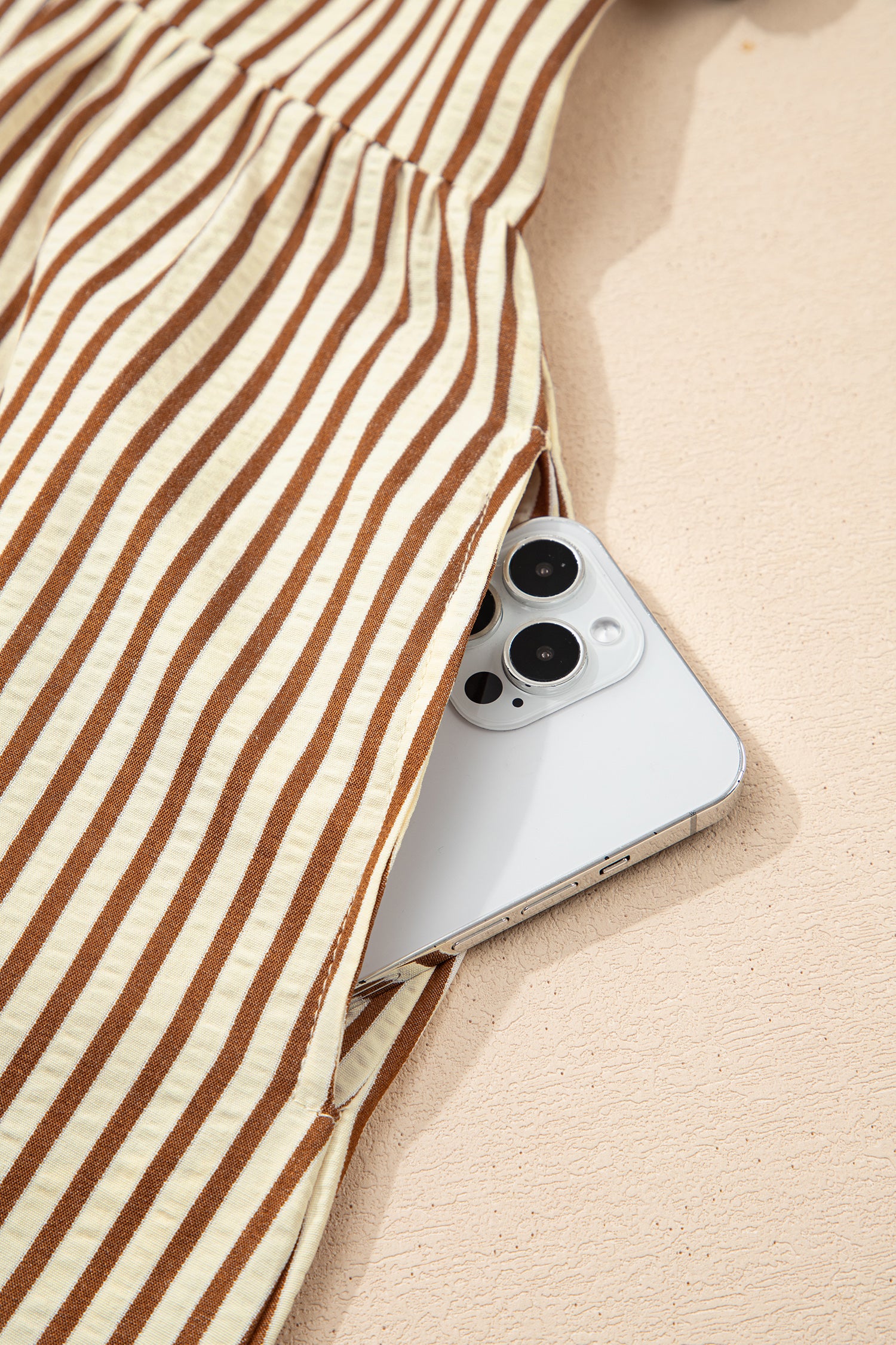 Make a statement in this beautifully detailed brown stripe midi dress featuring charming double ruffled accents and elegant contrast trim. The flattering V-neckline and short sleeves create a feminine silhouette perfect for warm weather occasions.