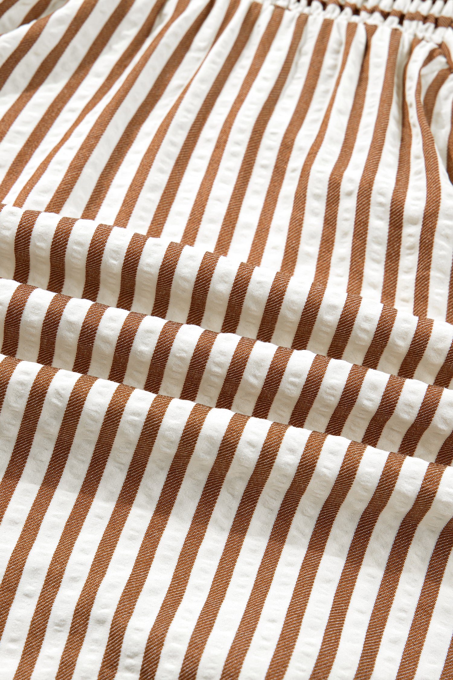Add a touch of romantic charm to your wardrobe with this delightful striped blouse featuring elegant shirred detailing, a flattering V-neckline, and adorable short puff sleeves. The beautiful brown stripe pattern and feminine silhouette create a versatile piece that's perfect for both casual and dressy occasions.
