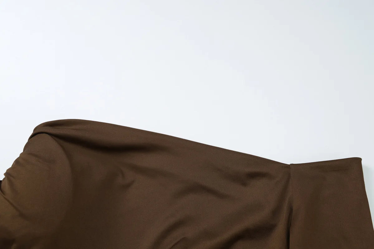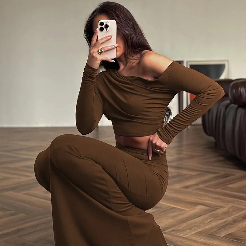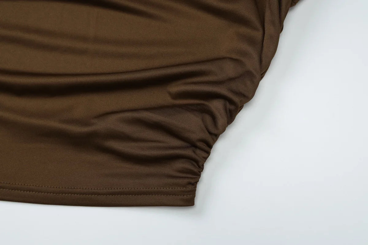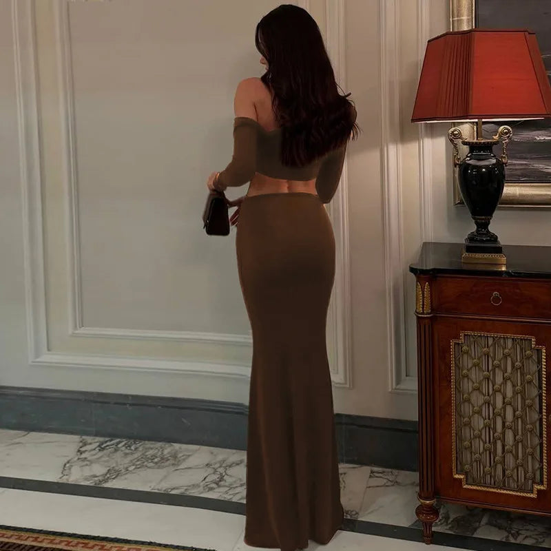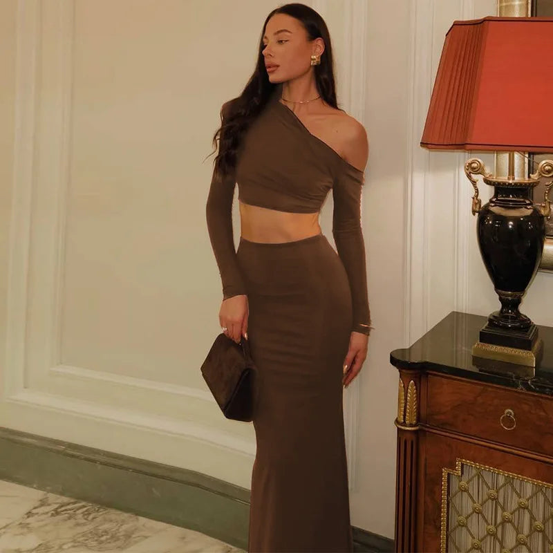 Turn heads with this stunning 2-piece dress set featuring an asymmetrical ruched top and flowing maxi skirt. Perfect for creating sophisticated club outfits and elegant evening looks with a flattering bodycon fit.