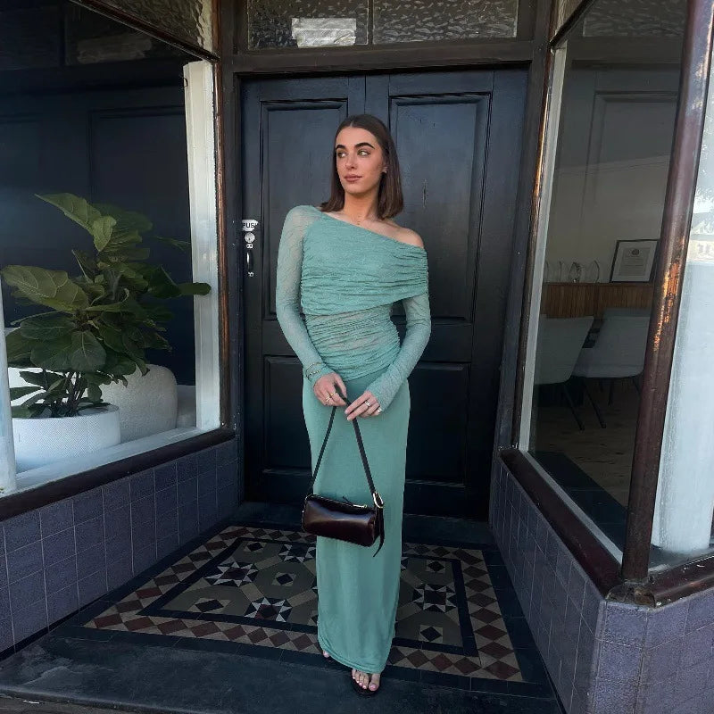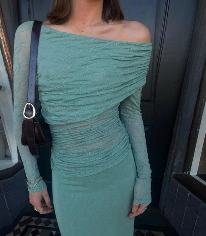 Elevate your autumn wardrobe with this sophisticated textured asymmetrical top. Featuring elegant ruched detailing and a flattering cropped silhouette, this long sleeve top is perfect for creating chic, contemporary outfits.