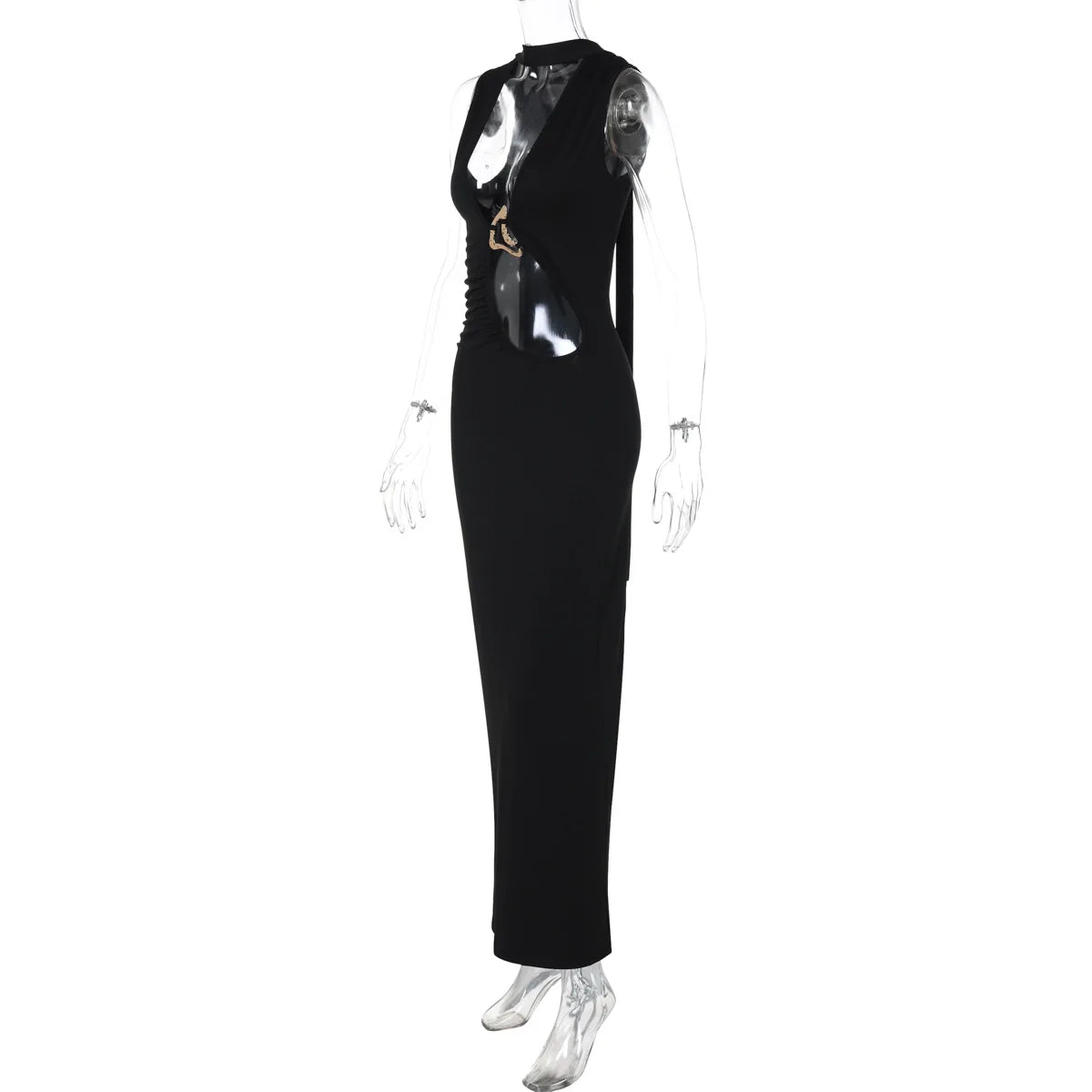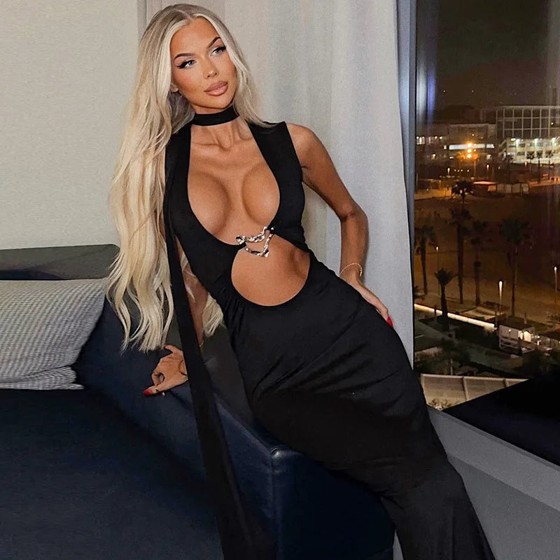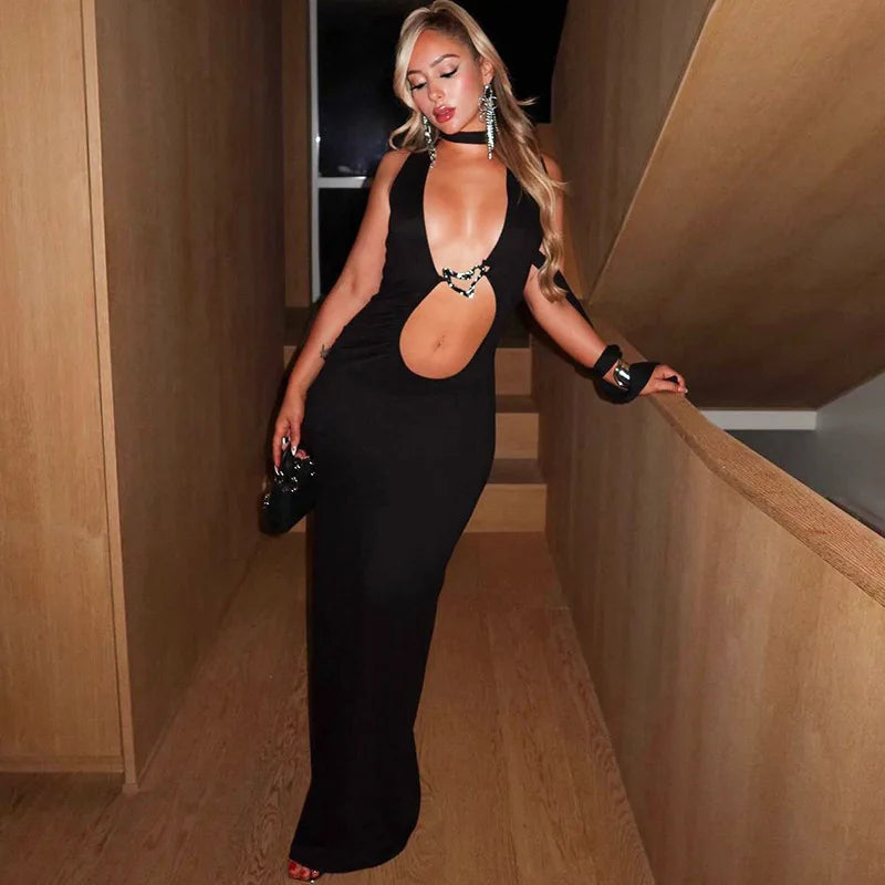 Women's Embellished Plunge Halter V Neck Maxi Outfit Club Party Cut Out Bodycon Dress