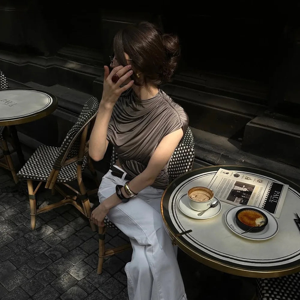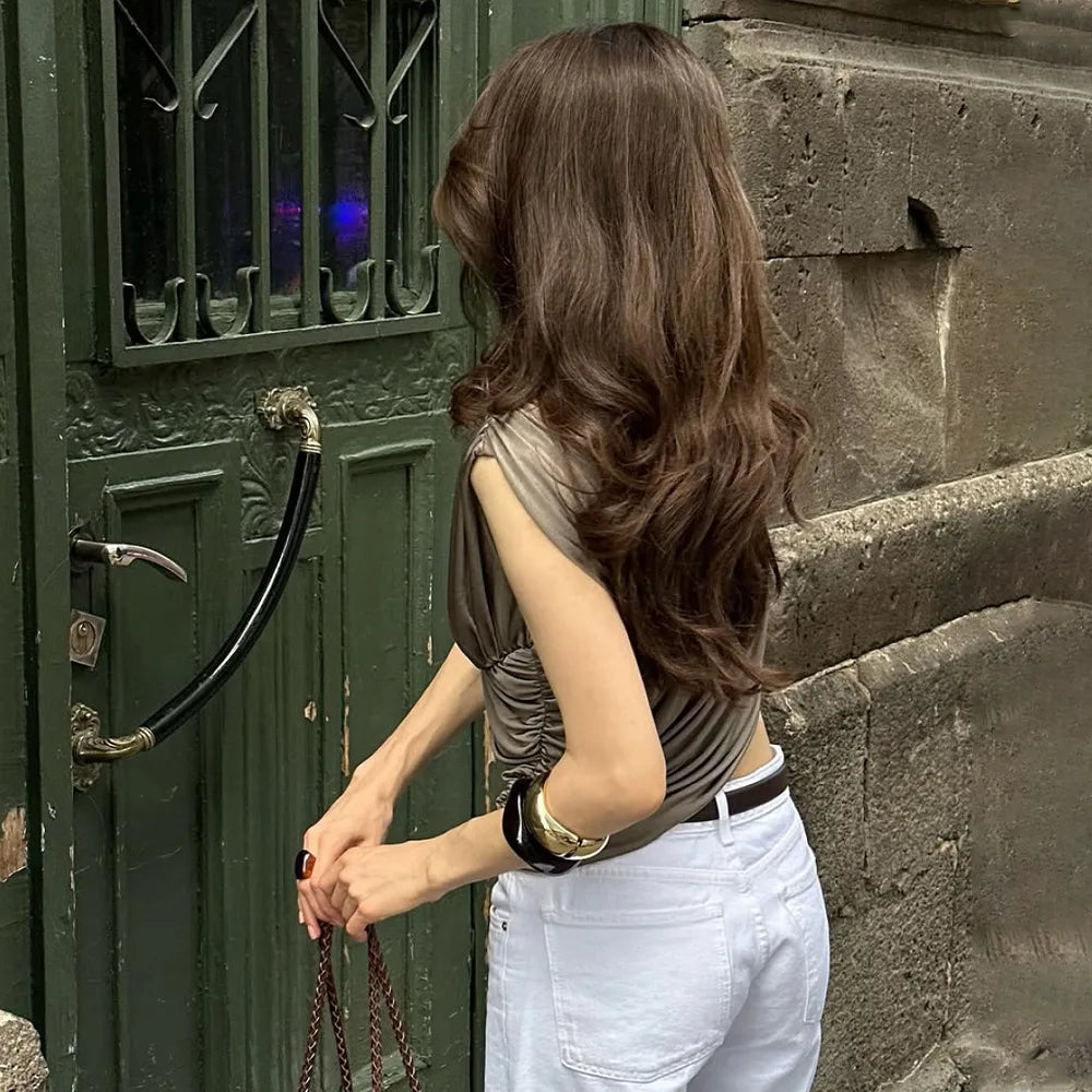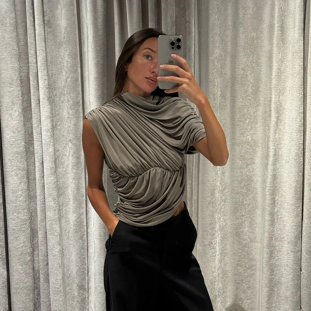 Elevate your summer wardrobe with this chic sleeveless top that combines modern asymmetrical design with flattering ruched detailing.
