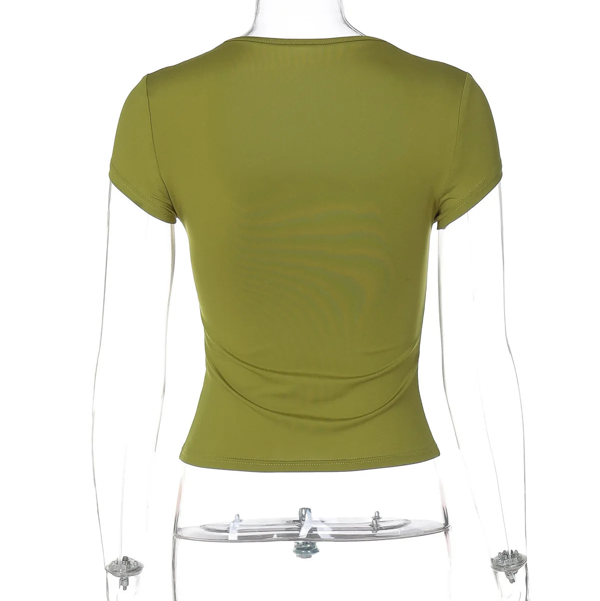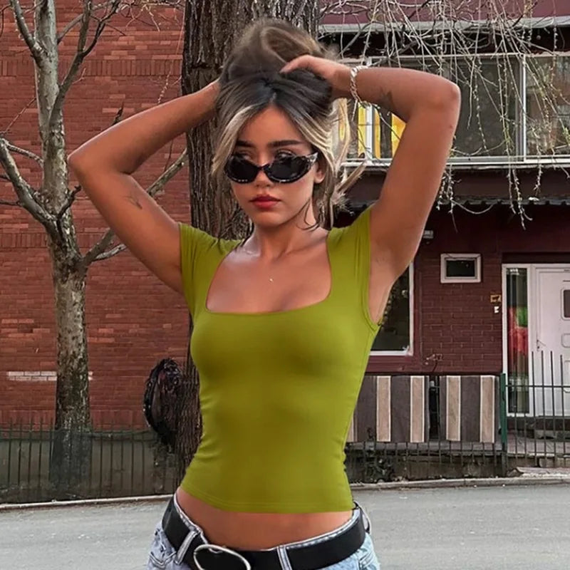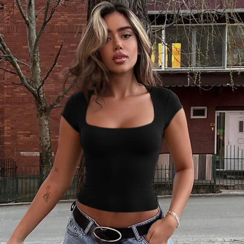 Channel authentic Y2K vibes with this trendy square collar cropped top. Perfect for club outfits and casual summer styling, this short sleeve slim fit tee combines retro charm with modern edge for an effortlessly cool look.
