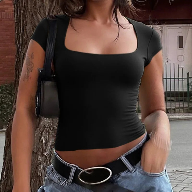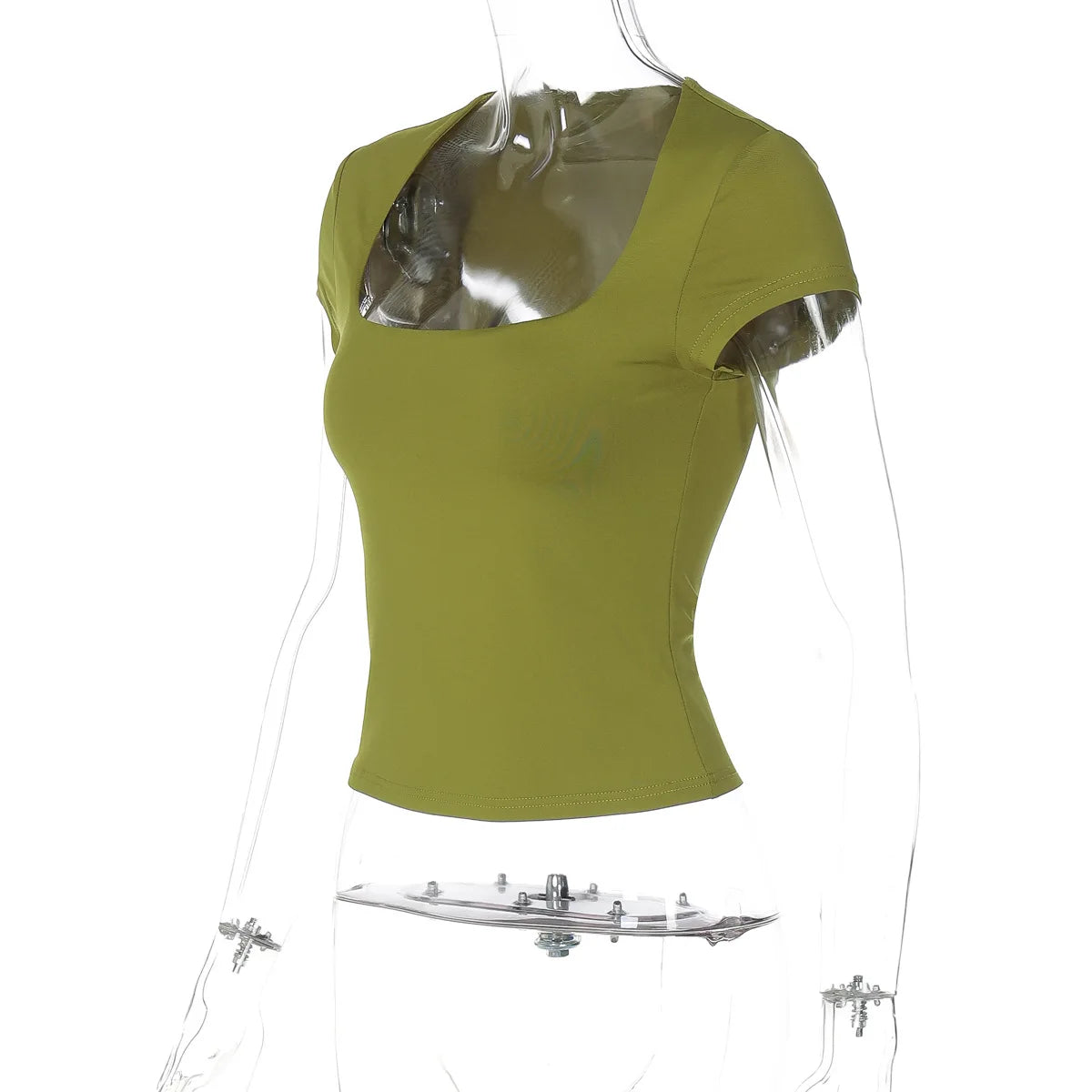 Women's Y2K Square Collar Cropped Top - Short Sleeve Slim Fit Summer Tee