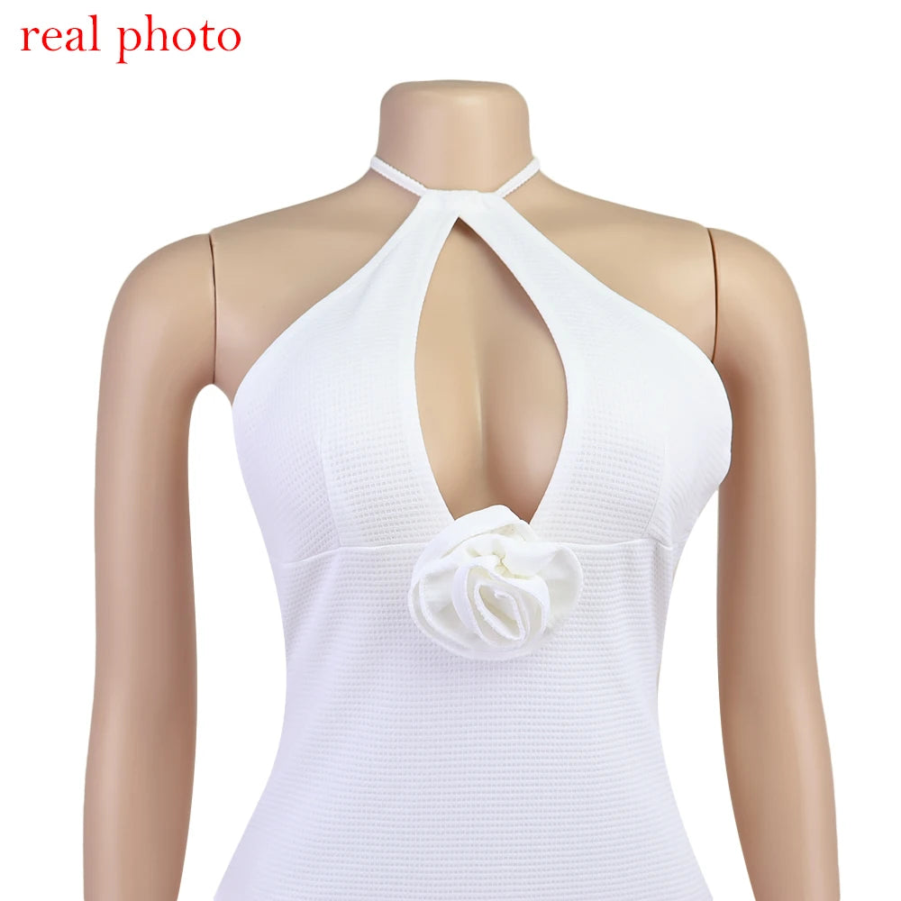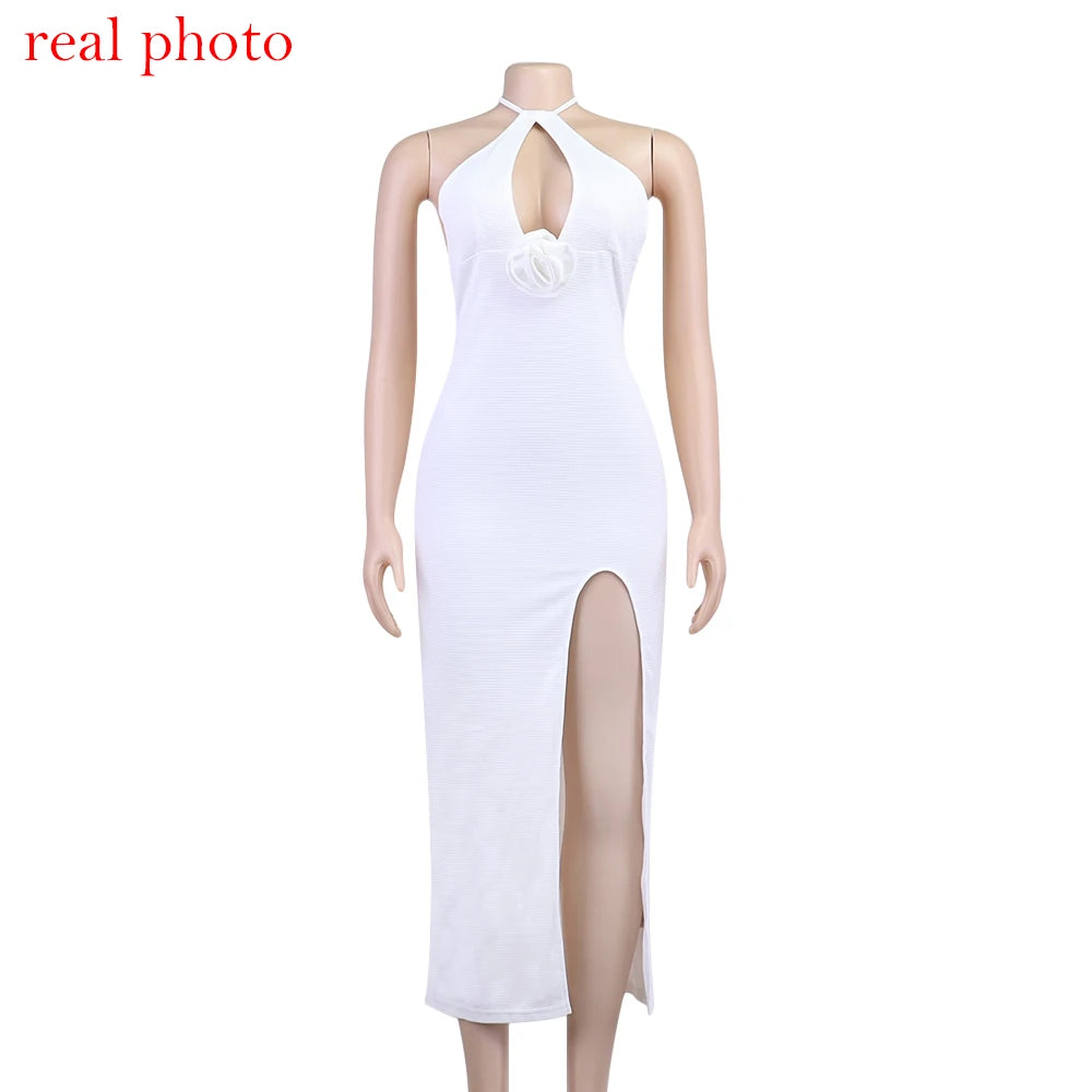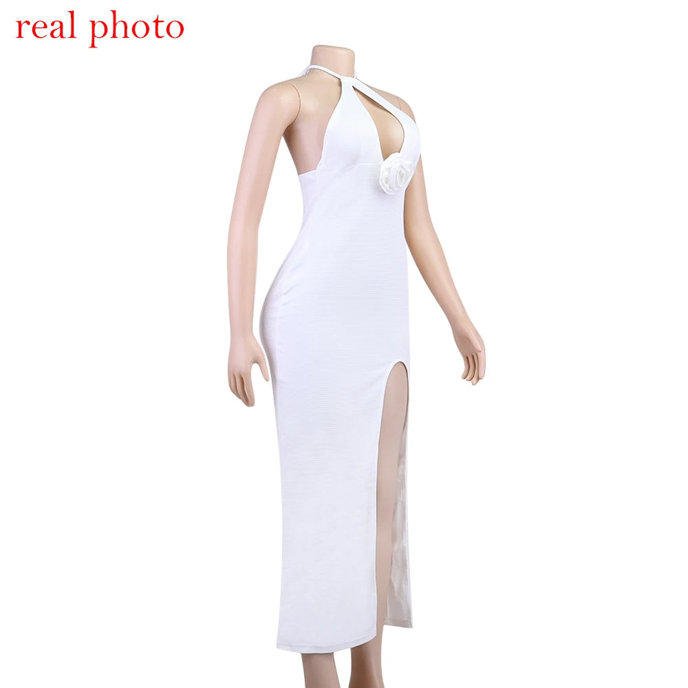 Women's Floral Applique Halter Summer Maxi Cut Out Backless Split Dress